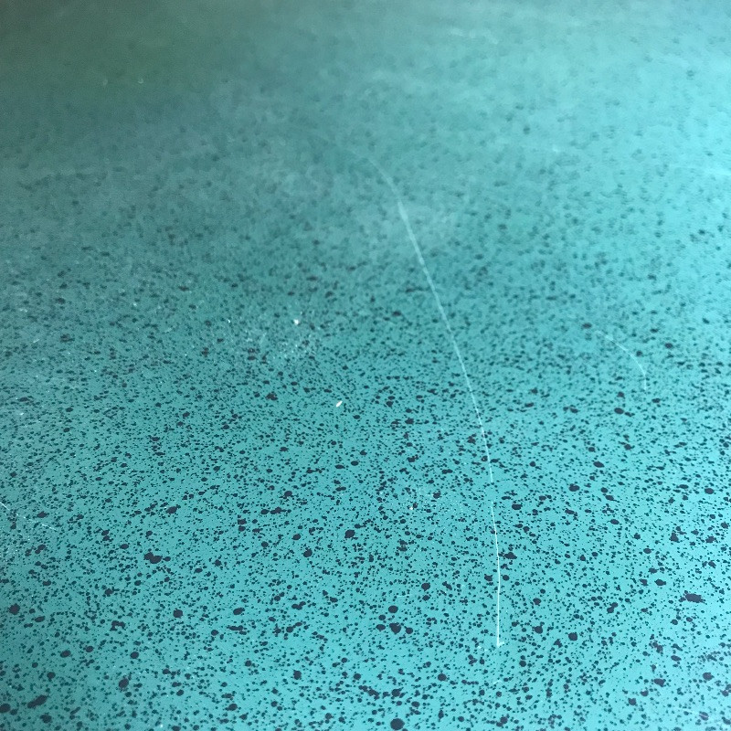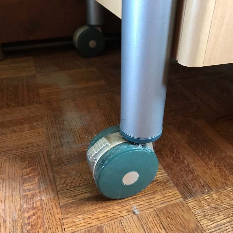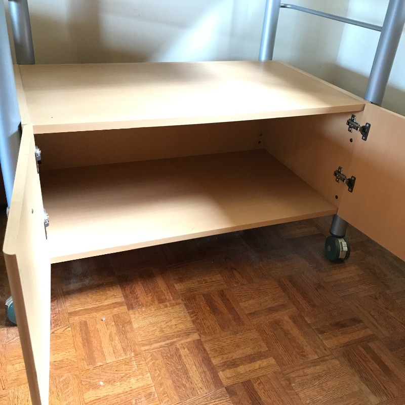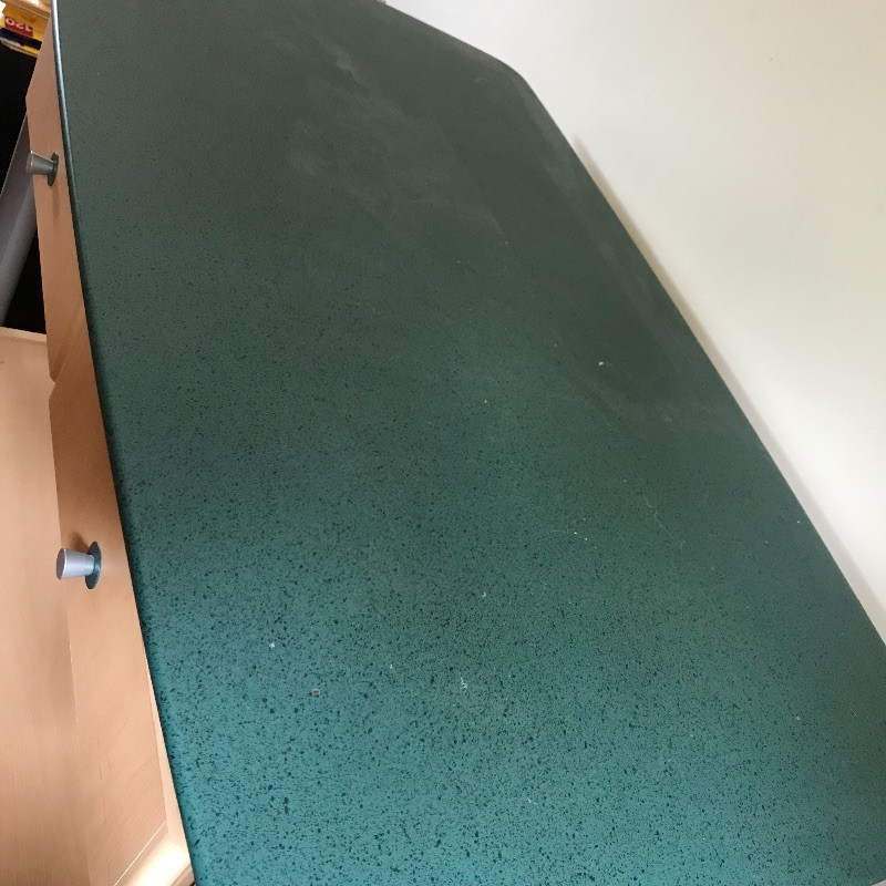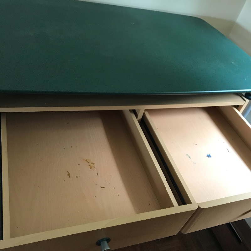 This stylish modern piece comes with a green laminate style top wth subtle green accents. The drawers and cabinet appear to have a light wood laminate. Outher than a small scratch on the top surface, the piece is in great shape. Some scuffing noticed on the right drawer appears to be easily fixed by being cleaned. This piece moves very easily on its modern caster style wheels and looks good from any angle. Piece measures approximately 44” x 26” x 44”. Also take a look at the matching desk in lot 6!
