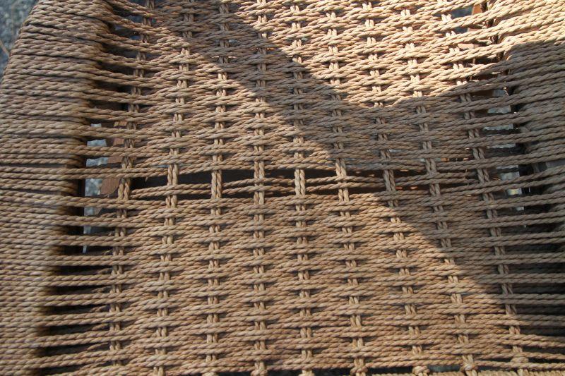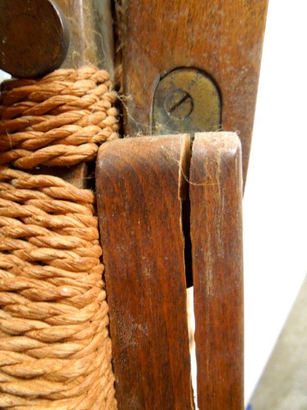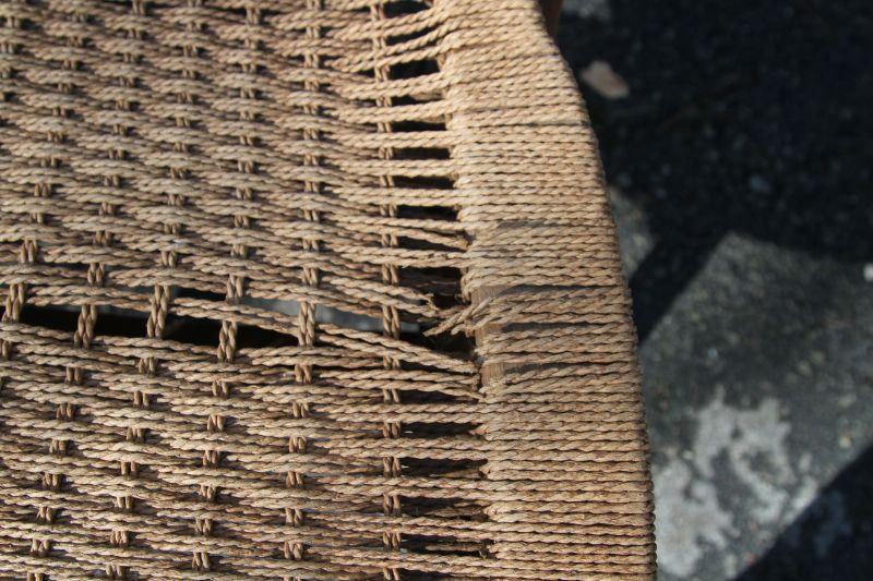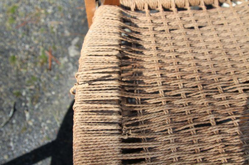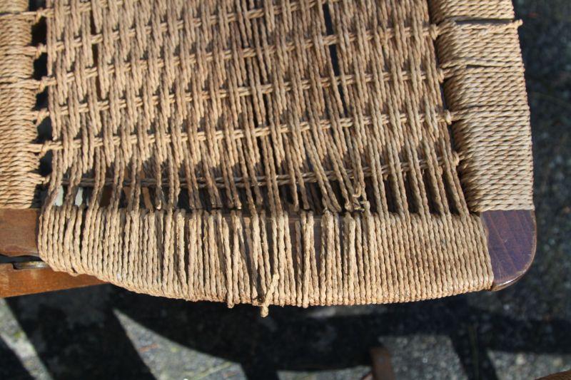 The frame is stained hard wood. The caning for the seat and chair back is made of sturdy woven rolled paper rope rush. Brass hardware.