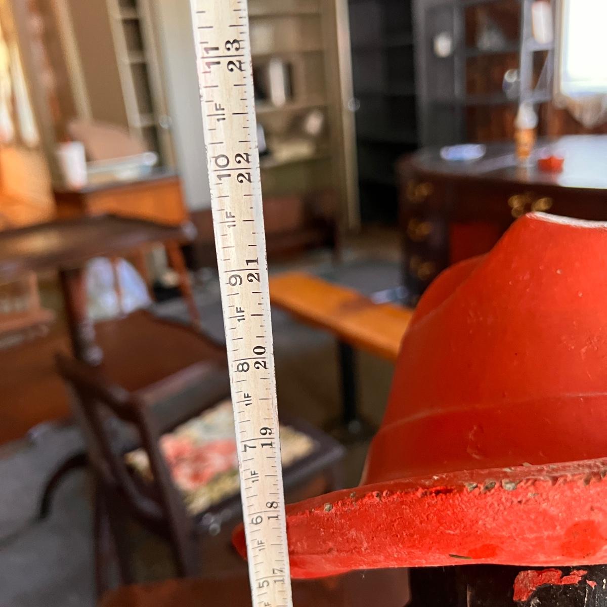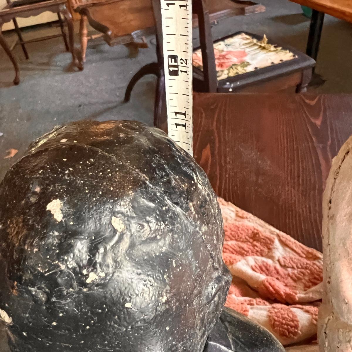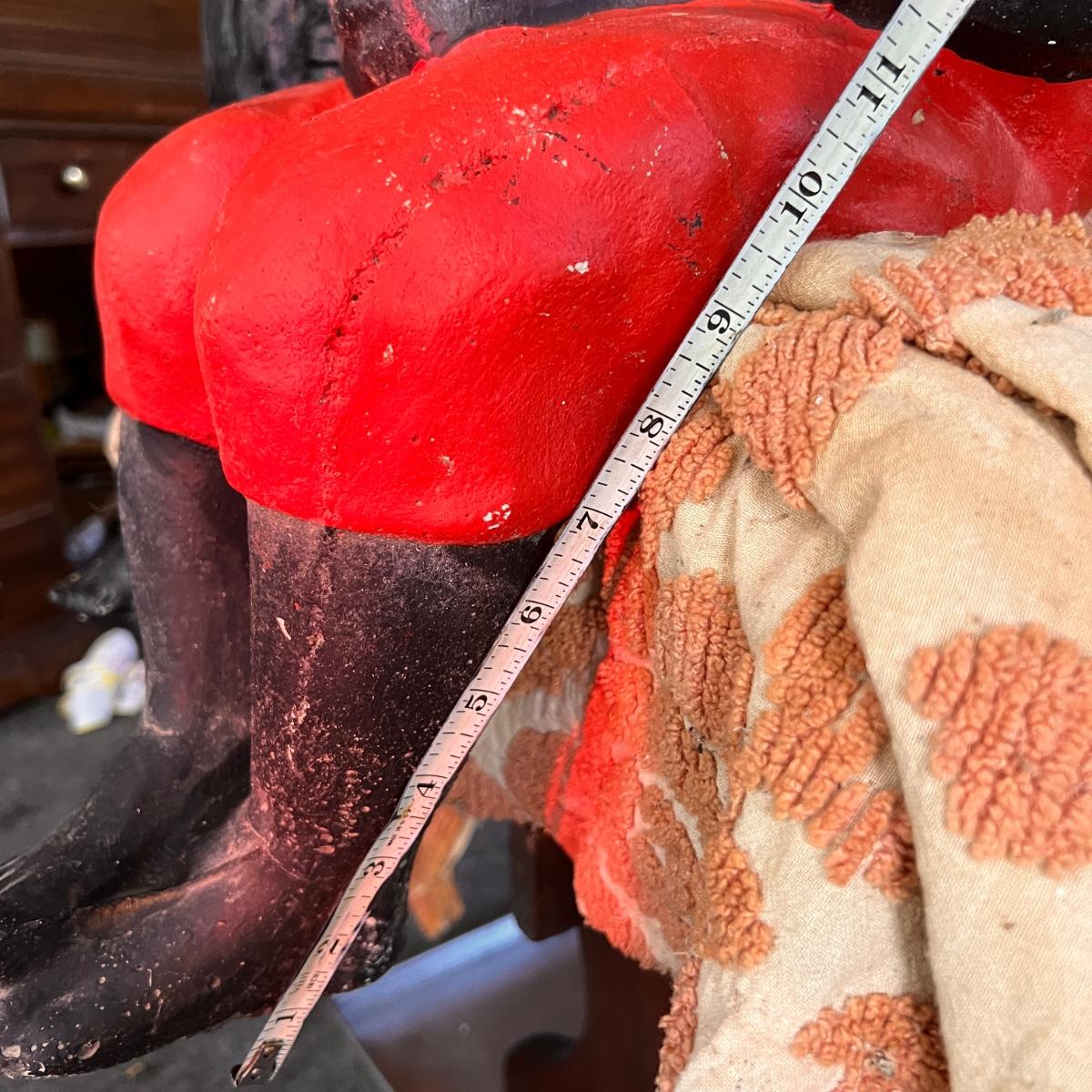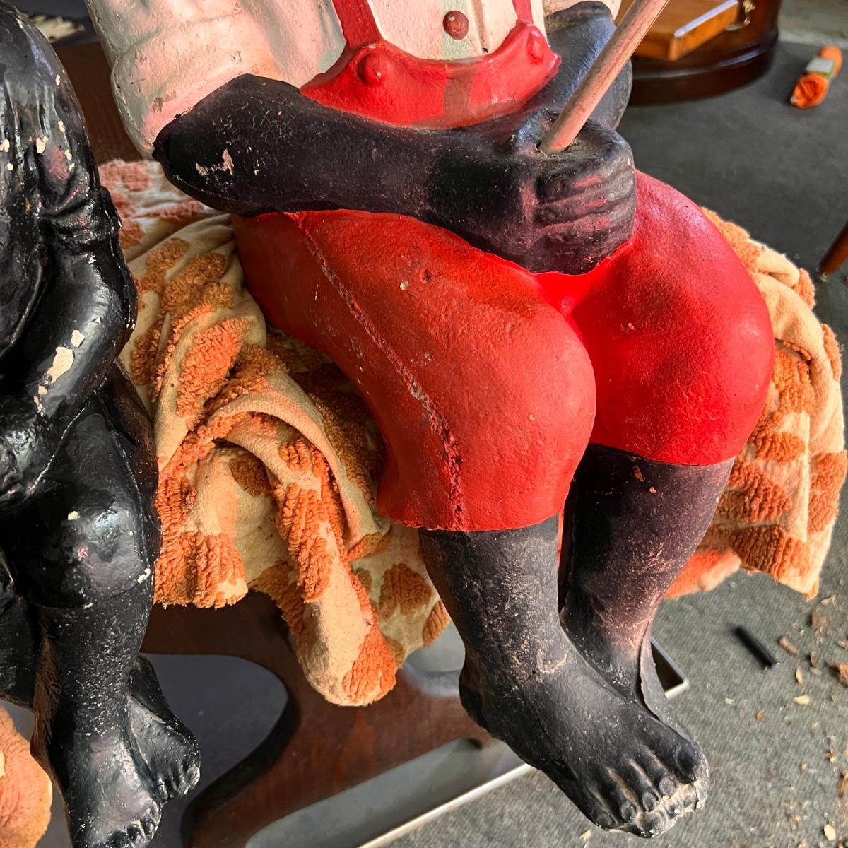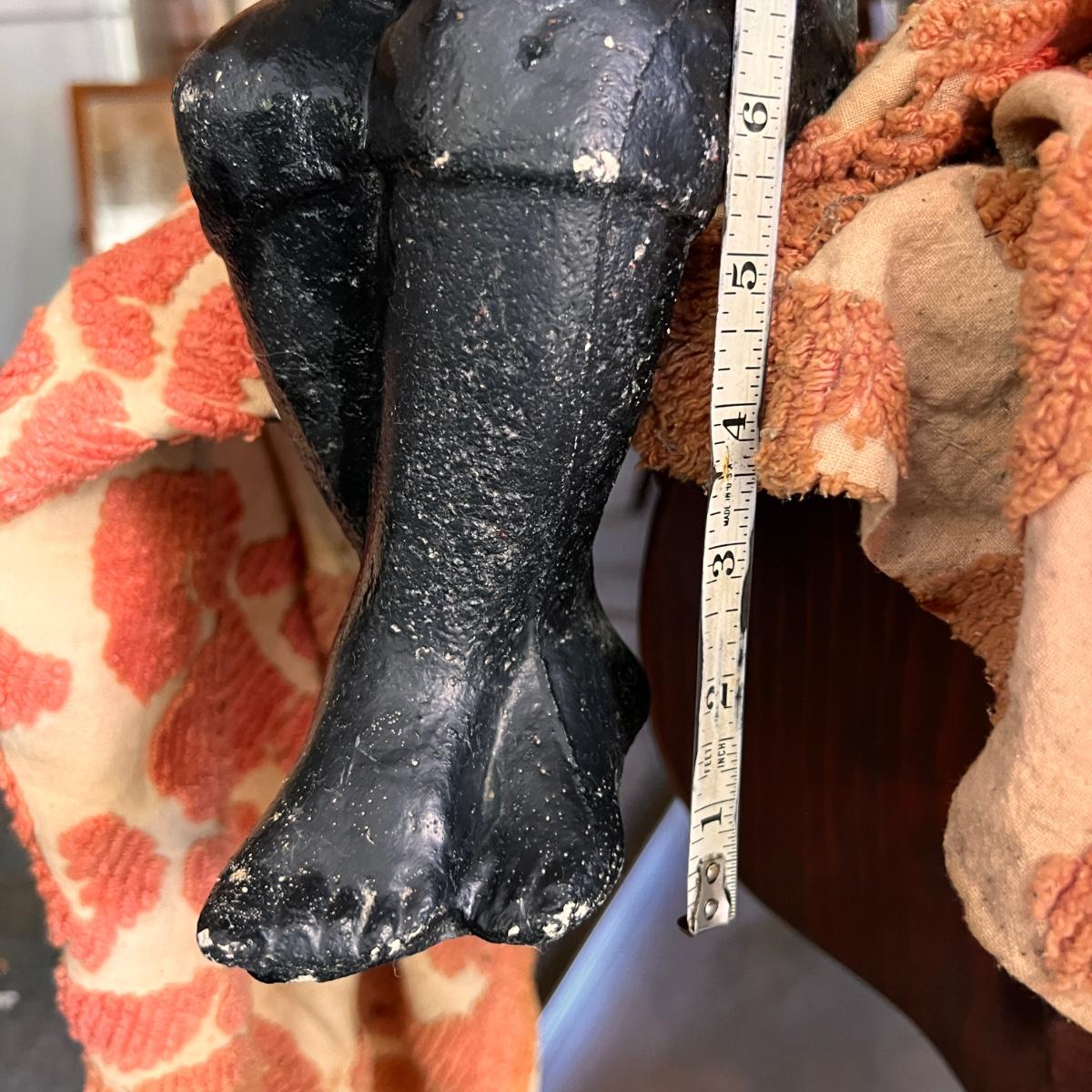 These statues are EXTREMELY heavy. Be prepared to have help at pick up. Conditions are as shown. See all pics. The fishing rod is bamboo and looks to be not the original. The larger statue is 22" from seat to top of hat. Legs are roughly 11". The hat comes off.