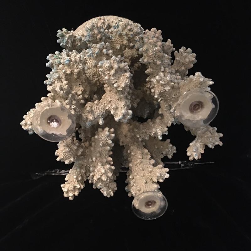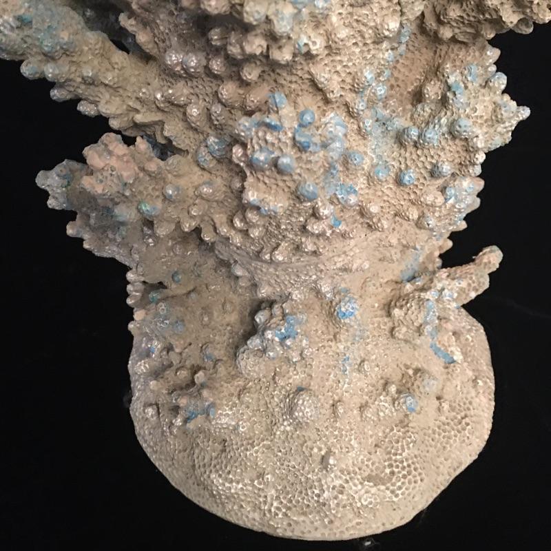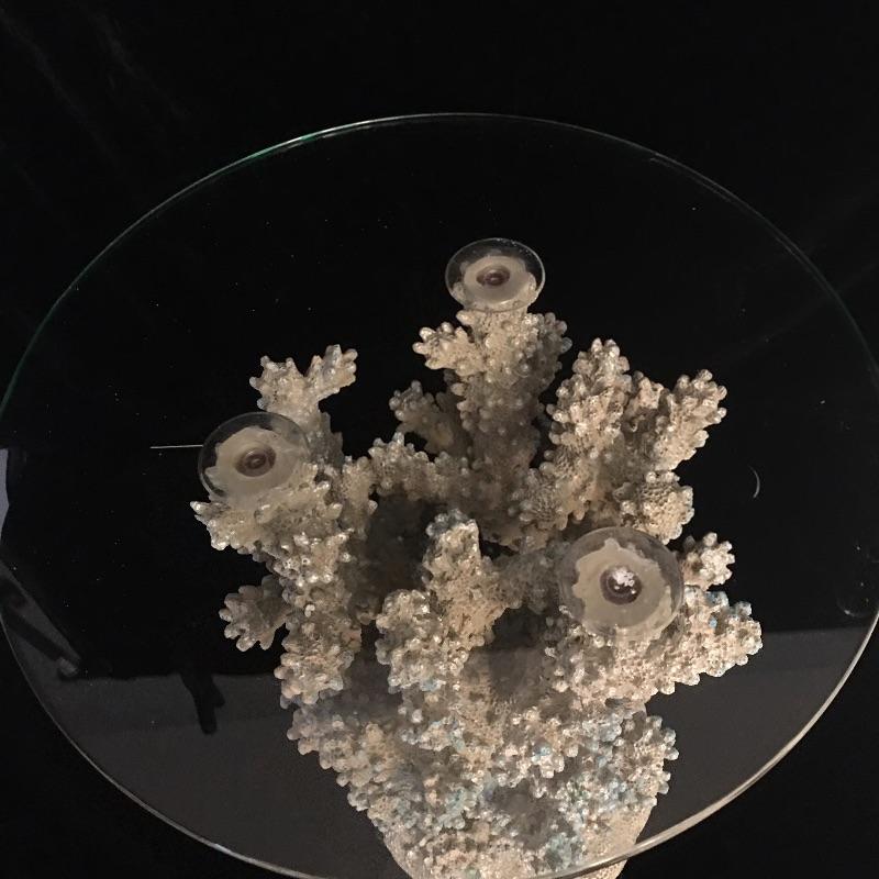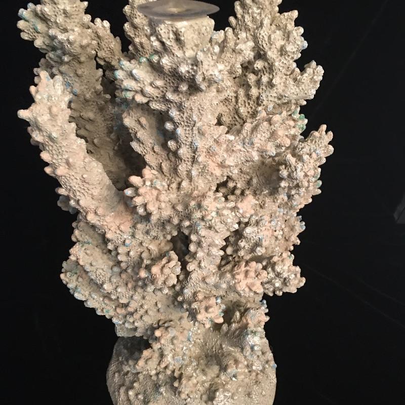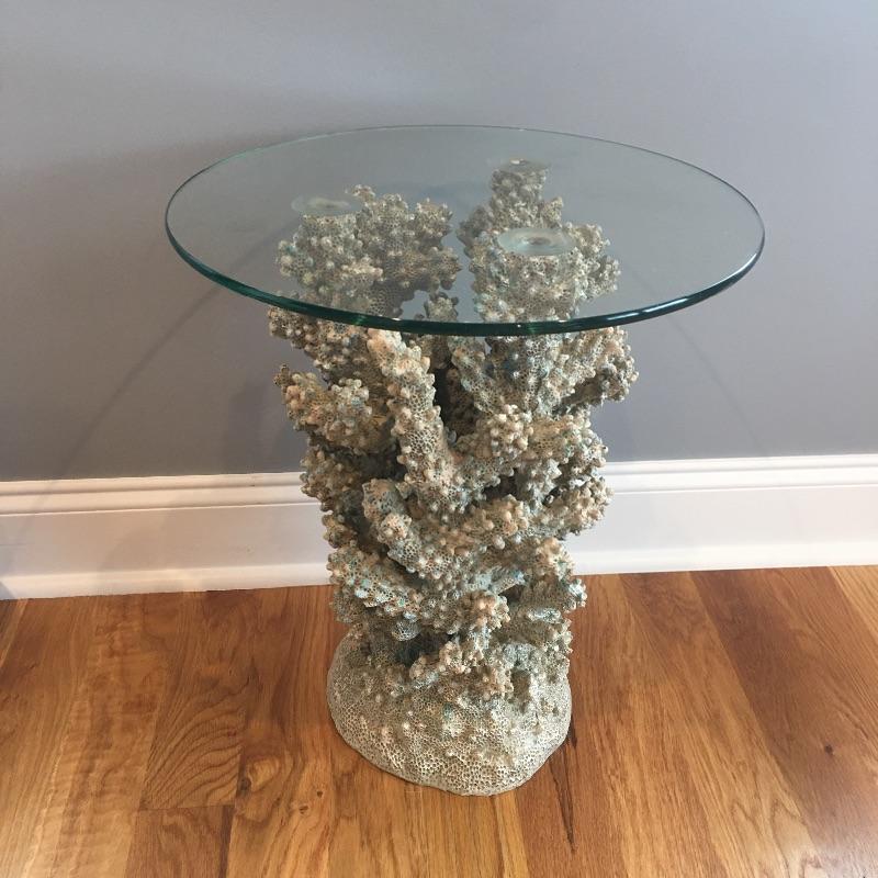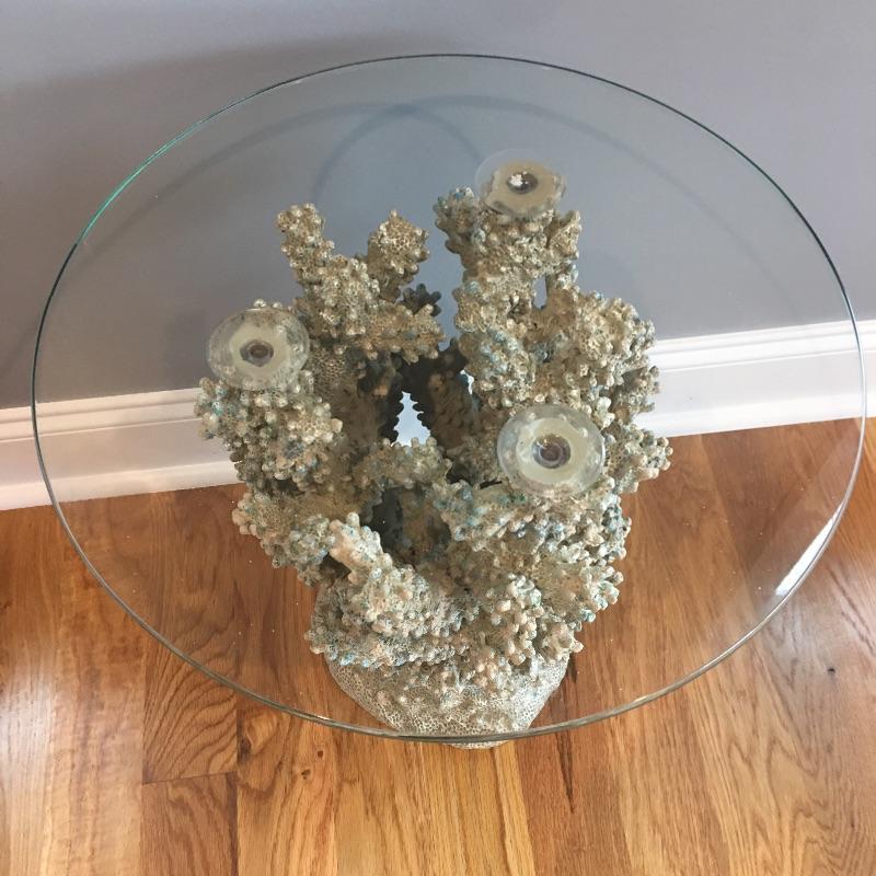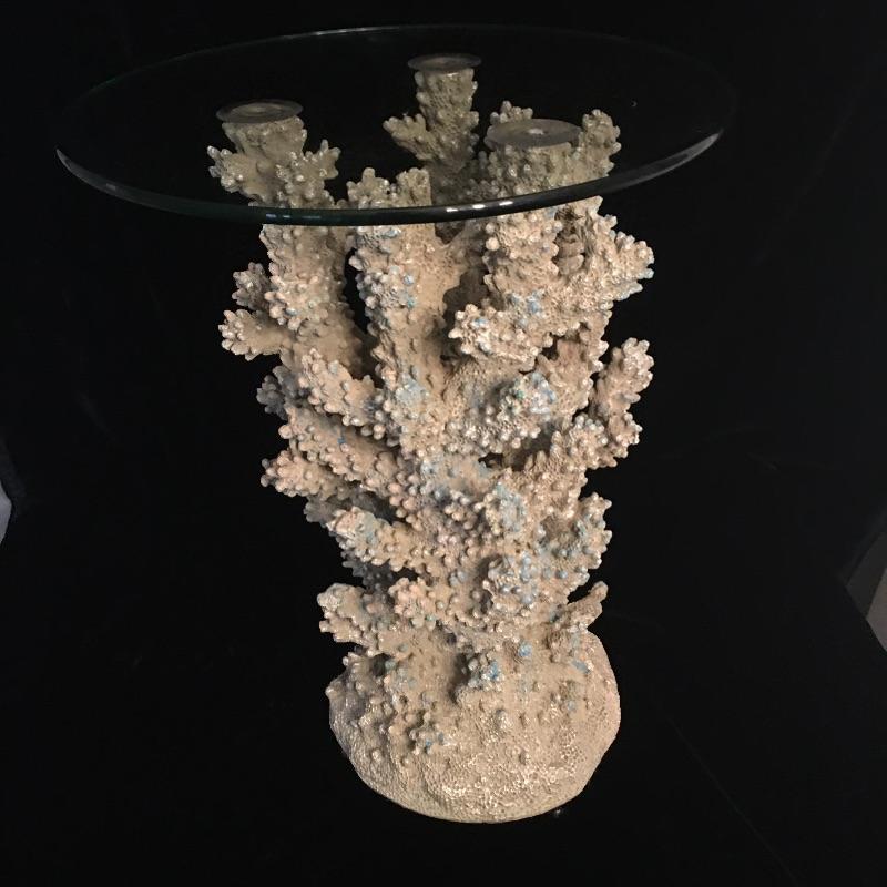 Glass top table with faux coral base. Add this unique piece to any room in your home to start the conversation. Table measures 16”D x 20.75” tall.