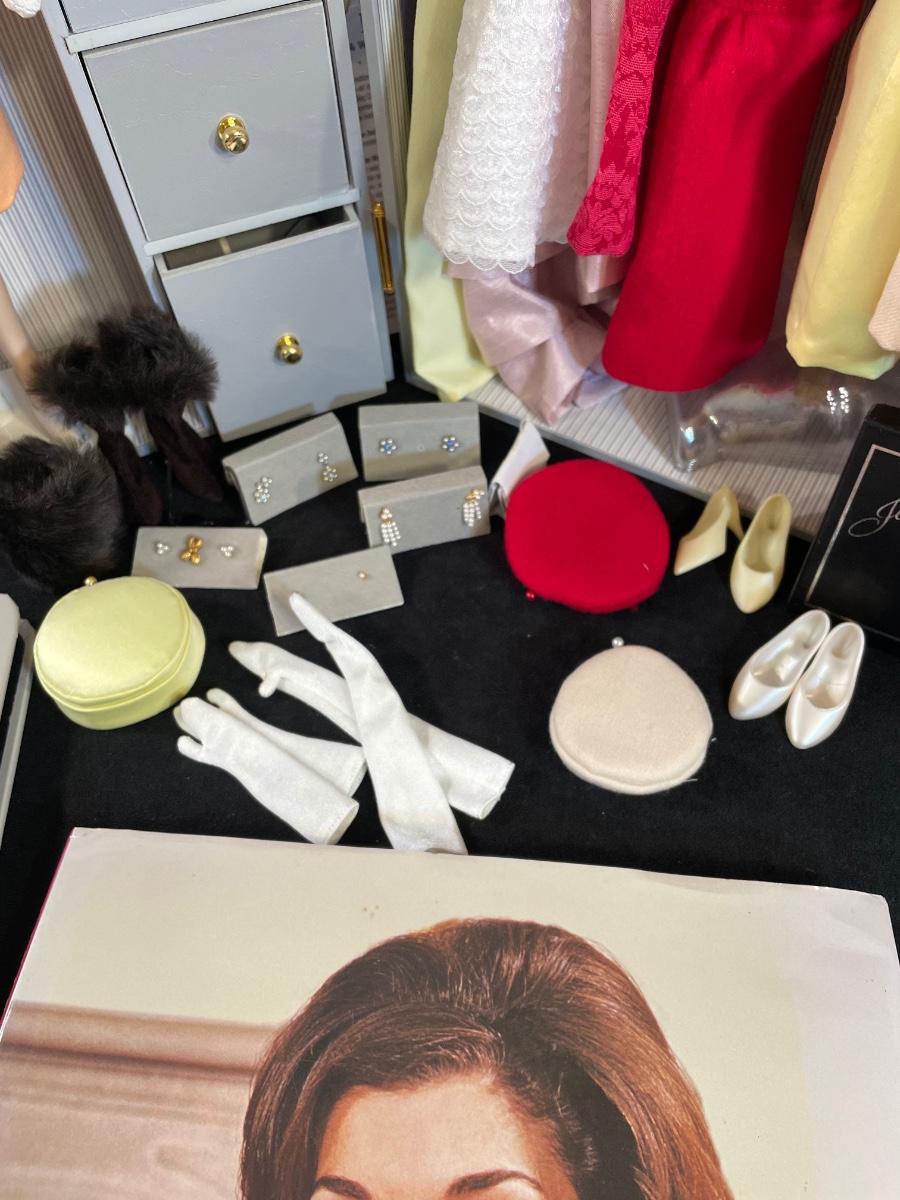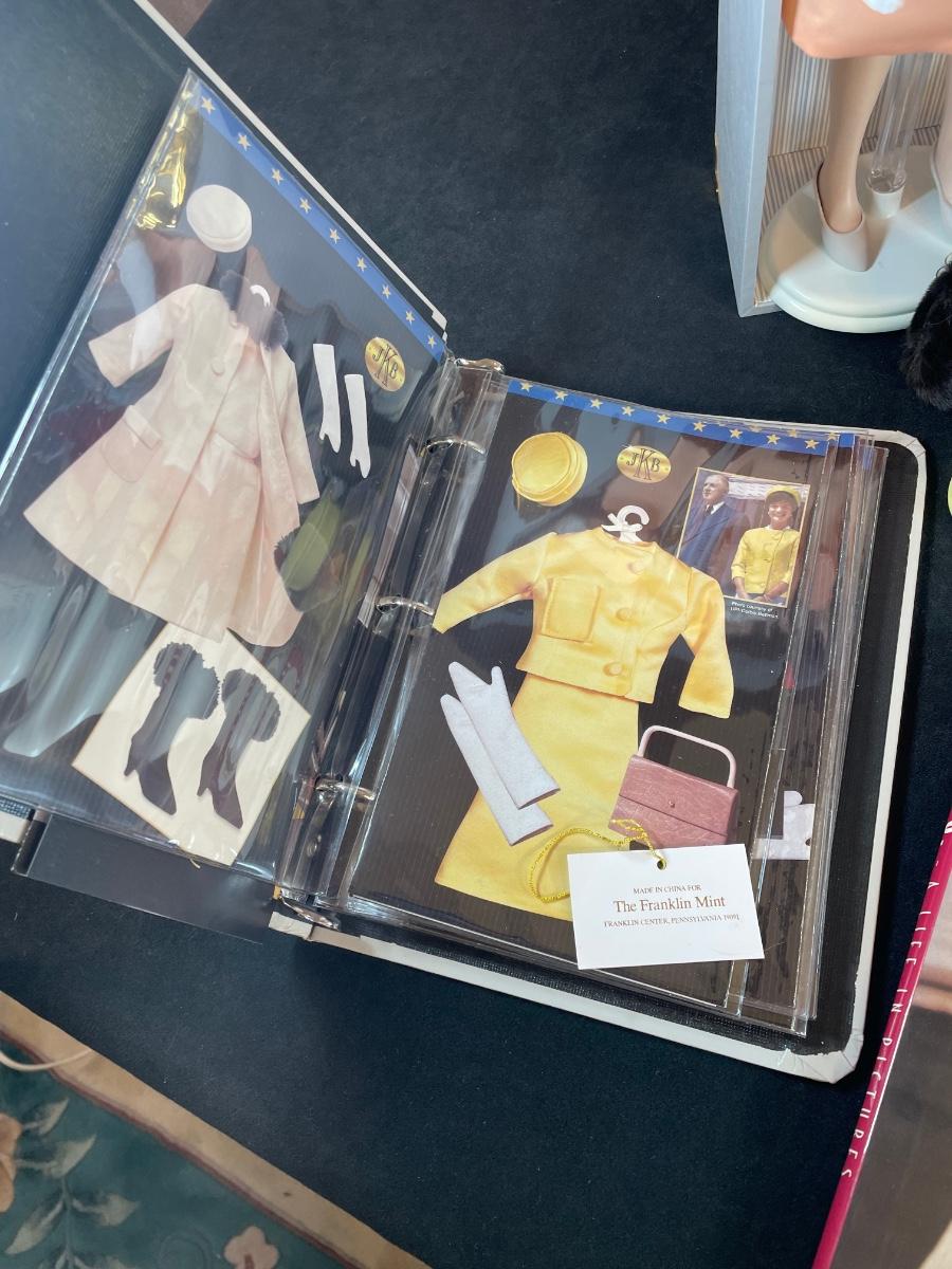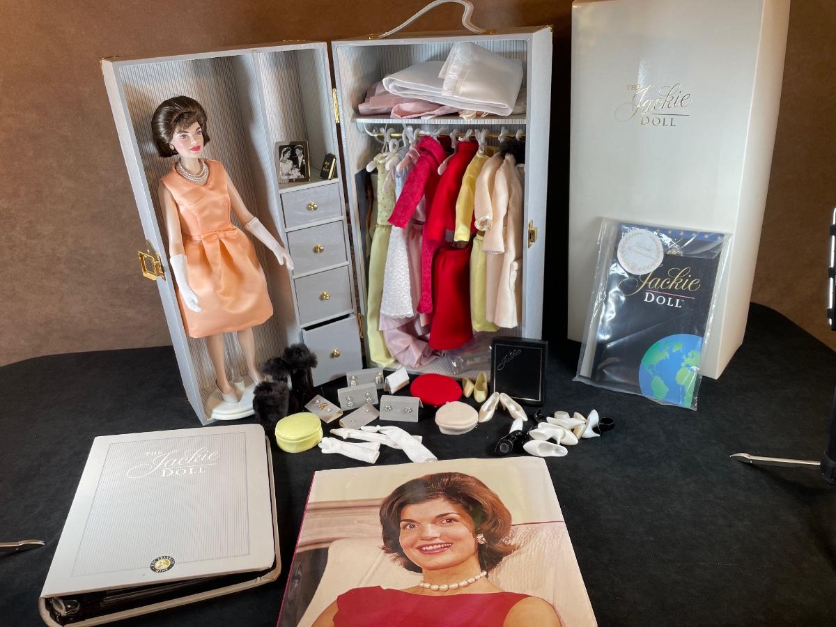 Franklin Mint "The Jackie Doll" collection includes original box, COA, carrying trunk, catalog binder of outfits, 12 outfits with accessories. Also included is a vintage picture book "Jackie O; A Life in Pictures".