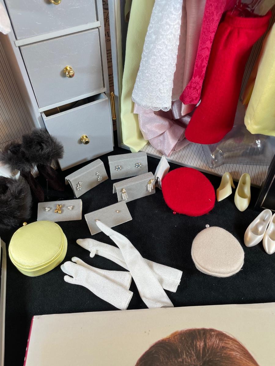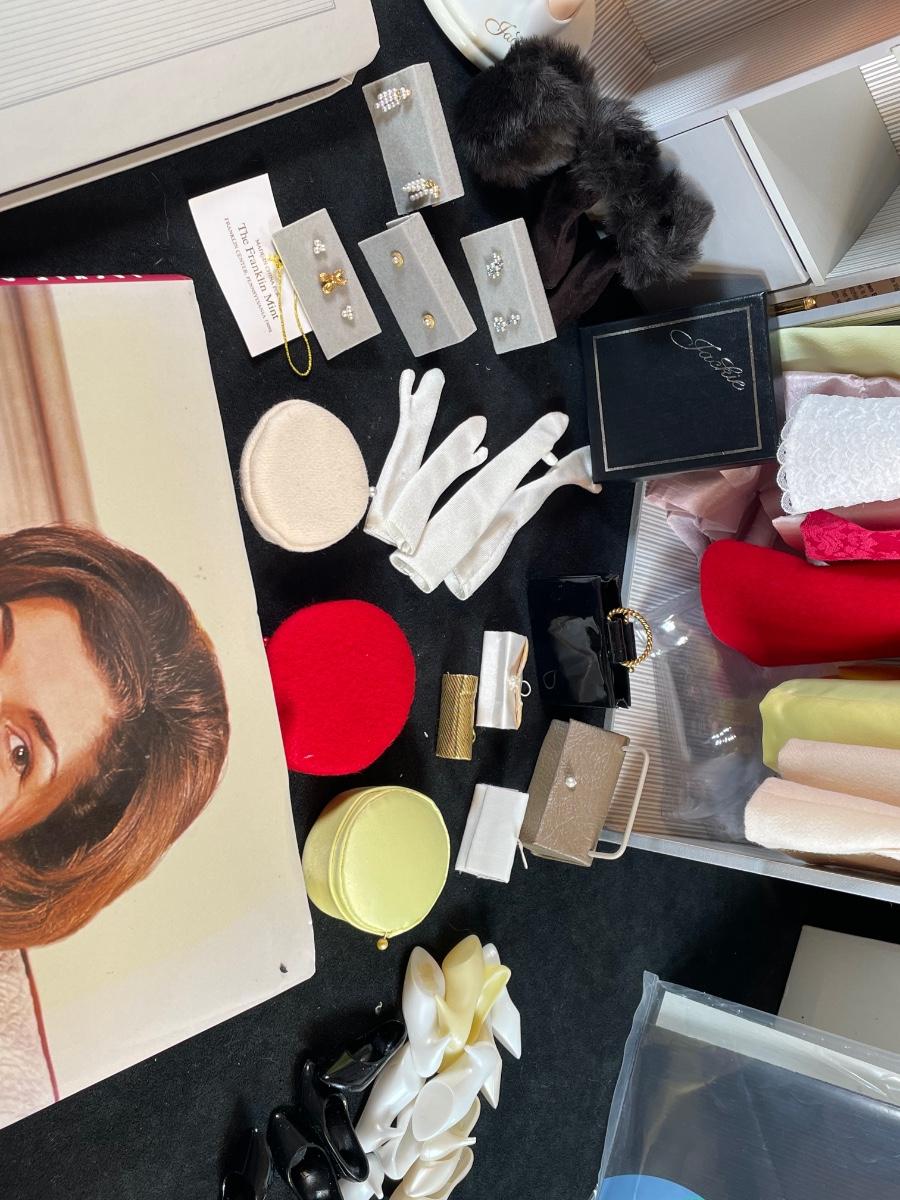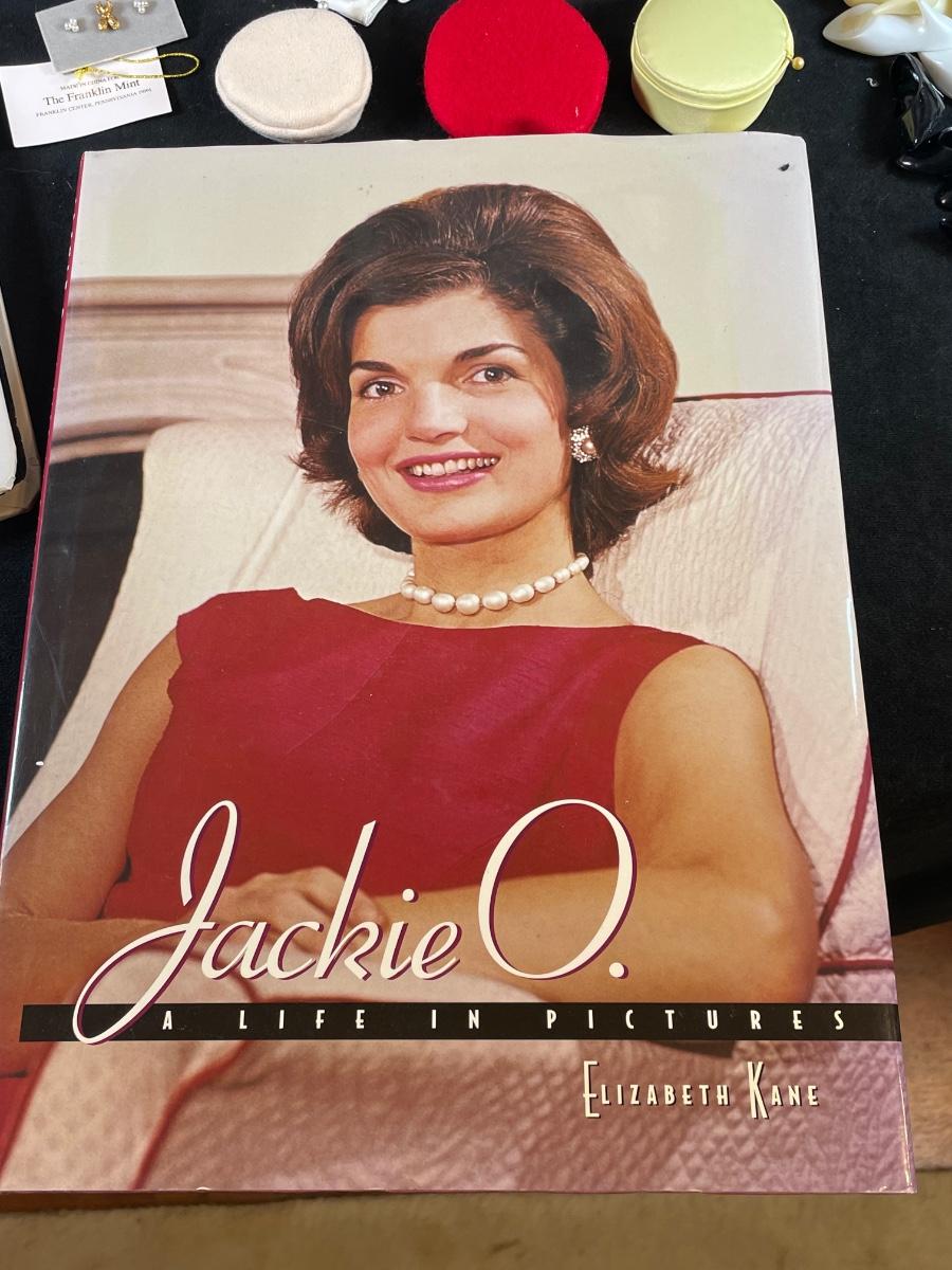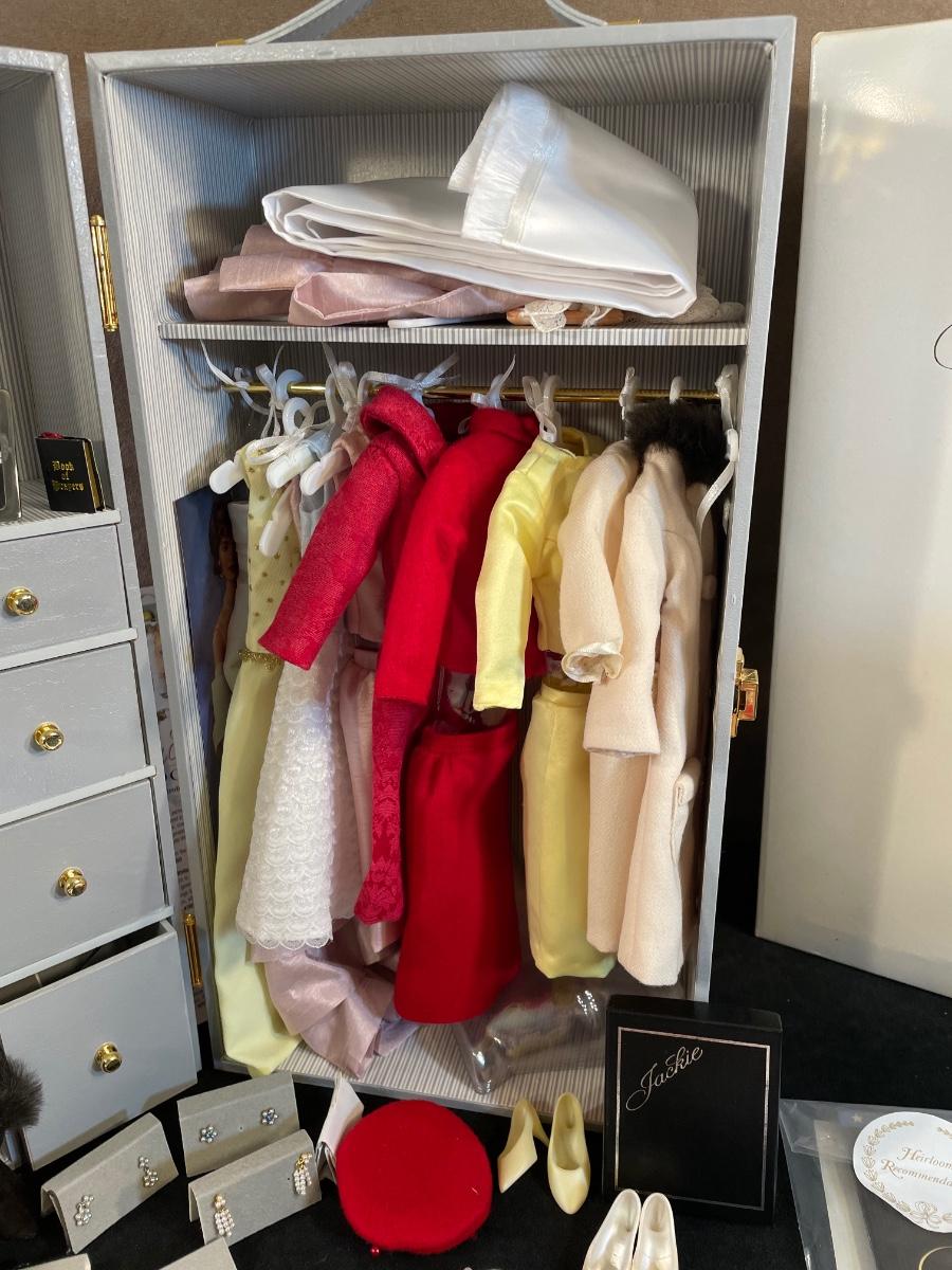Franklin Mint "The Jackie Doll" collection includes original box, COA, carrying trunk, catalog binder of outfits, 12 outfits with accessories. Also included is a vintage picture book "Jackie O; A Life in Pictures".
