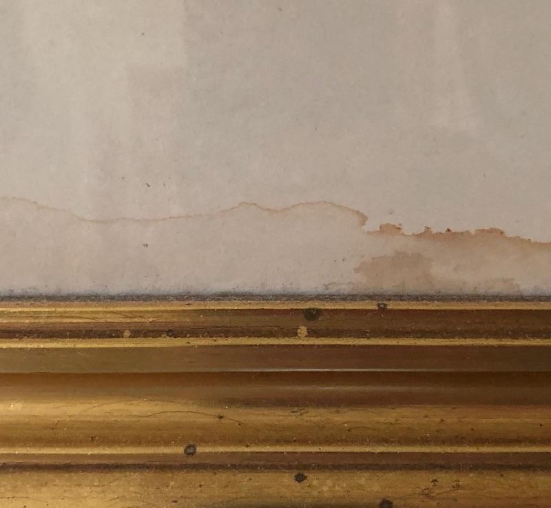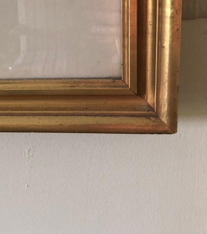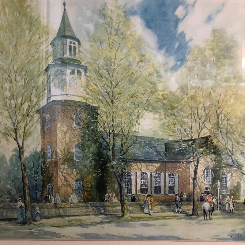 This most pleasing of paintings by artist J.C Claghorn, of the Old Bruton Church brings to life the churchgoers of the Colonial past in a scene of calming beauty that is a pleasure to behold. This watercolor lithograph is set in a gold colored frame that compliments the art perfectly and measures 31” x 40“. There is a water mark on the lower left of the matting and the back that is shown in images.