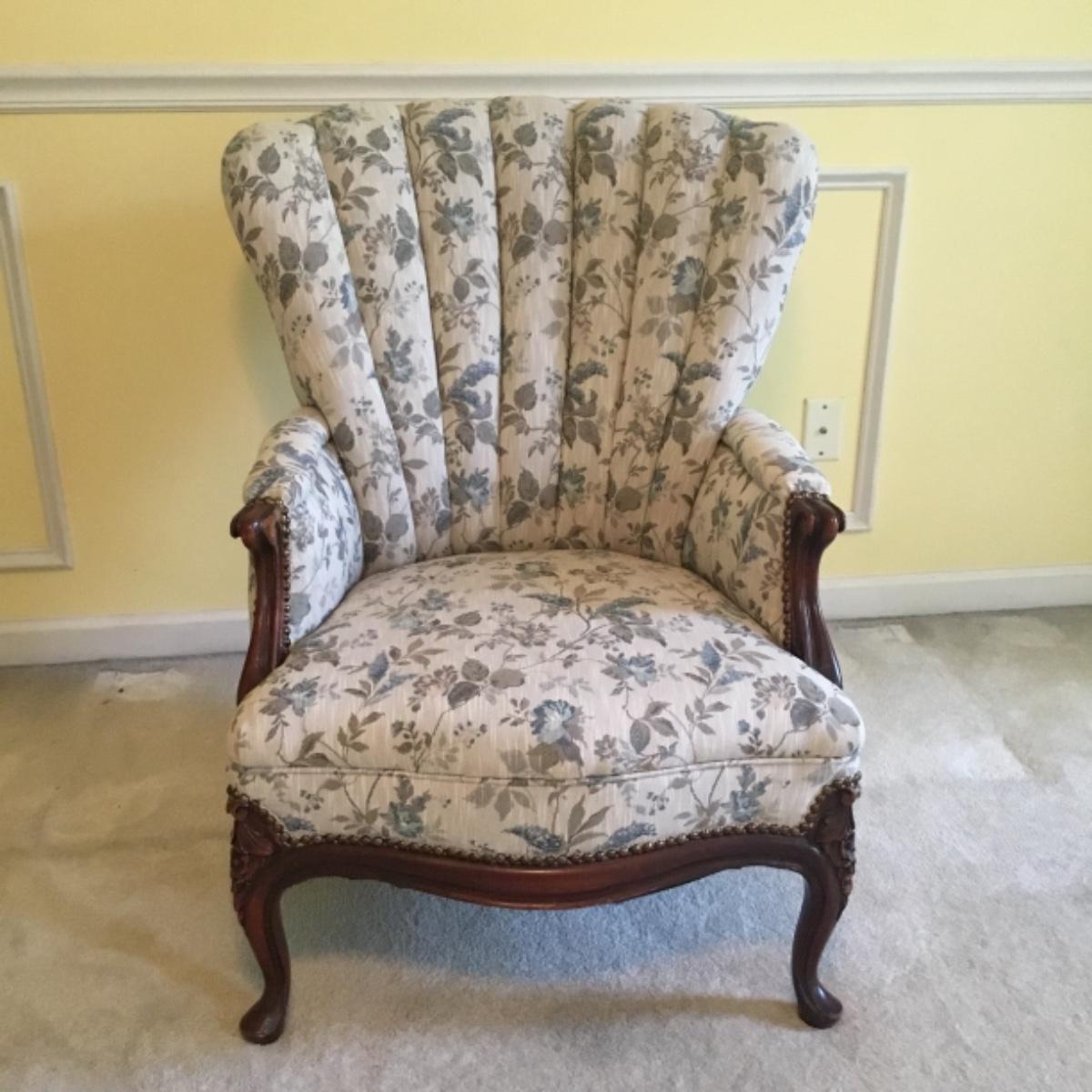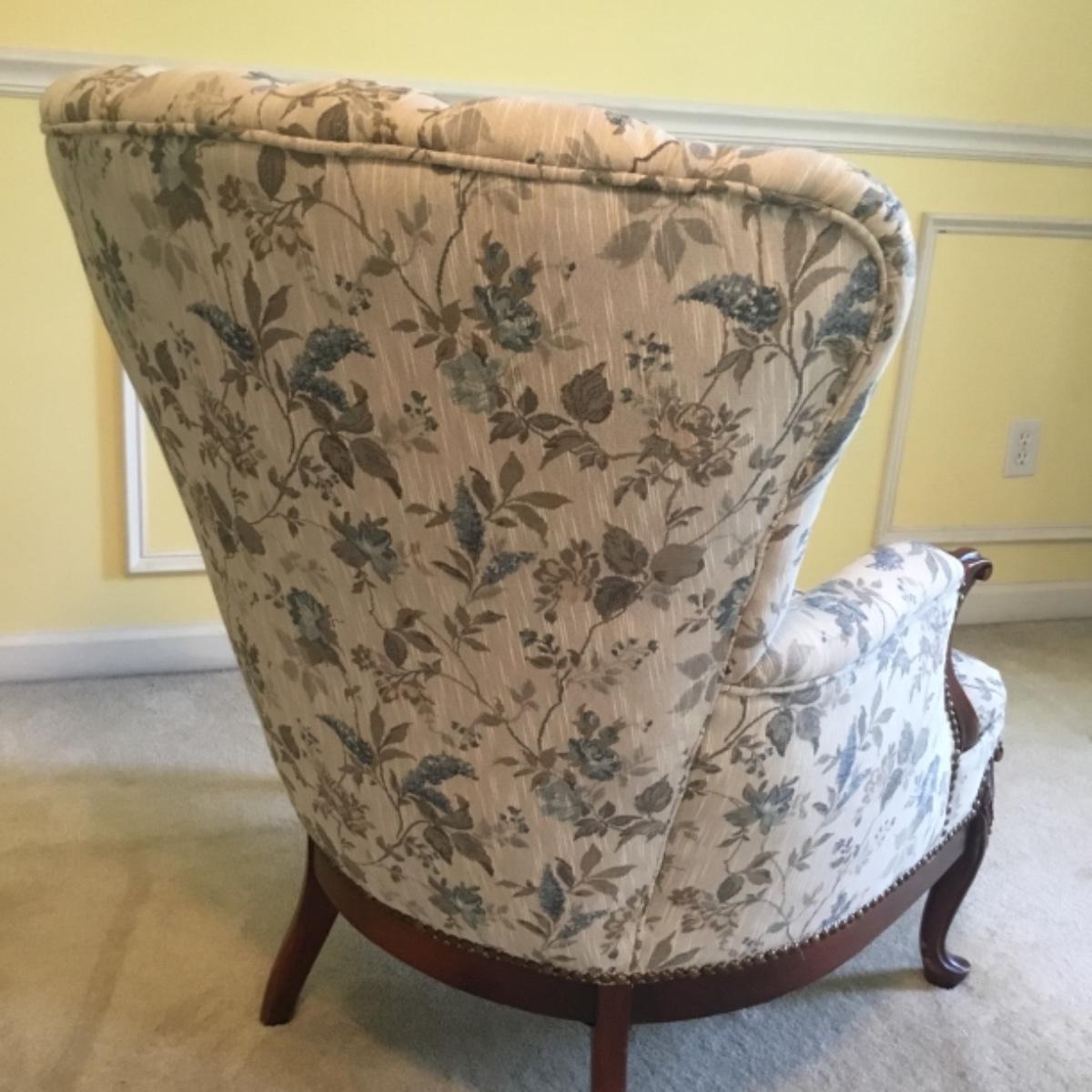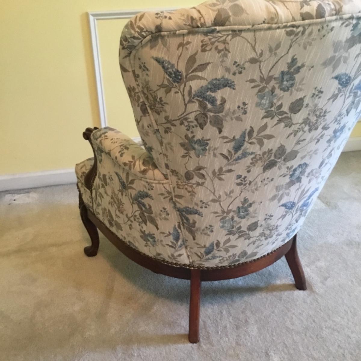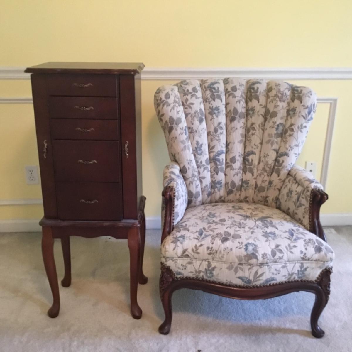 Lot includes shellback chair that has seat measurements of 20”x21”x15” and back of the chair stands 36” tall. Upholstery is in good condition and see photos of the floral details in the fabric and the carvings details. Included as well is the dark wooden jewelry armoire. Four drawers pull out for organization and the top opens up to ring and small jewelry items. Armoire measures 15.5”x13”x40”. See photos for details. Local pickup only.