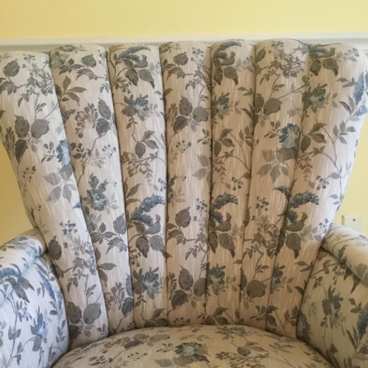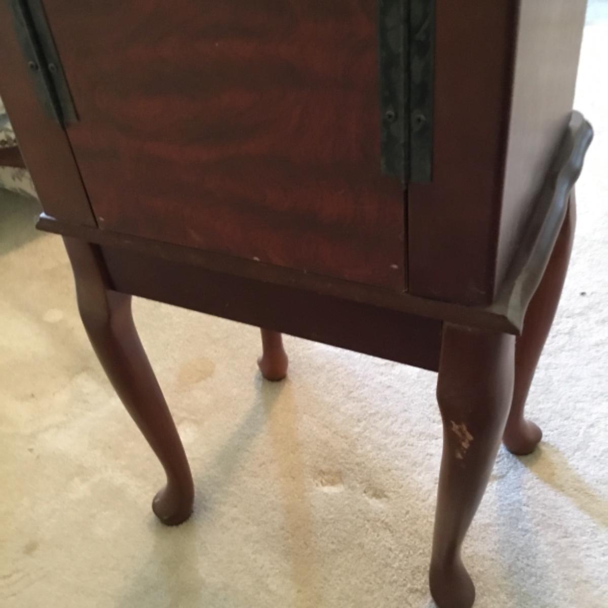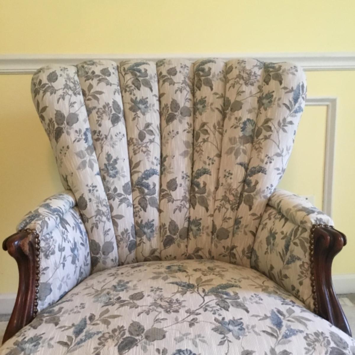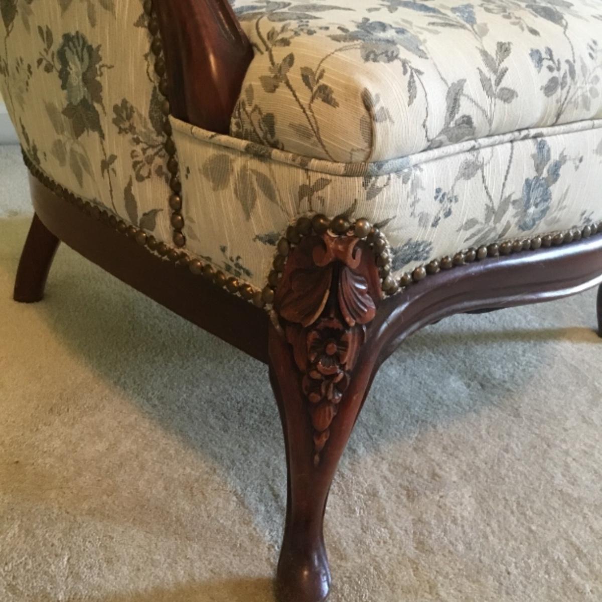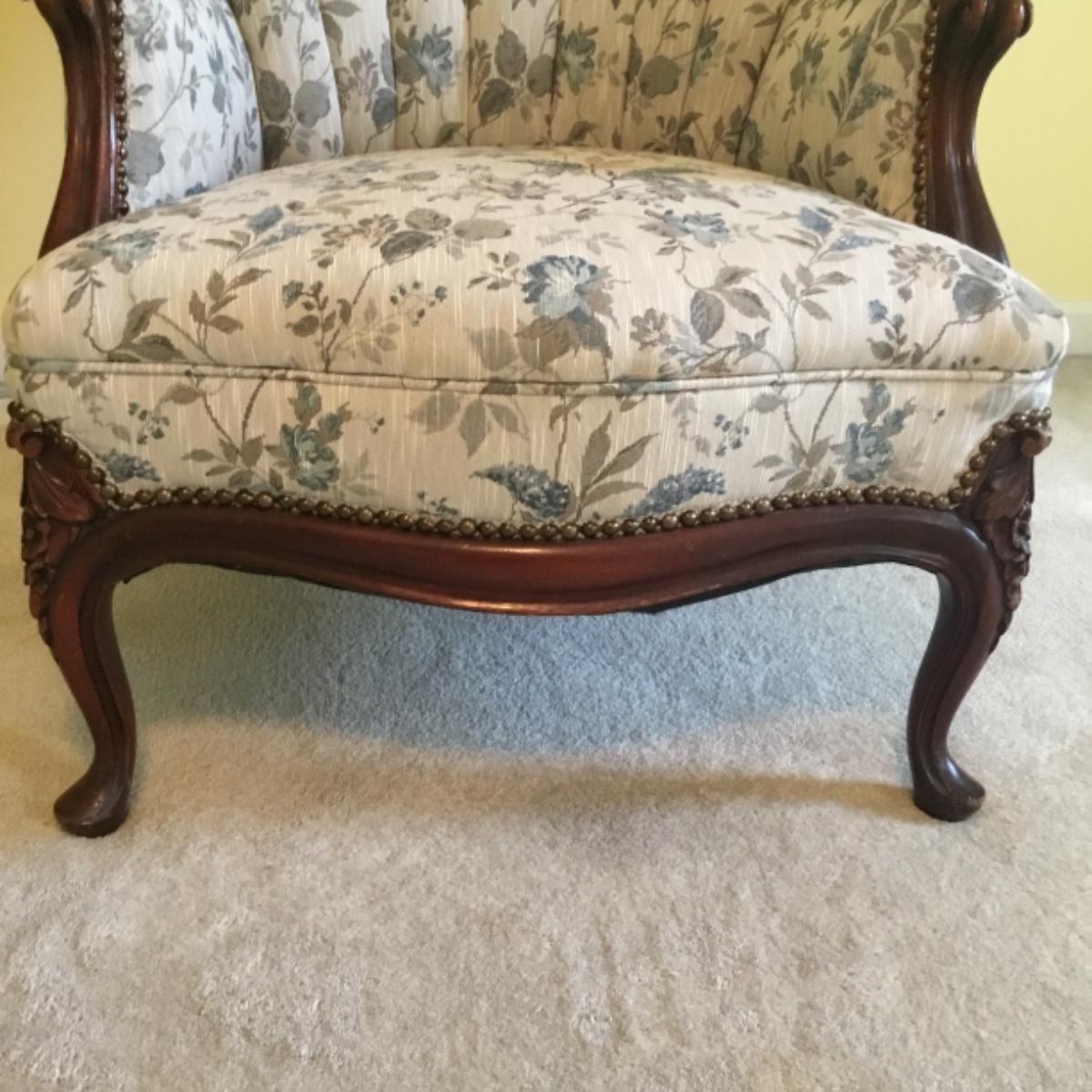 Lot includes shellback chair that has seat measurements of 20”x21”x15” and back of the chair stands 36” tall. Upholstery is in good condition and see photos of the floral details in the fabric and the carvings details. Included as well is the dark wooden jewelry armoire. Four drawers pull out for organization and the top opens up to ring and small jewelry items. Armoire measures 15.5”x13”x40”. See photos for details. Local pickup only.