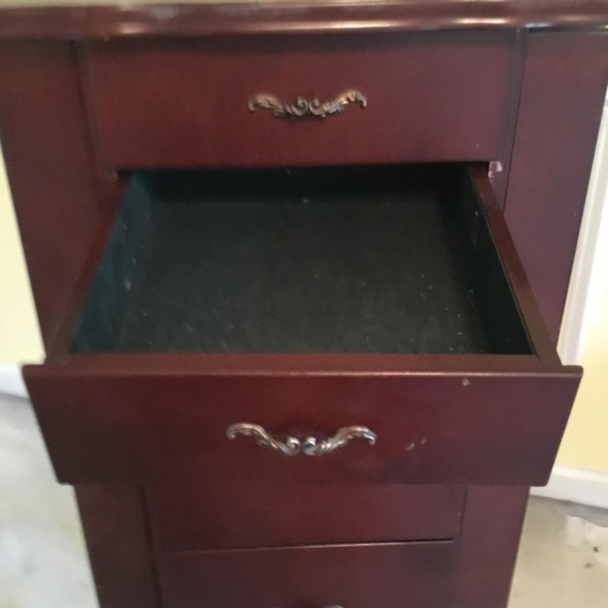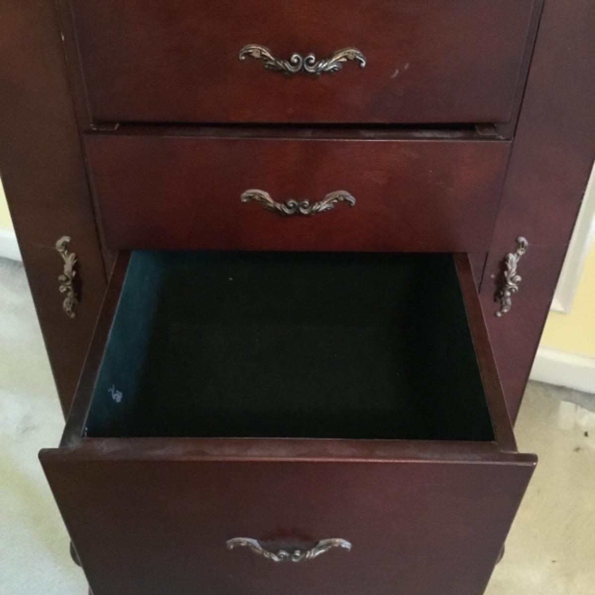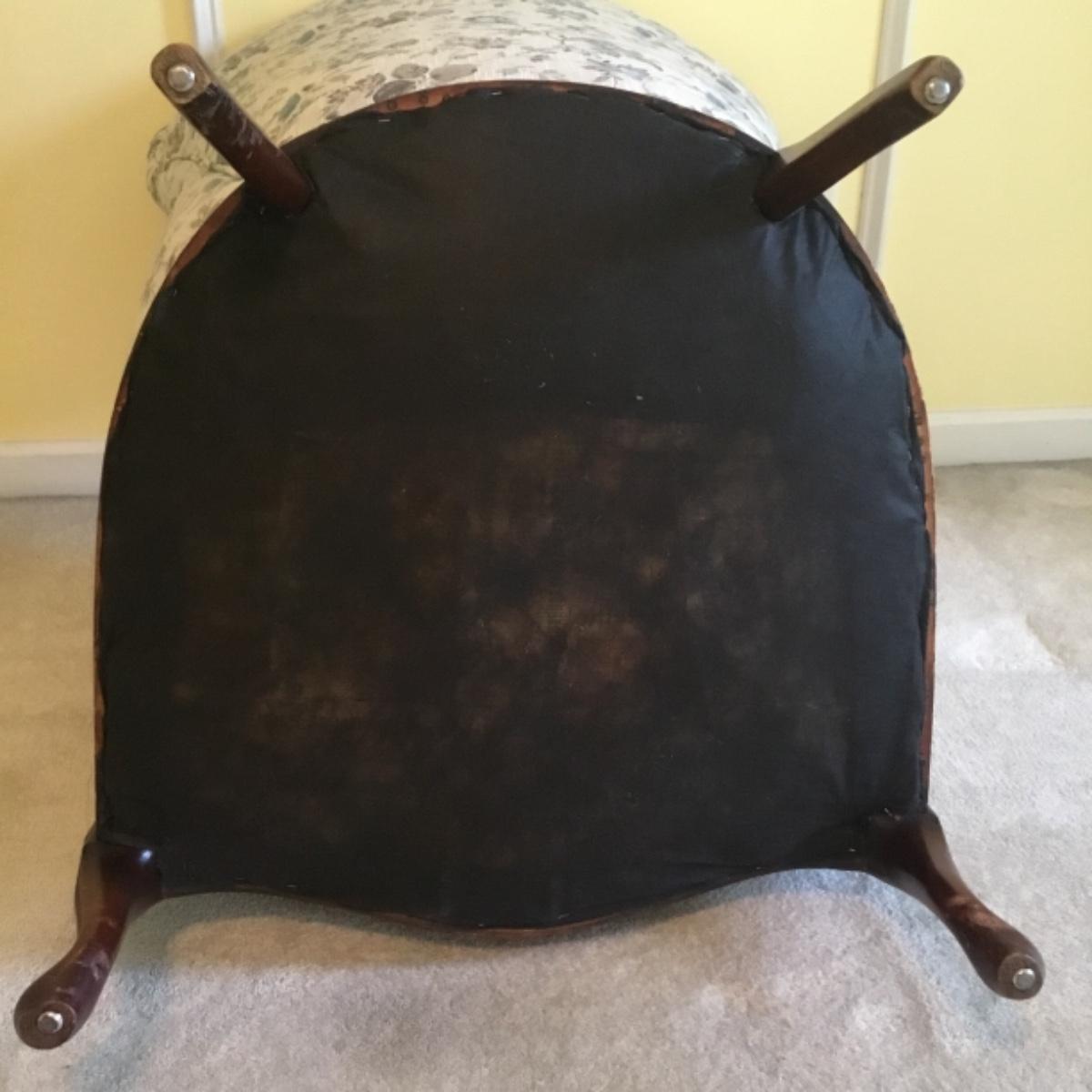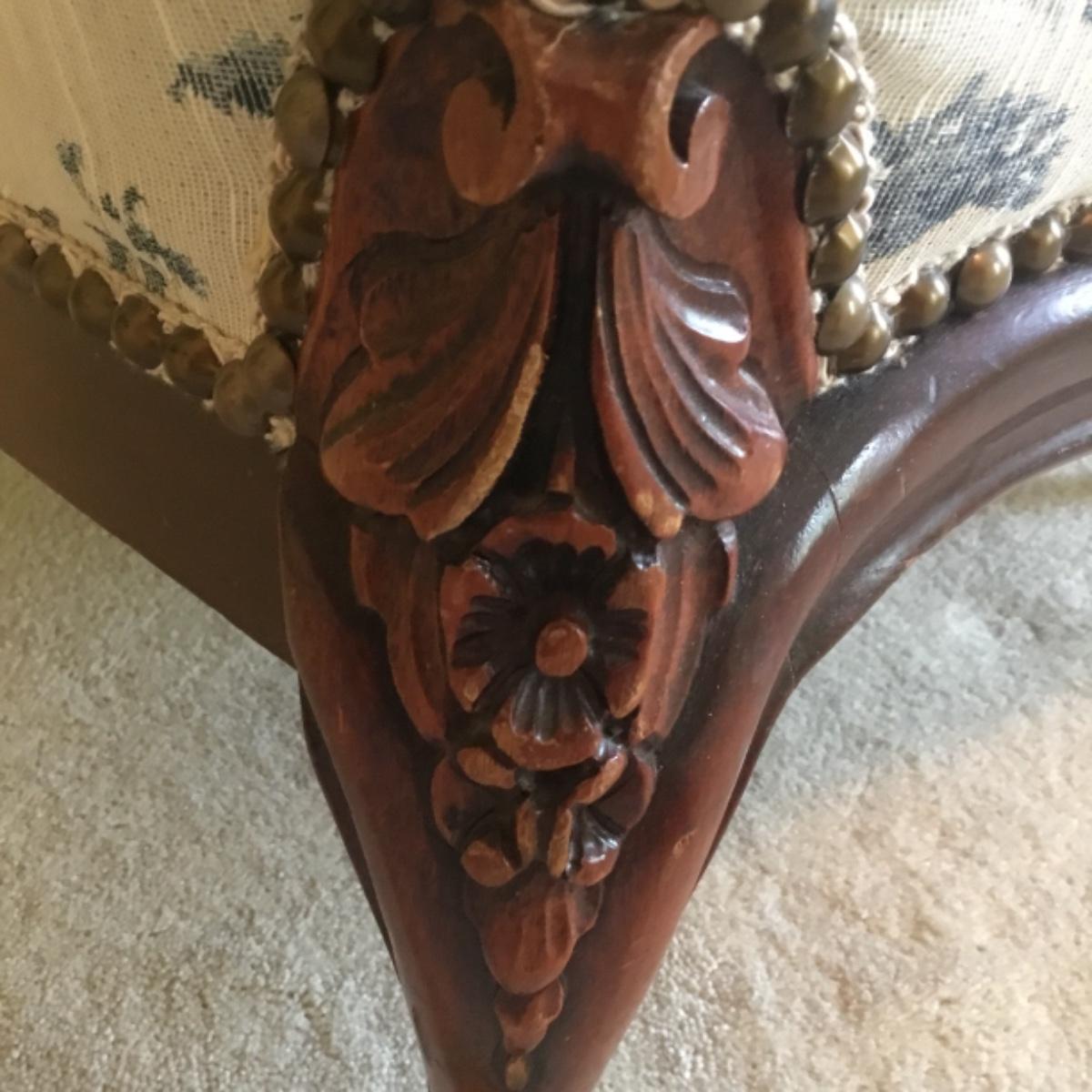 Lot includes shellback chair that has seat measurements of 20”x21”x15” and back of the chair stands 36” tall. Upholstery is in good condition and see photos of the floral details in the fabric and the carvings details. Included as well is the dark wooden jewelry armoire. Four drawers pull out for organization and the top opens up to ring and small jewelry items. Armoire measures 15.5”x13”x40”. See photos for details. Local pickup only.