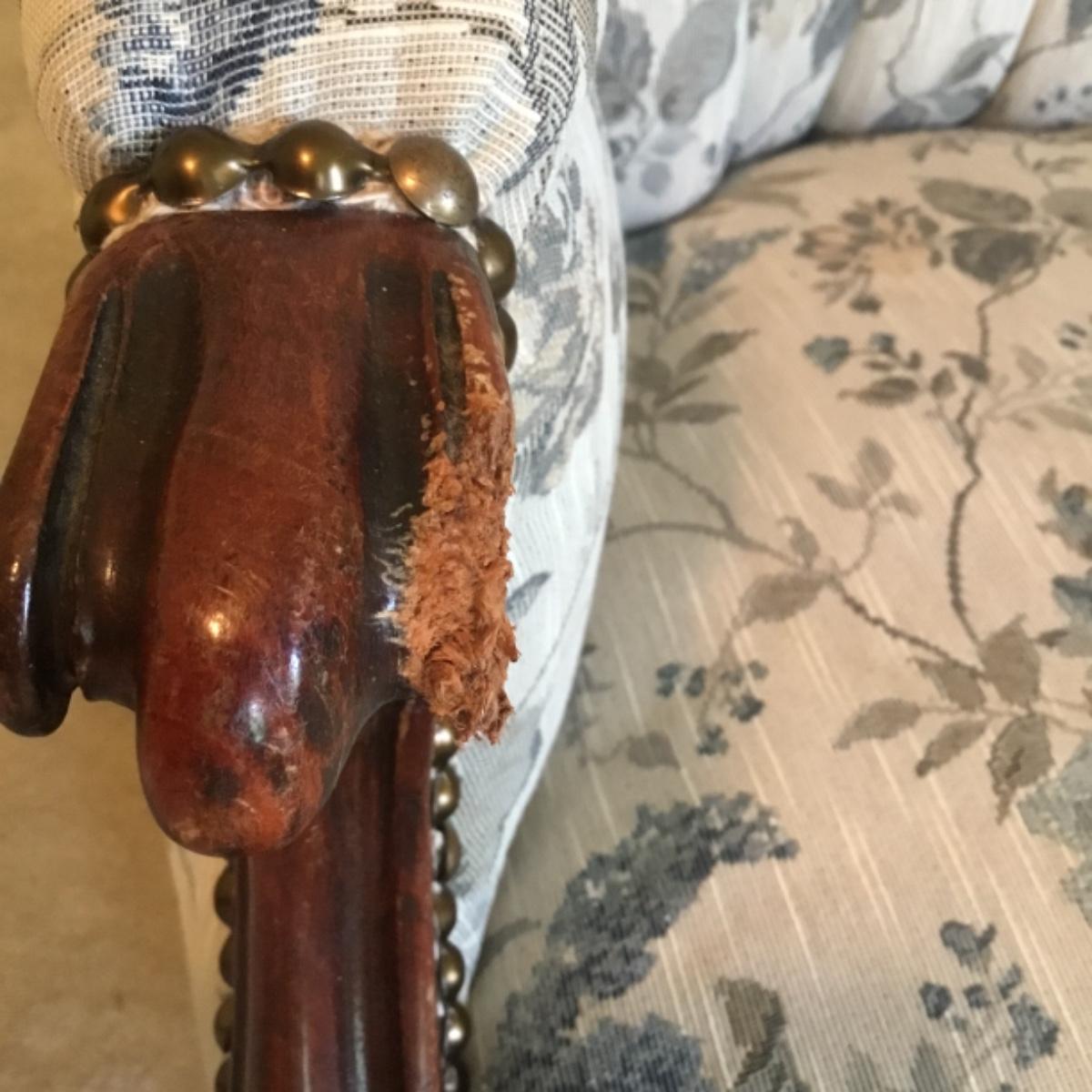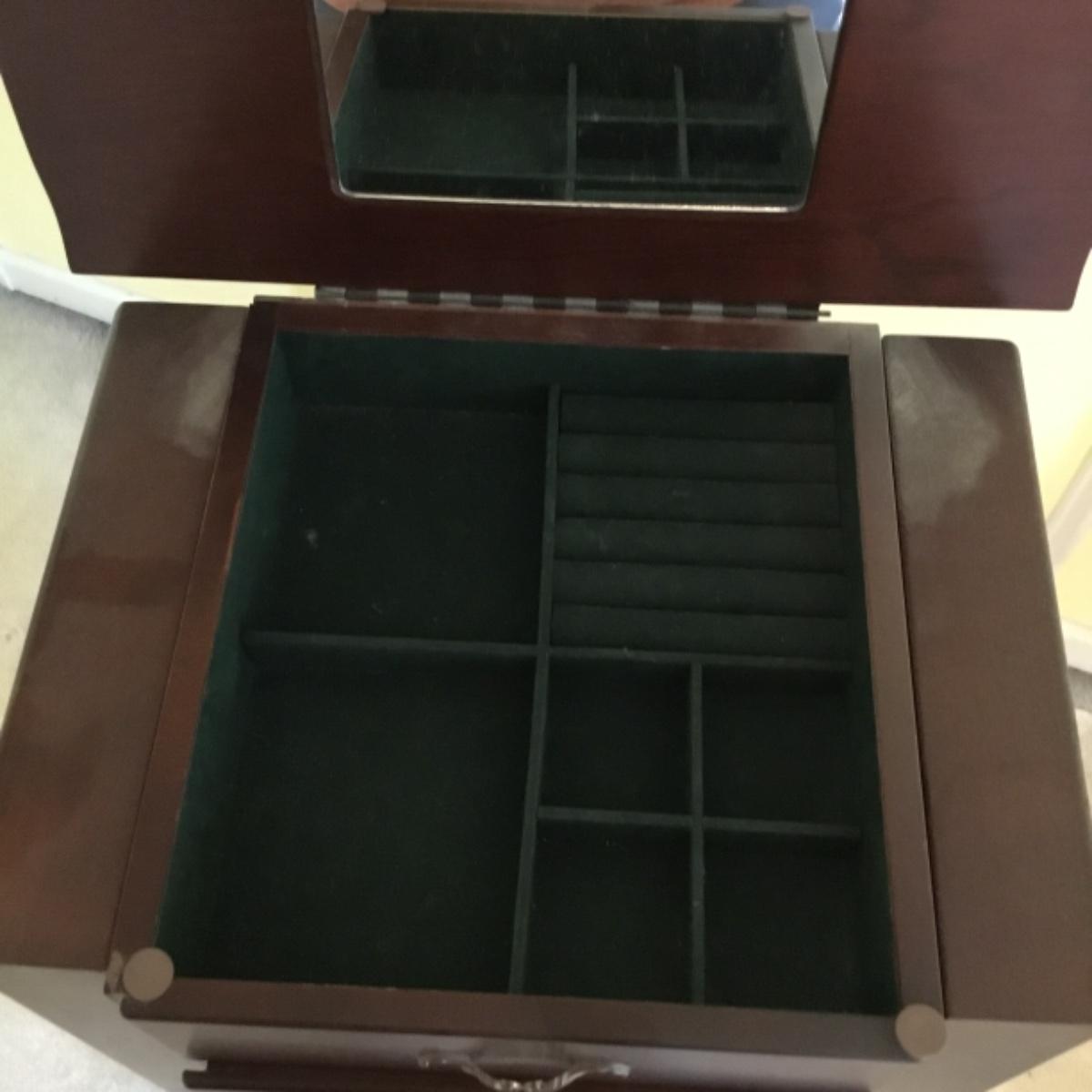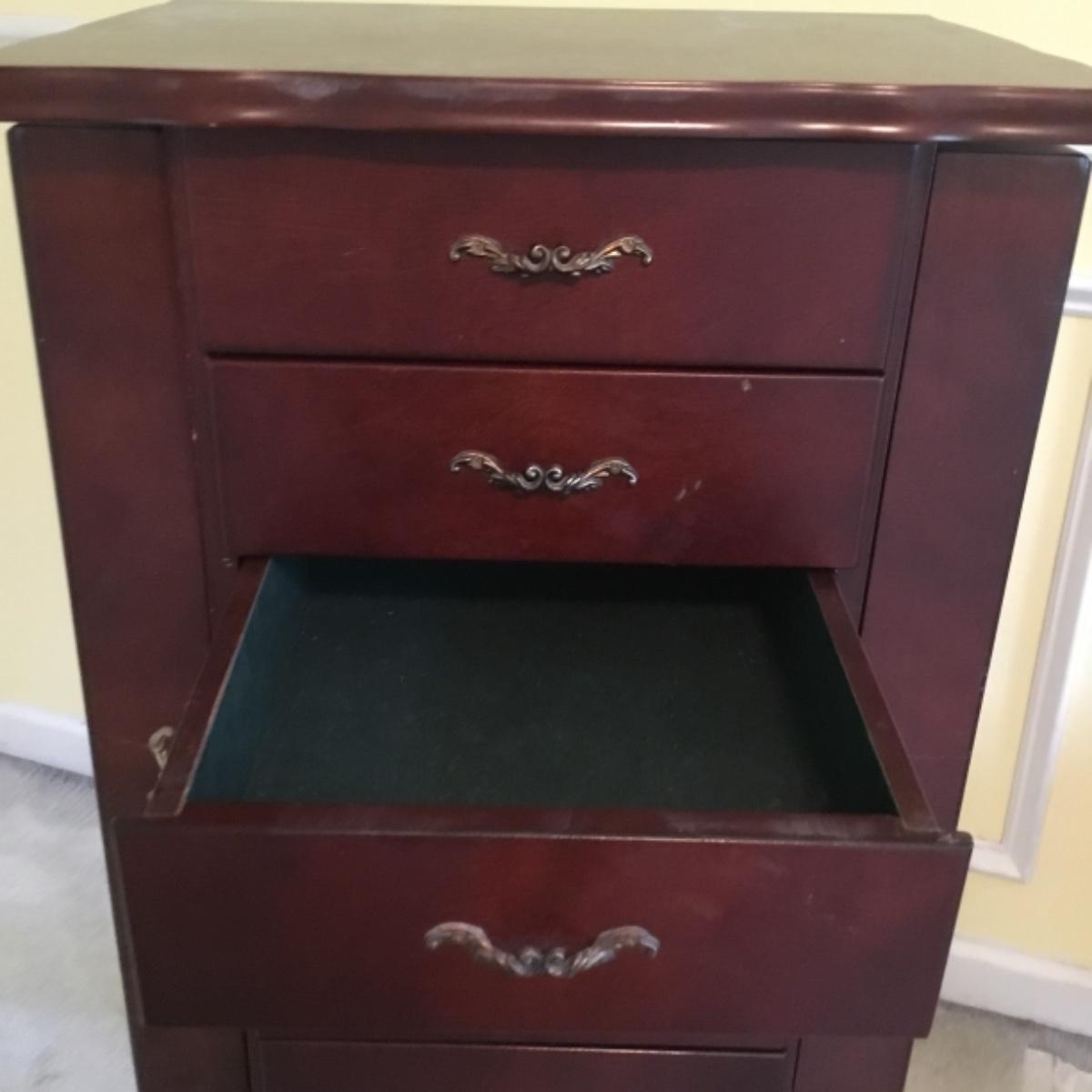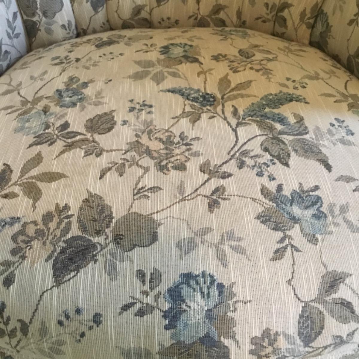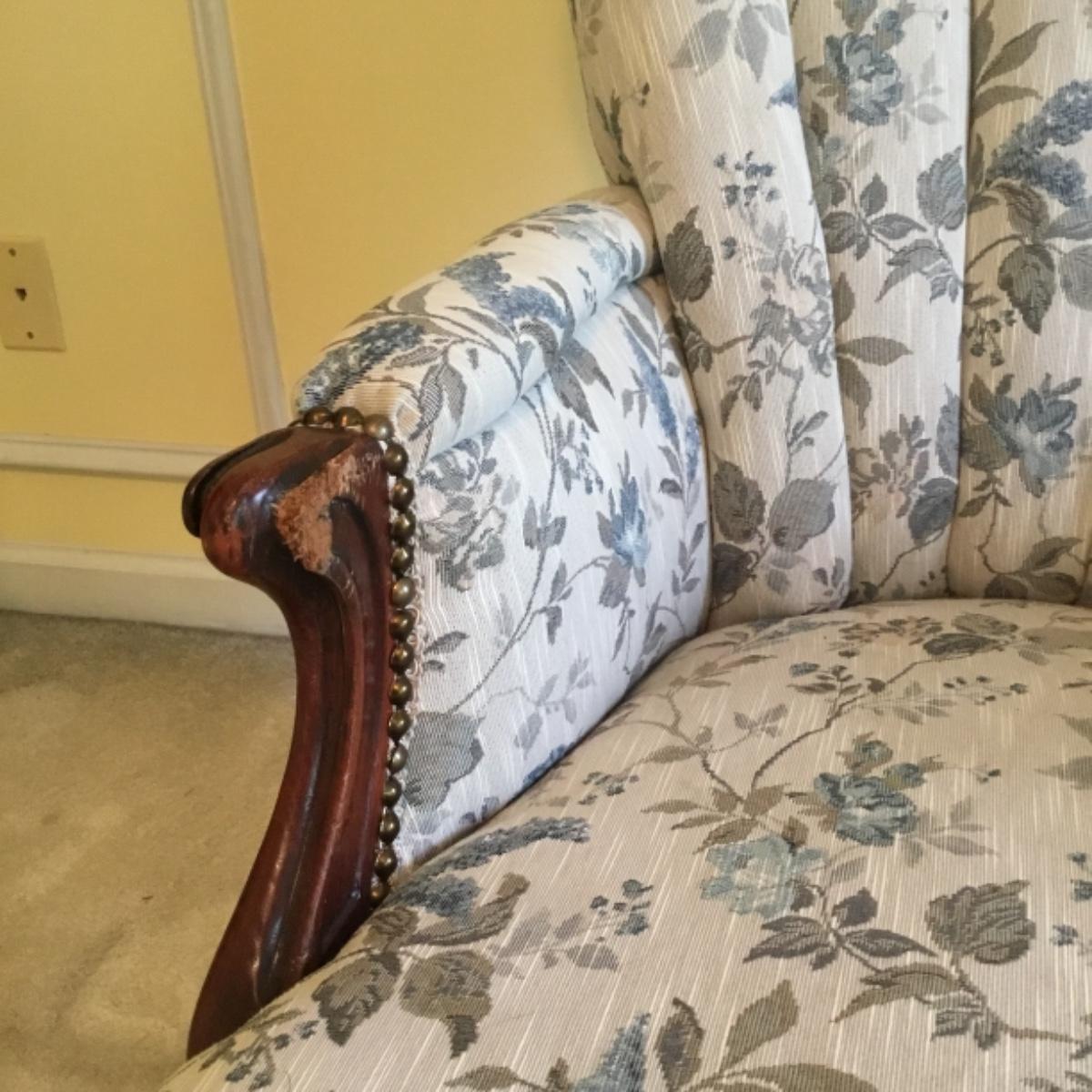 Lot includes shellback chair that has seat measurements of 20”x21”x15” and back of the chair stands 36” tall. Upholstery is in good condition and see photos of the floral details in the fabric and the carvings details. Included as well is the dark wooden jewelry armoire. Four drawers pull out for organization and the top opens up to ring and small jewelry items. Armoire measures 15.5”x13”x40”. See photos for details. Local pickup only.