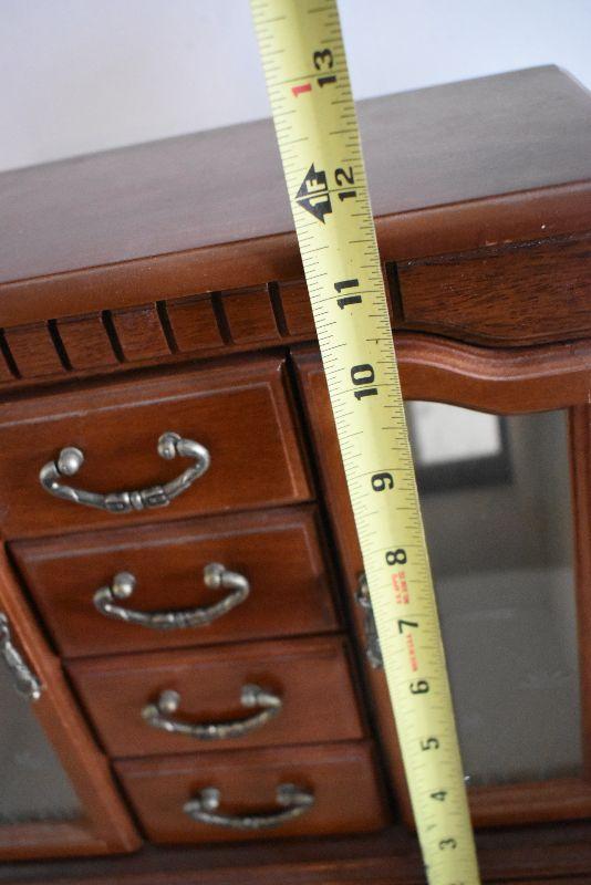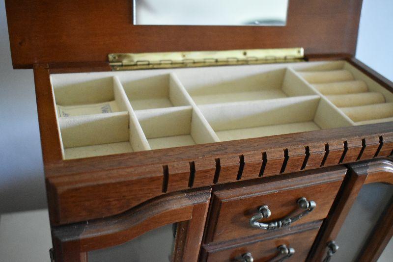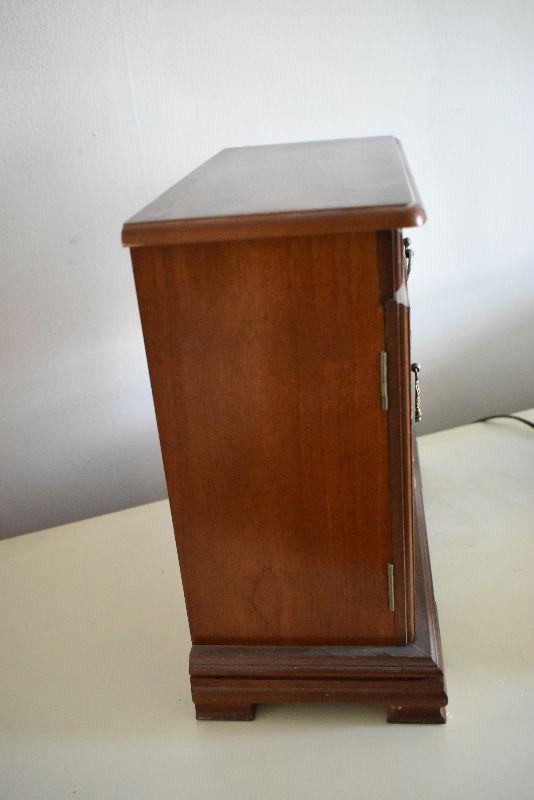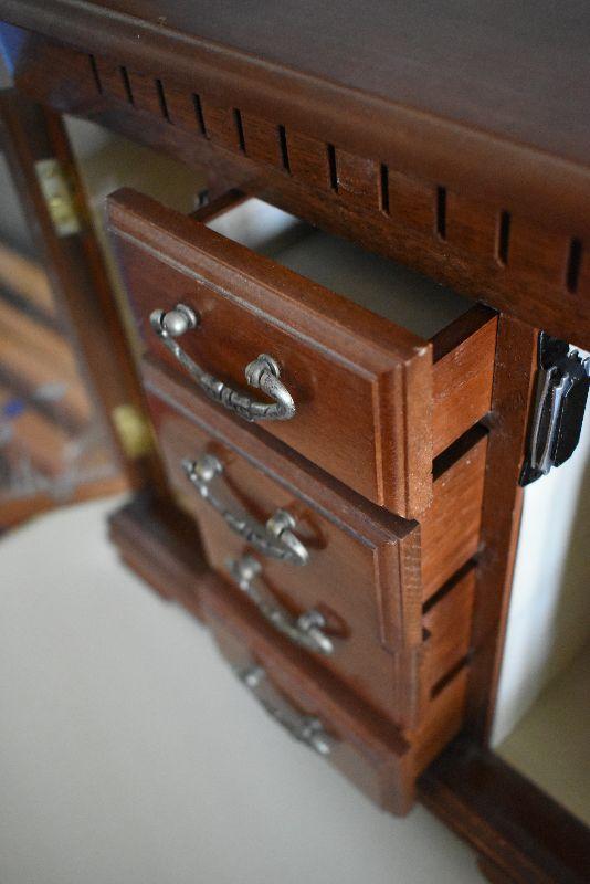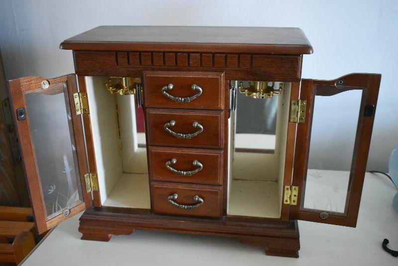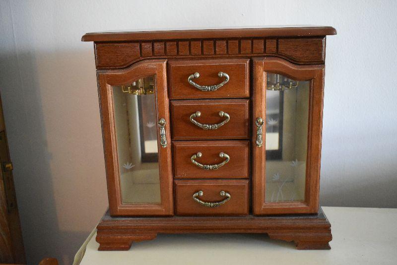 Wooden jewelry box with mirrored doors.