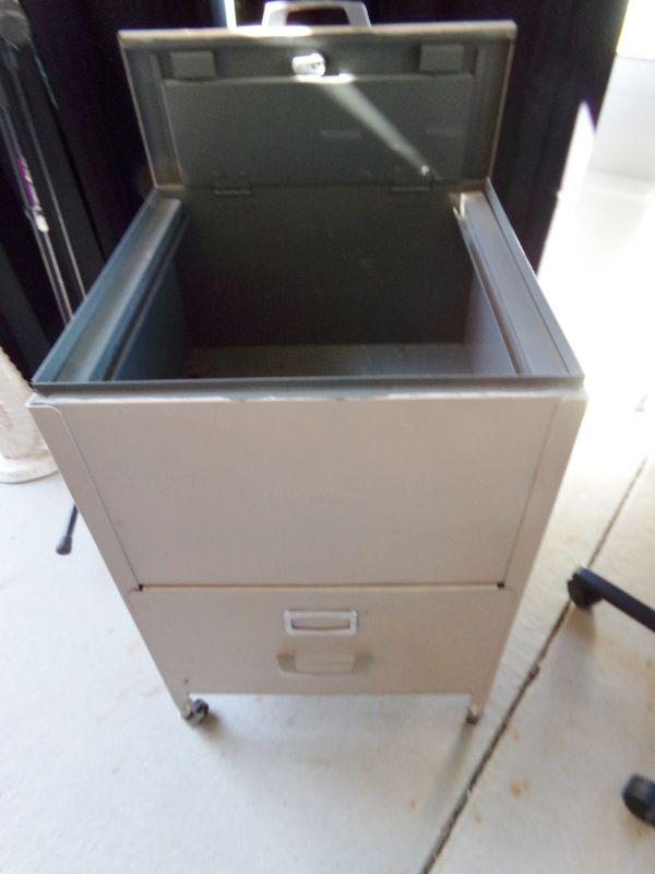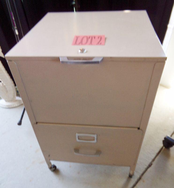 Metal 2 drawer filing cabinet with a lift up top capability. There's a dark 2" x 1/4" mark on the top of cabinet otherwise VG condition