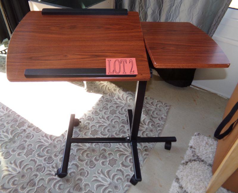 The desk is portable on casters, adjustable height and tilting work area. VG condition