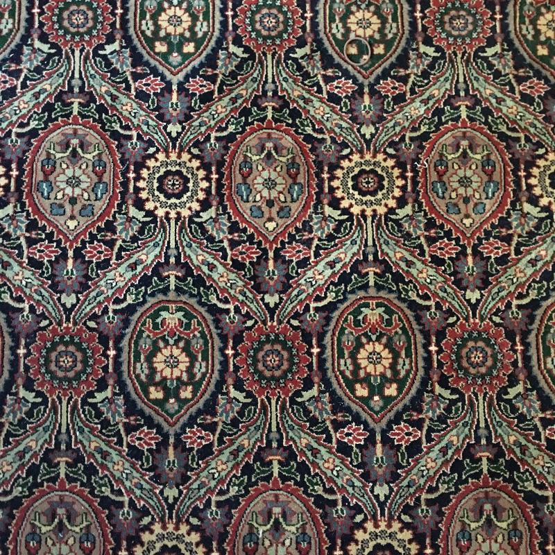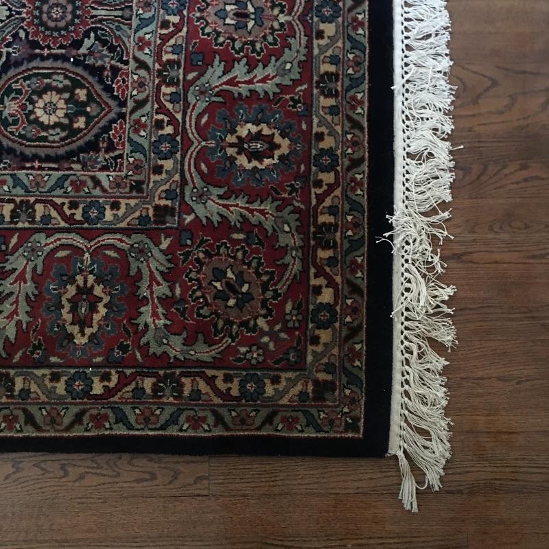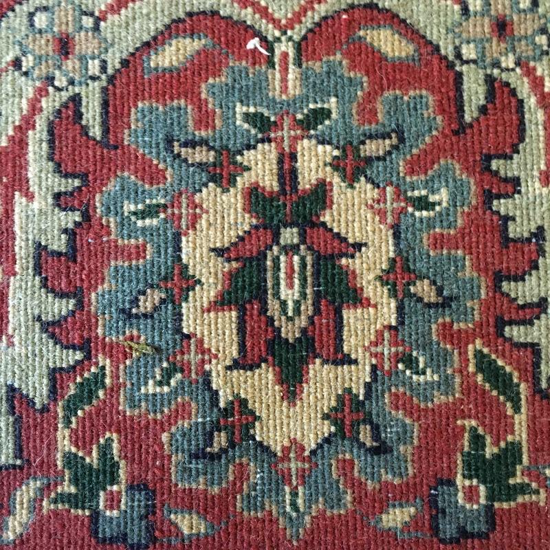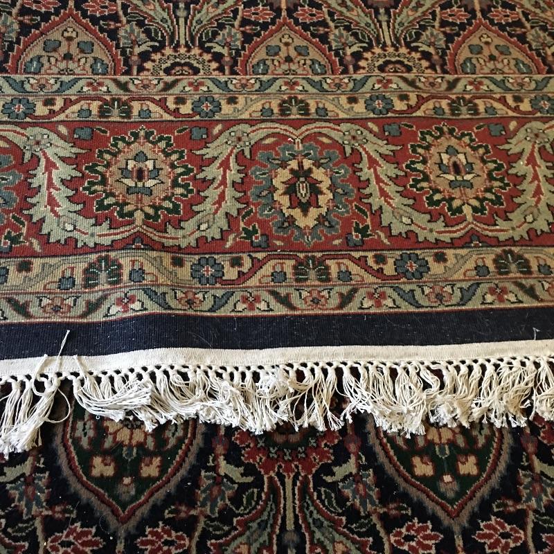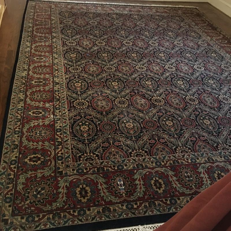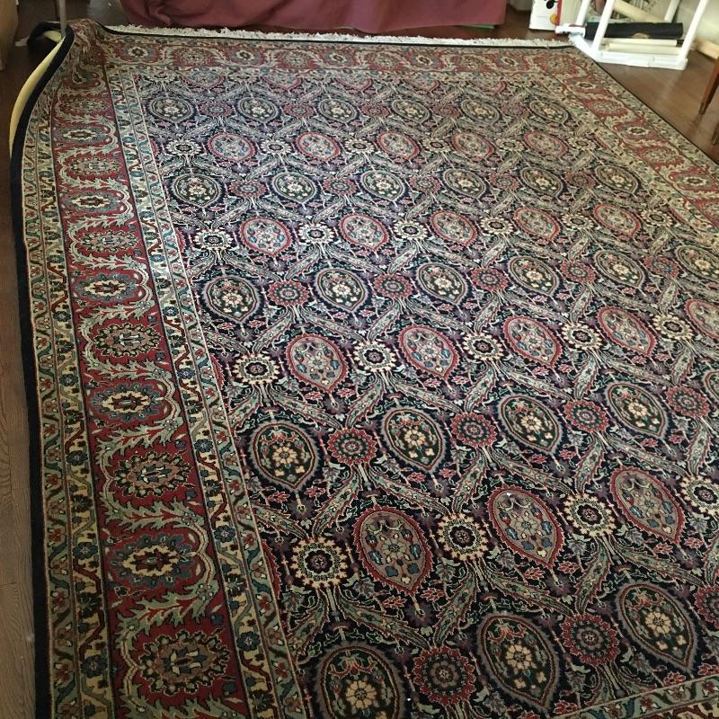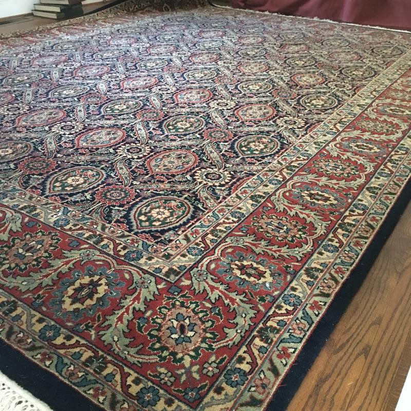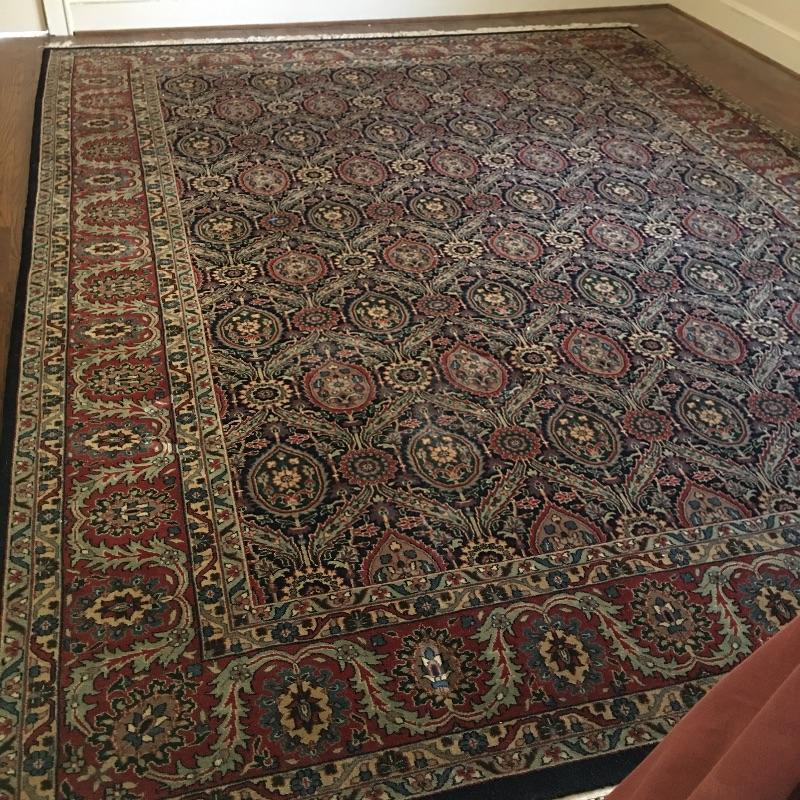 Large multicolored area rug in darker hues of blue, red, tan and green. A beautiful rug to keep your feet warm and beautify your home, while protecting your floors. Pad is included and both are in good condition with no noticeable stains Or maker of rug.