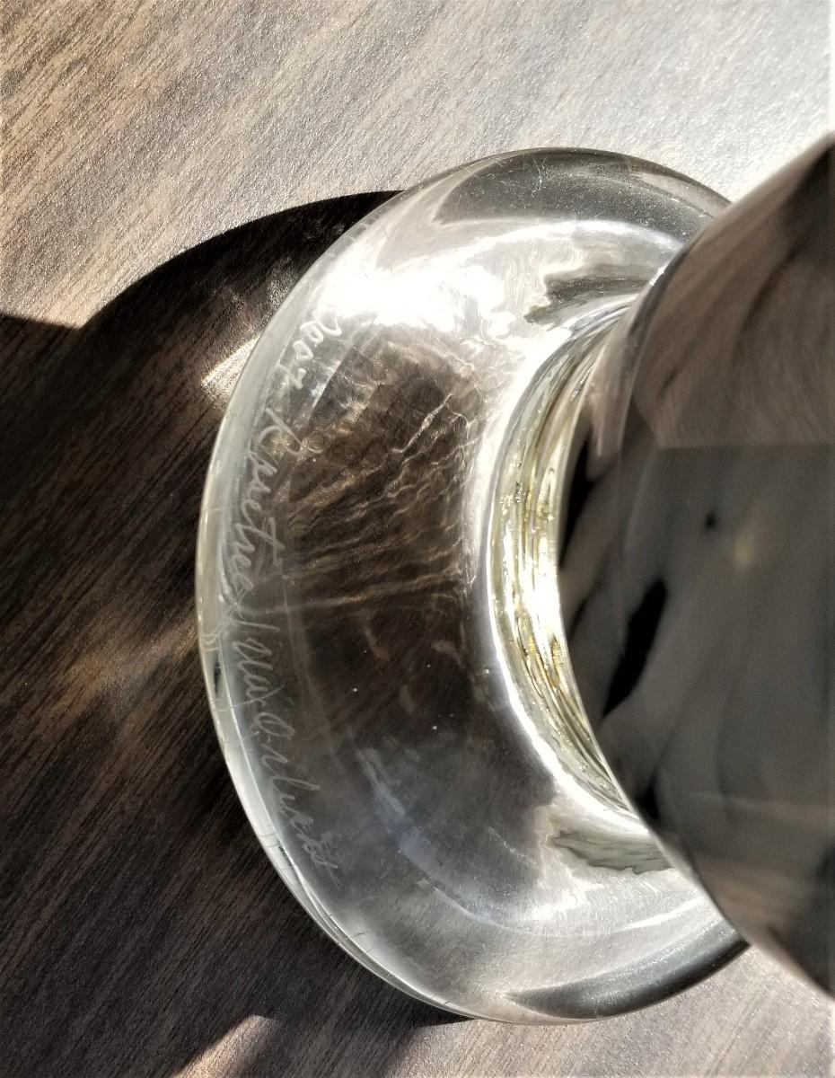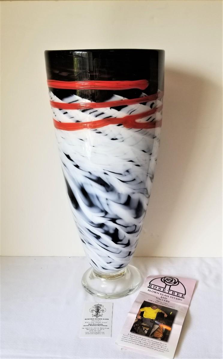 This piece is a real beauty - hand blown, 17" tall, opening at top 7" across. Has brochure from studio. Signed on base.