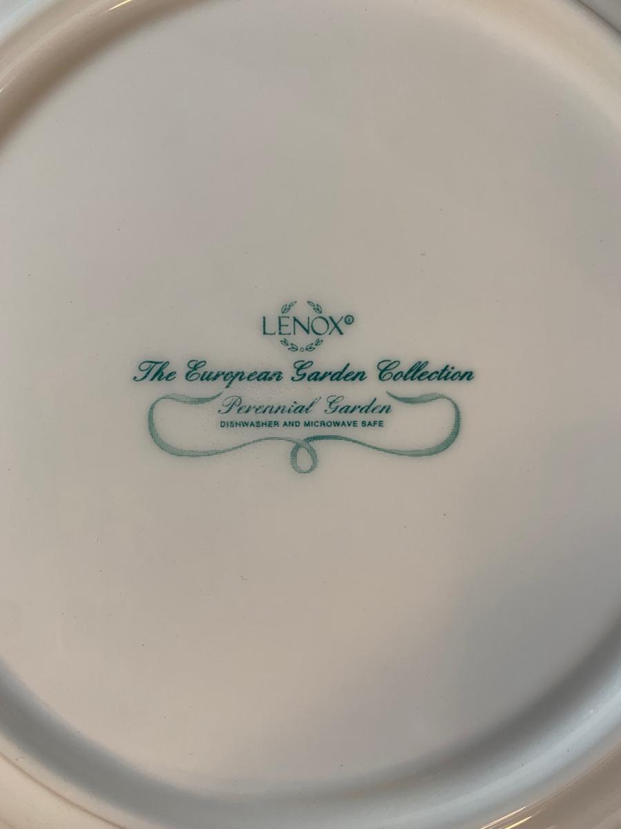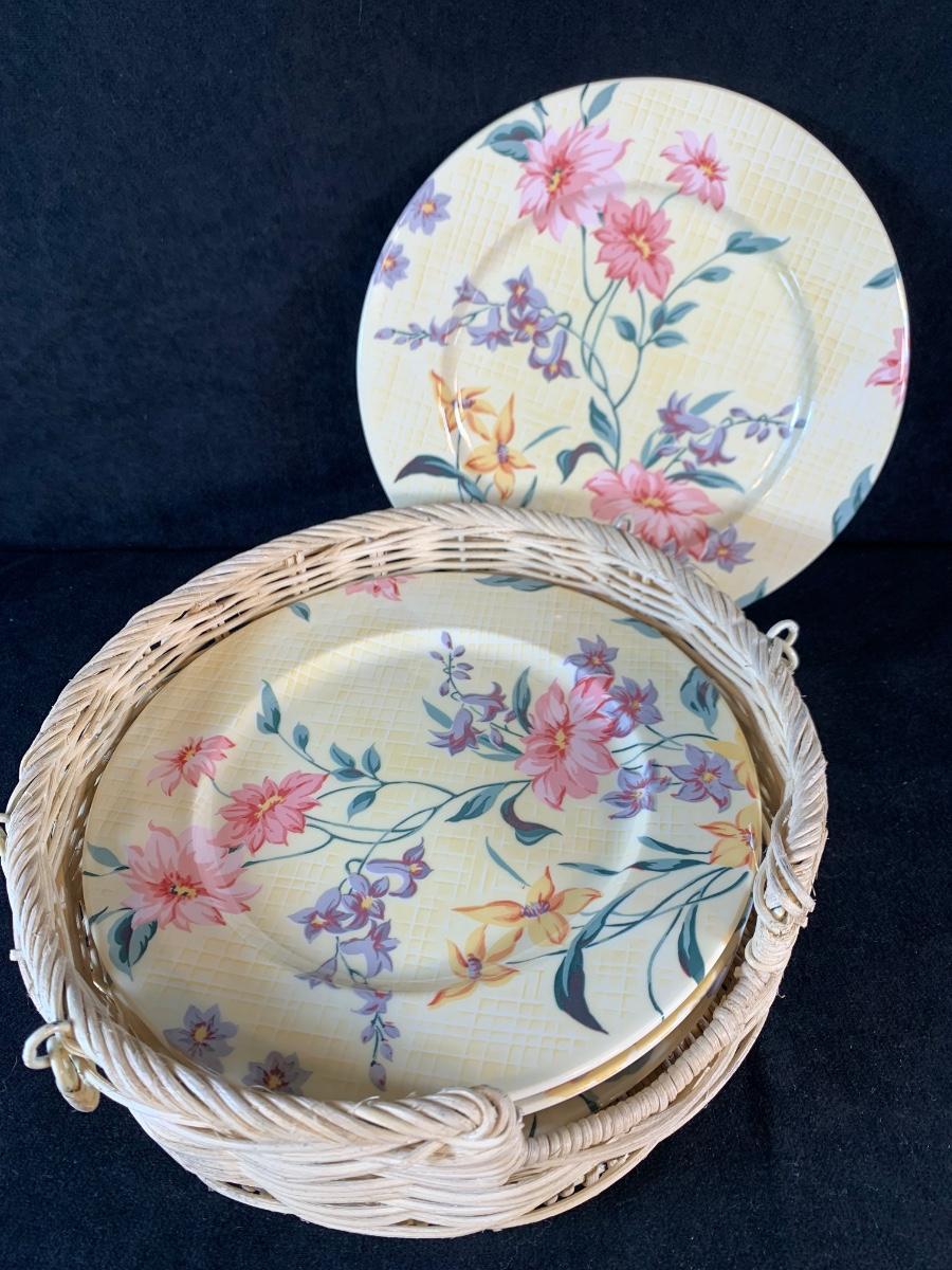 Lenox European Garden Collection set of 4 plates in a wicker holder with a Faianca Subtil Portugal platter with fruit.