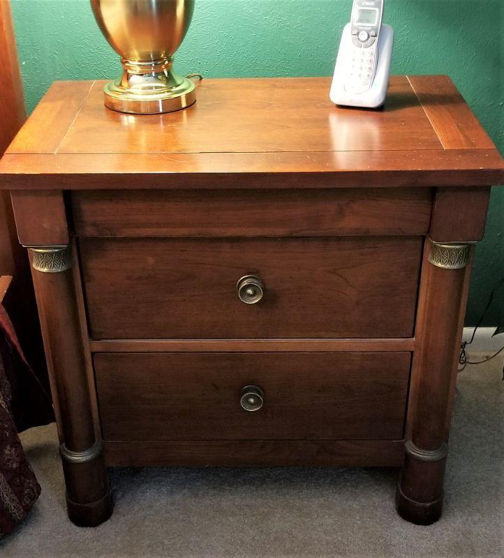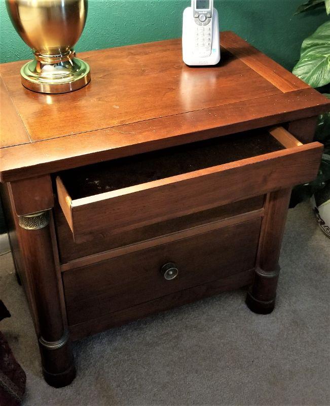 Very nice nightstand (matches the bed) from the Lexington Furniture Company. Features a cunning little hidden drawer at the top. Good used condition. Measures 26.5" tall, 18" deep, and 28" wide.