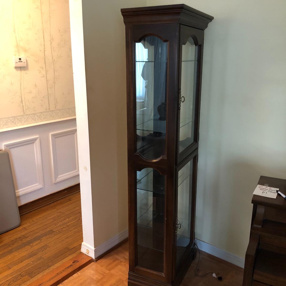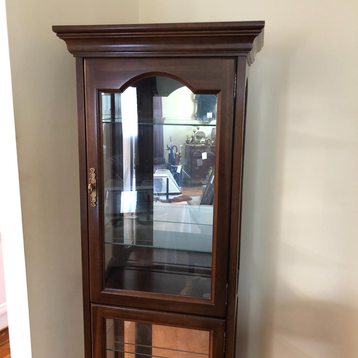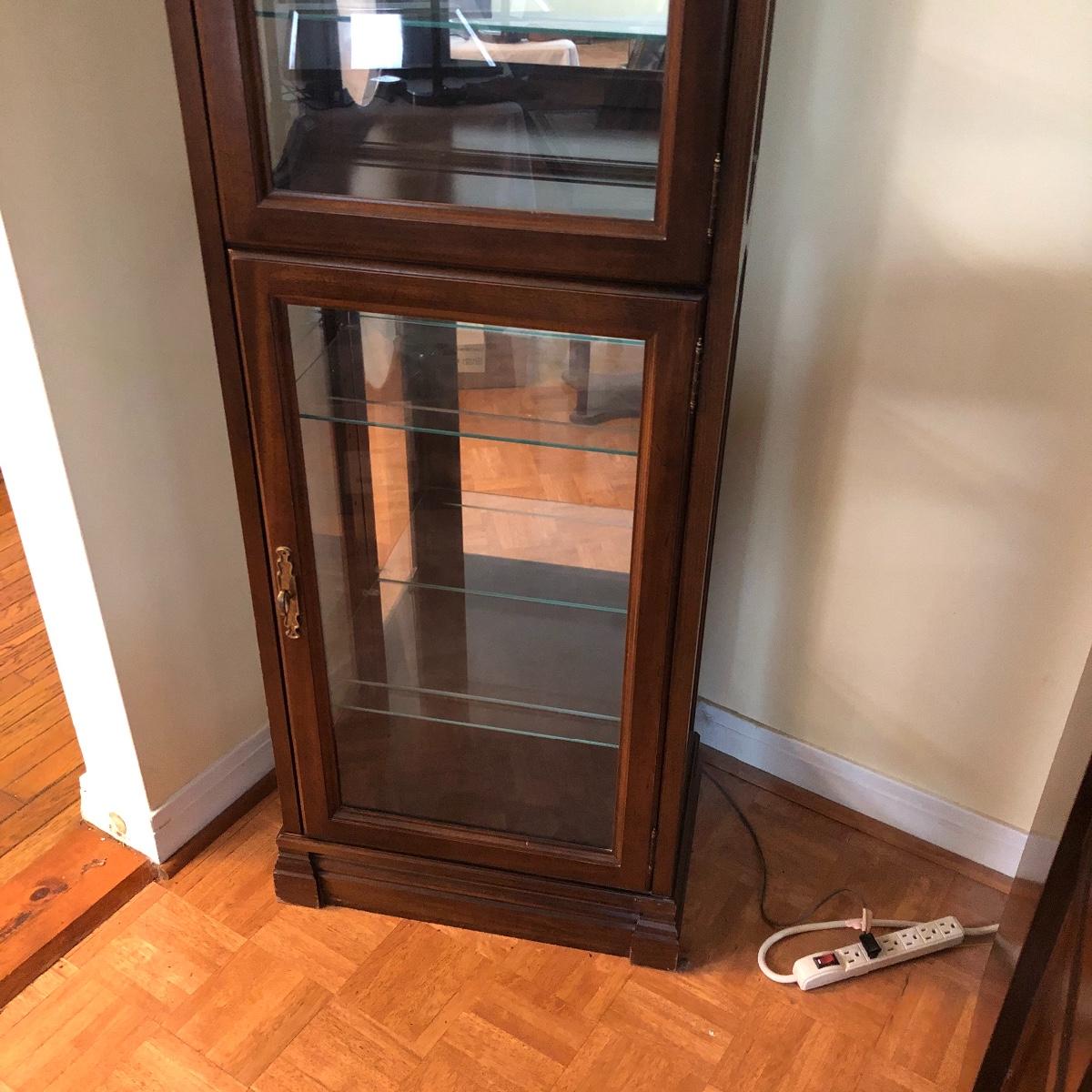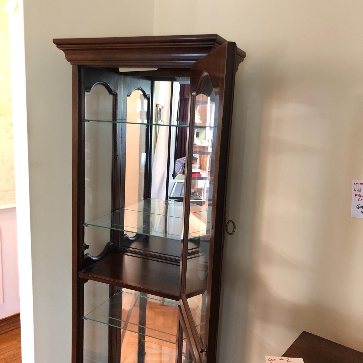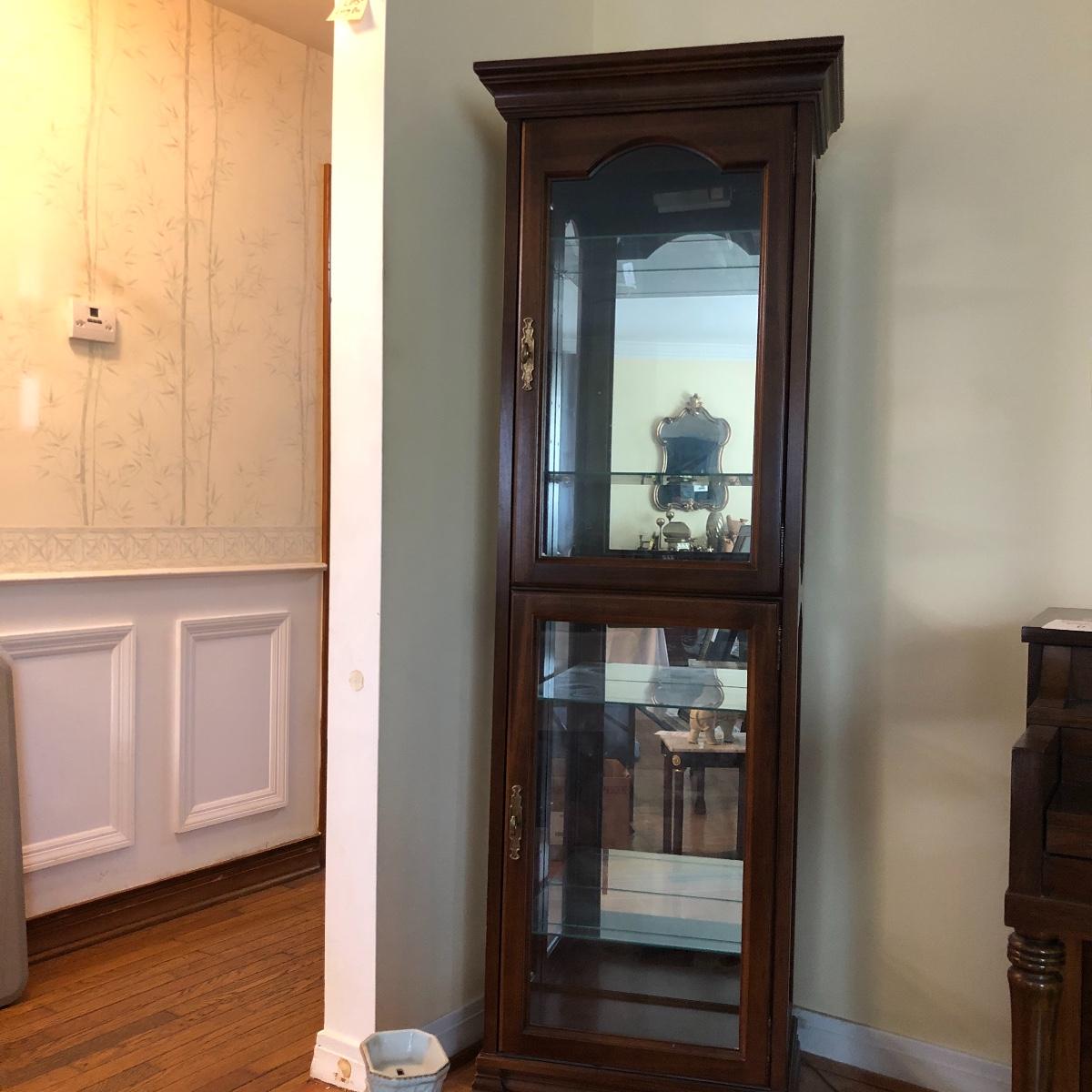 Jasper lighted Curio cabinet has four adjustable glass shelves with plate rails. Top and bottom sections each has its own light. Mirrored back on each section. Cabinet is wood and has plastic windows.