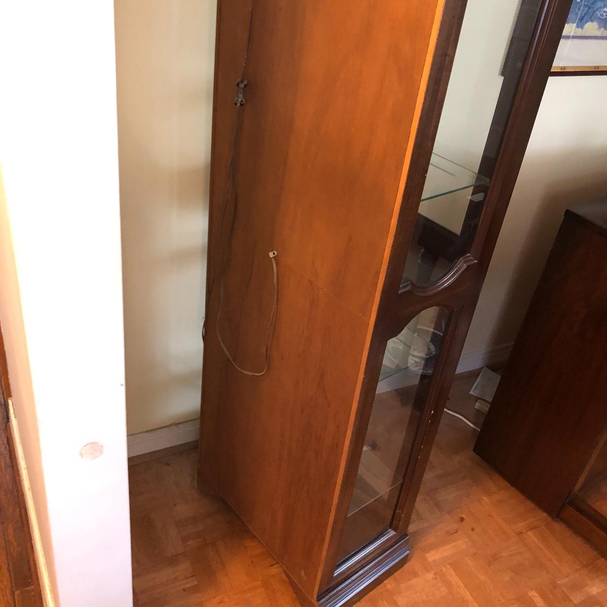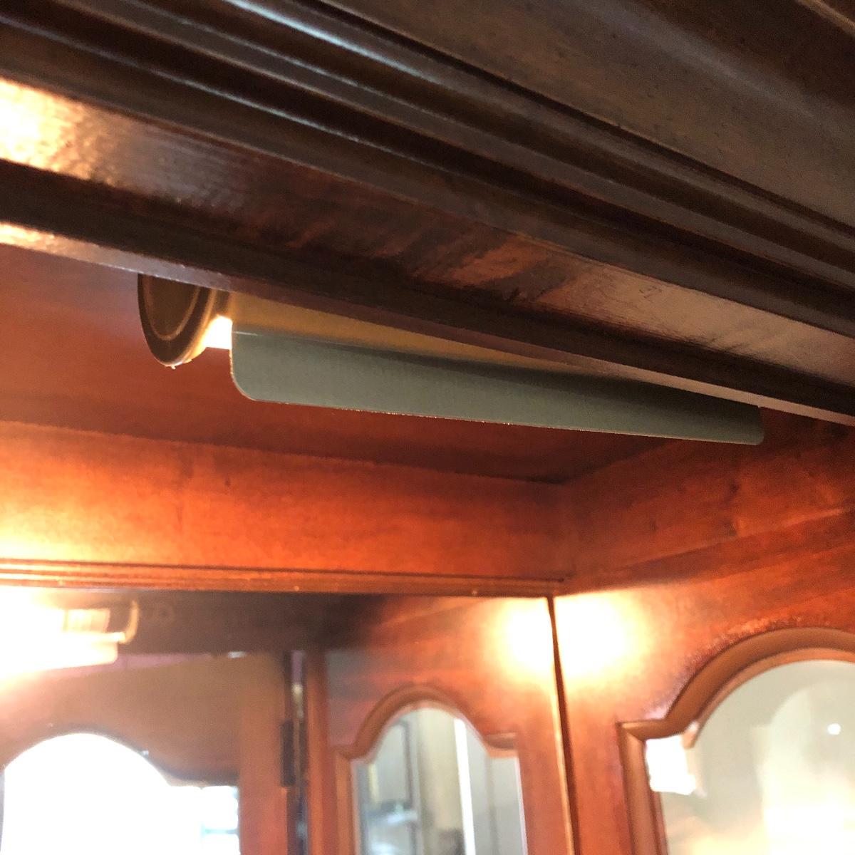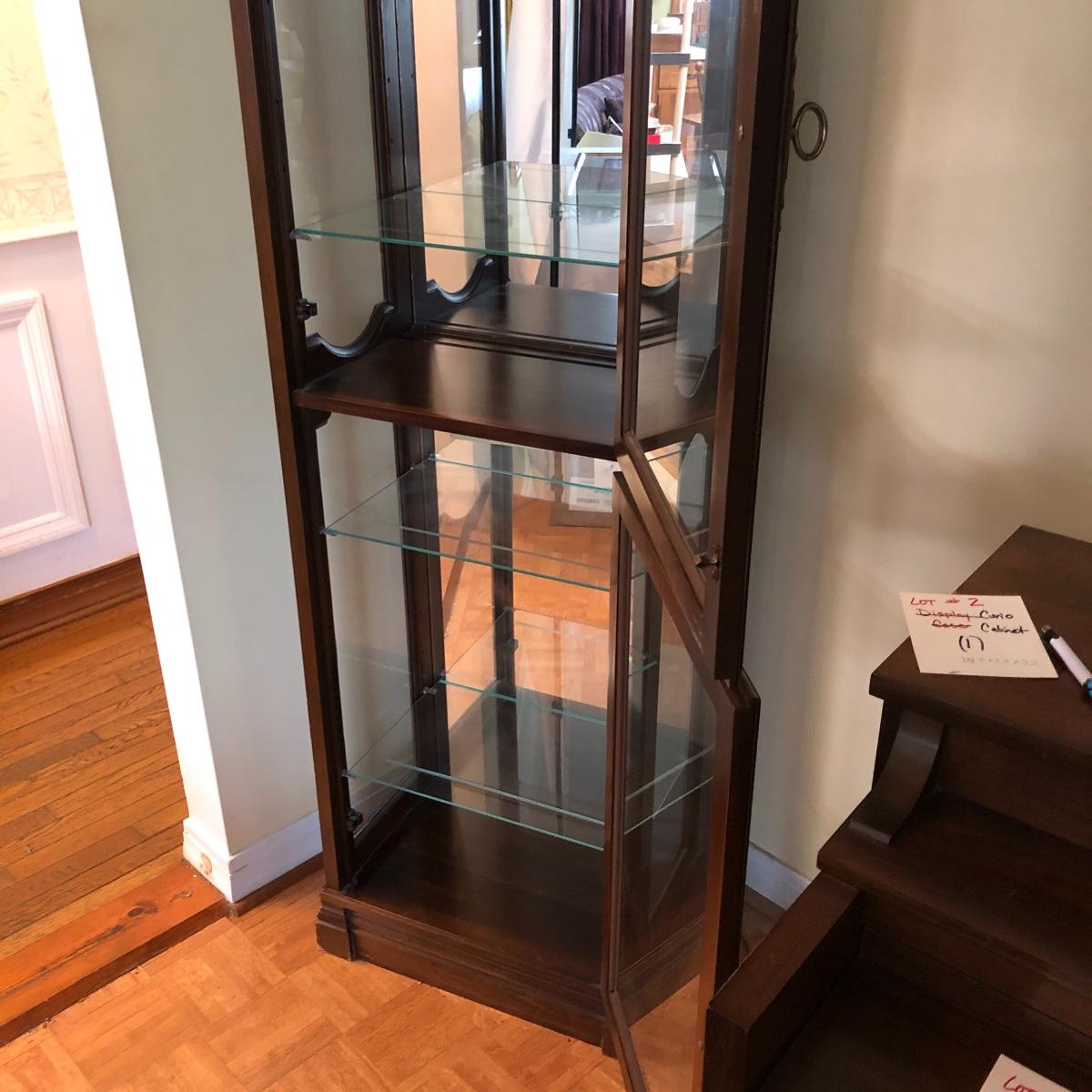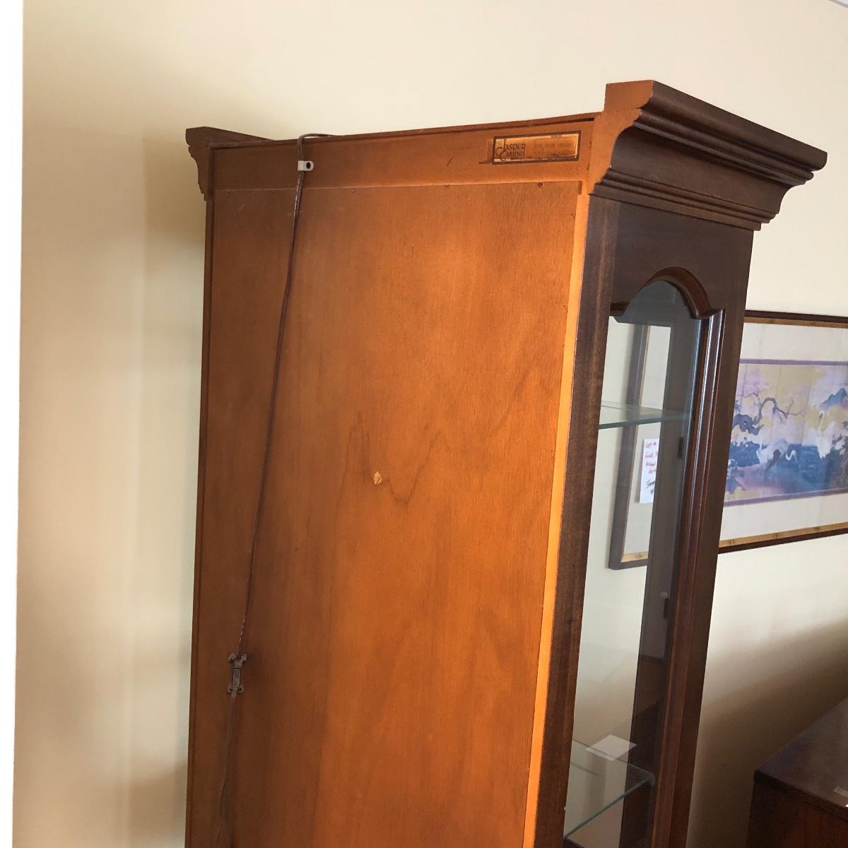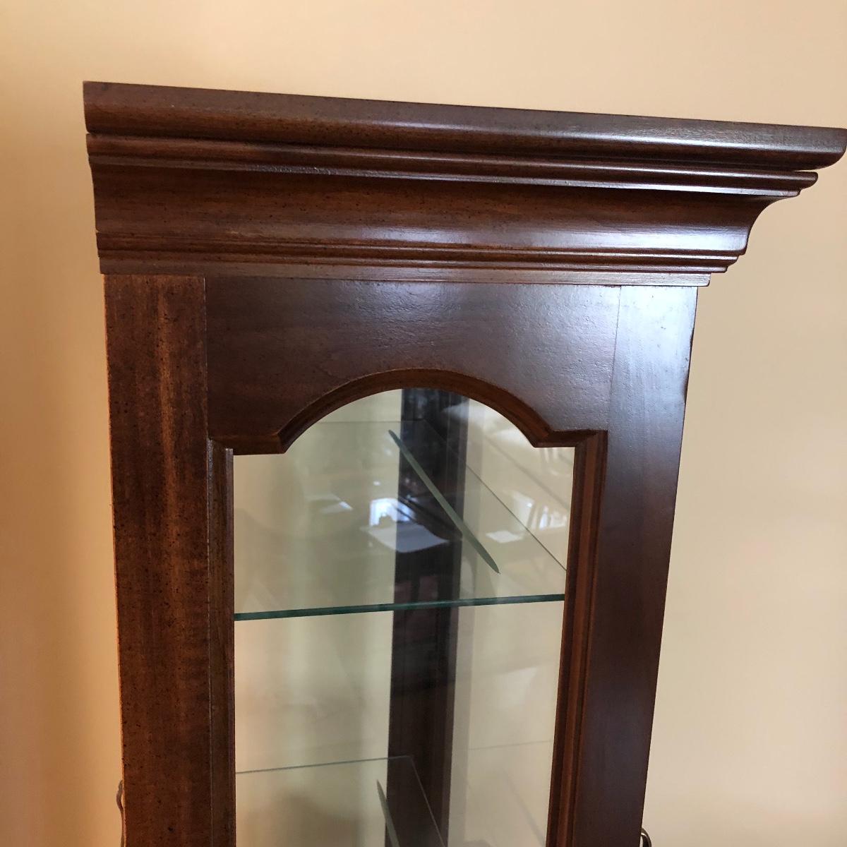 Jasper lighted Curio cabinet has four adjustable glass shelves with plate rails. Top and bottom sections each has its own light. Mirrored back on each section. Cabinet is wood and has plastic windows.