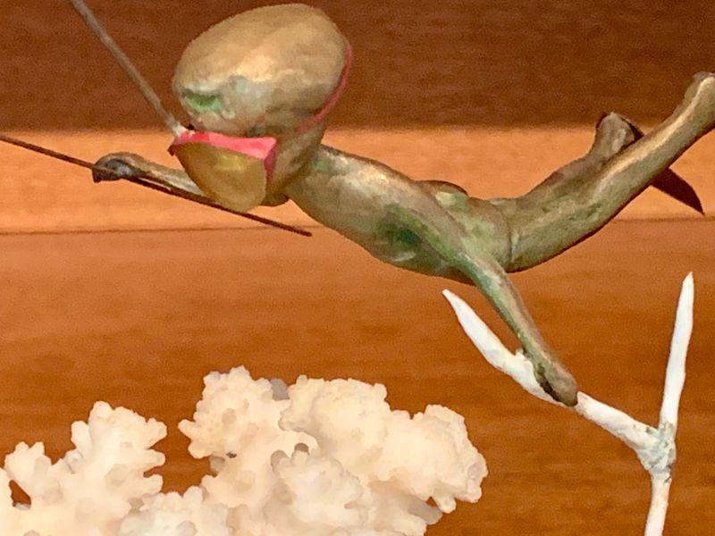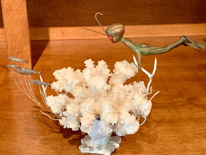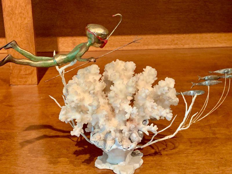 Bronze and white coral animated sculpture by Malcom Moran of Carmel, Ca. Signed and dated, 1971. Child scuba diver swims suspended the coral while fishies swim out the other side. A charming example of this artist's work, known for his portrayal of children and the marriage of metal and natural elements.