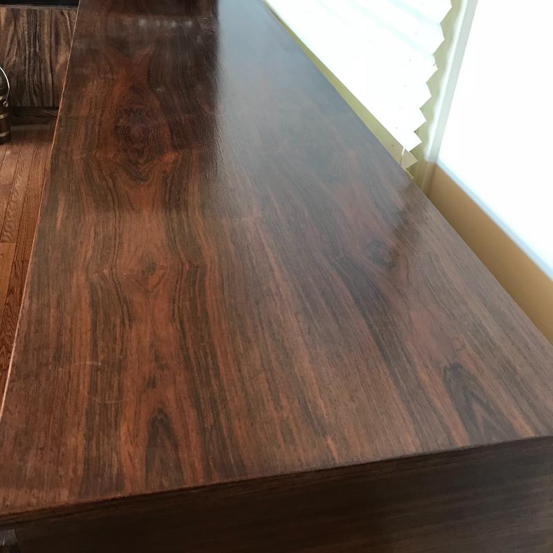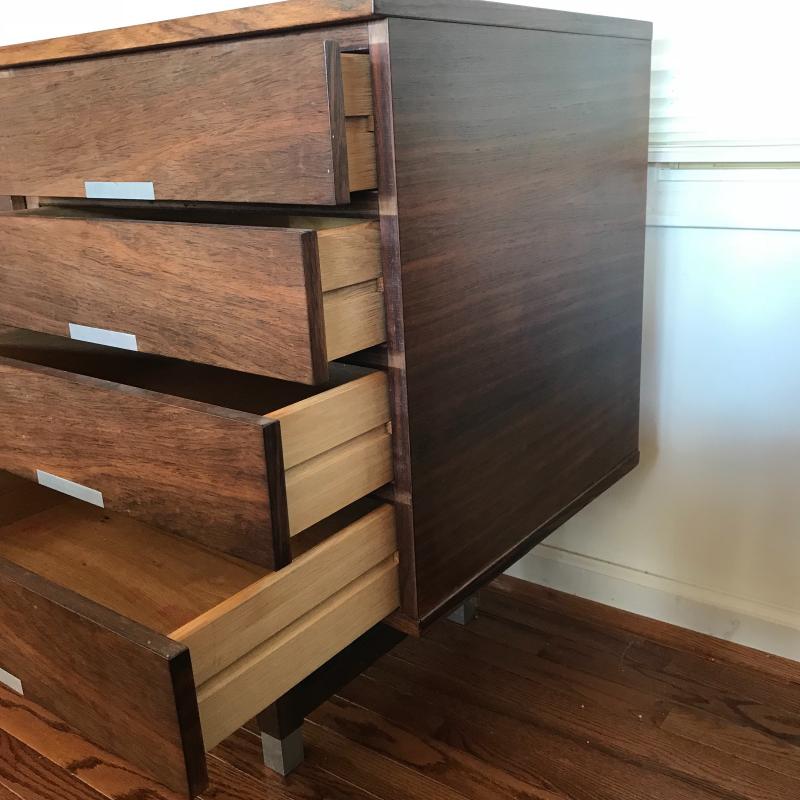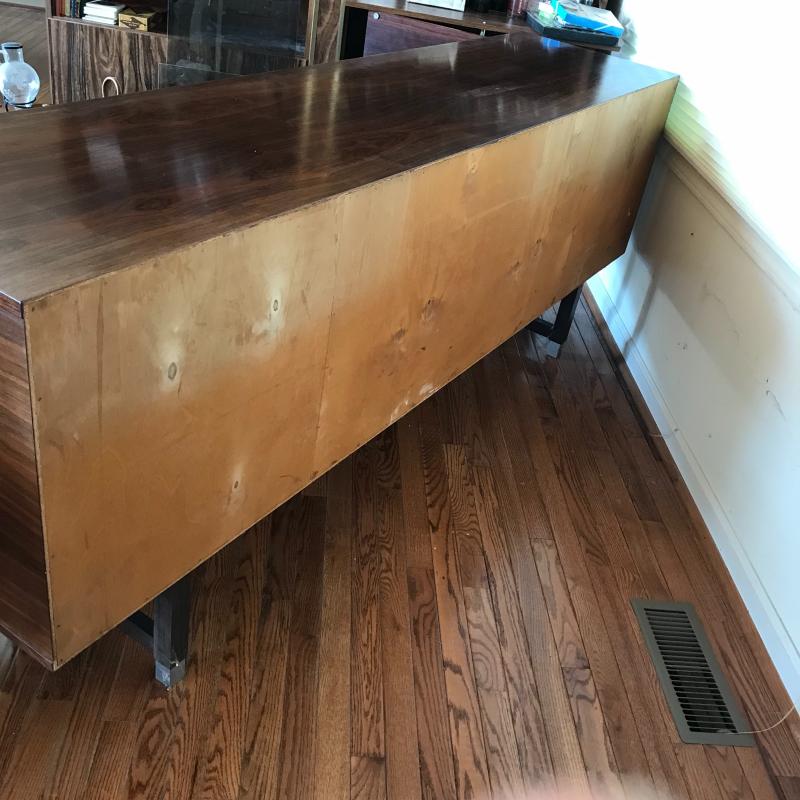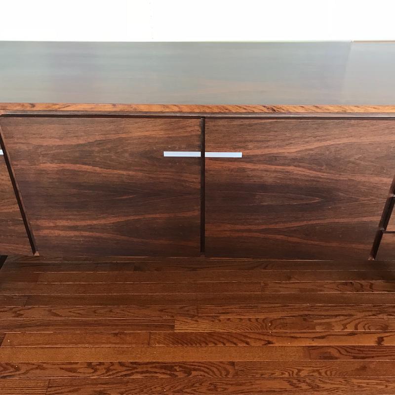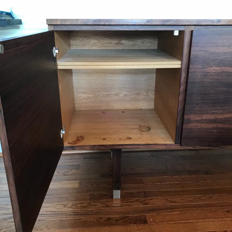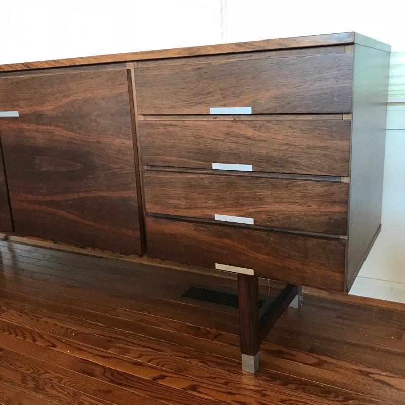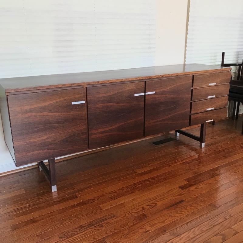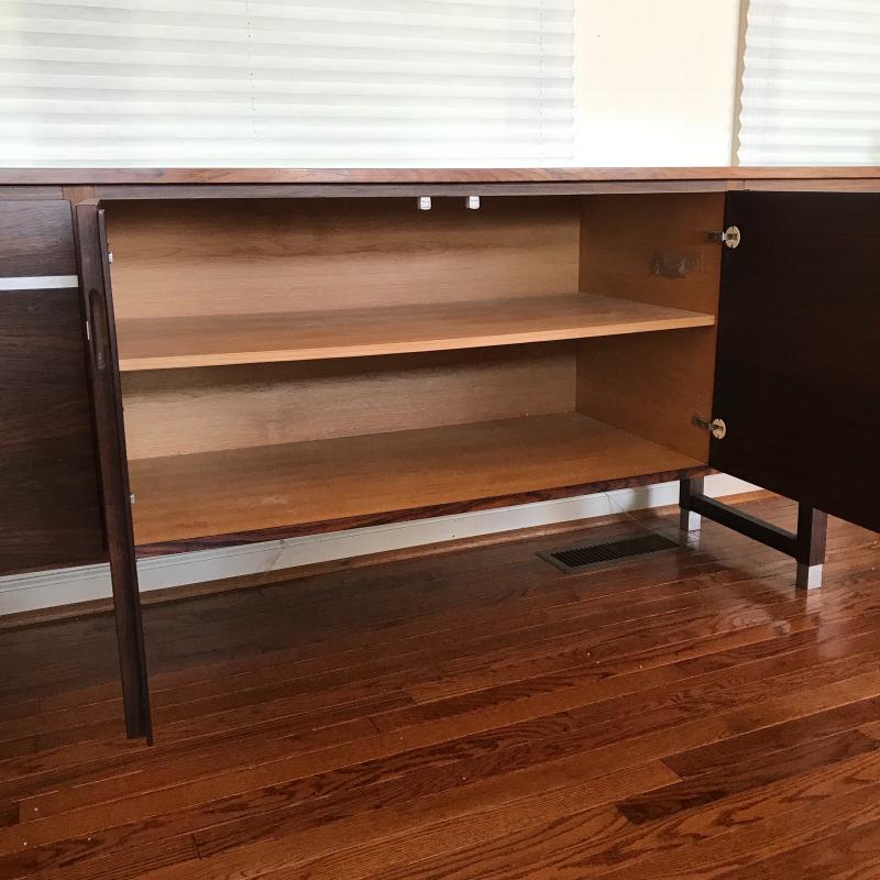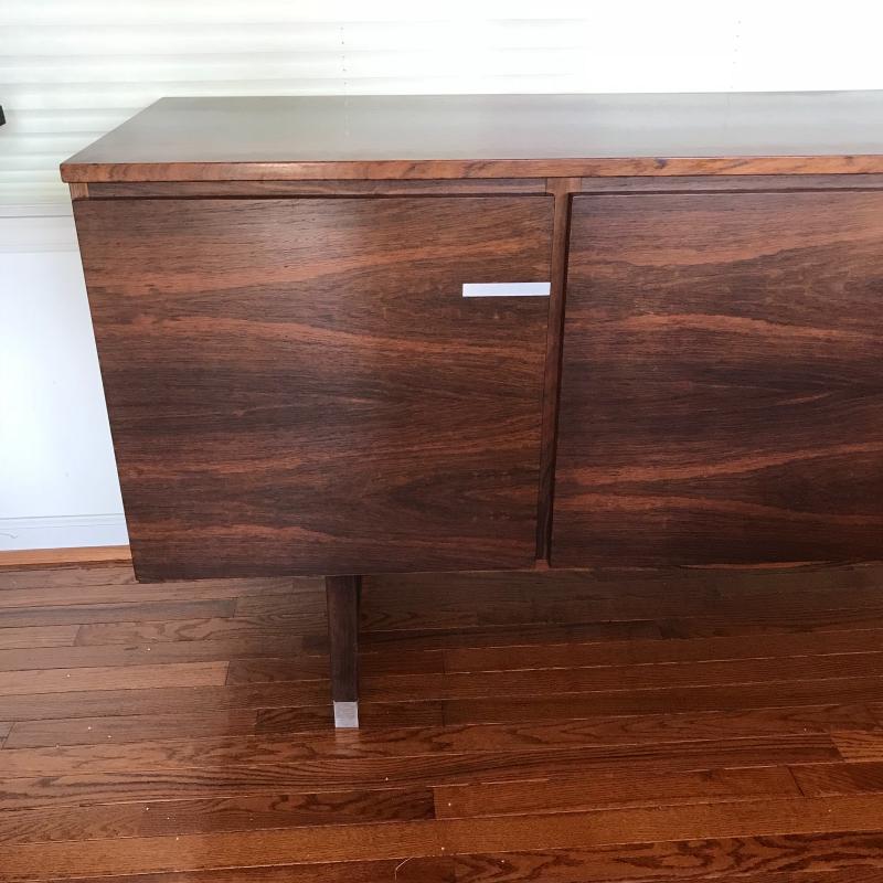 Large MCM style buffet cabinet with silver hardware and feet. Piece is sturdy and in great shape. Extra pegs for second shelf in smaller cabinet shown in photos taped to the inside wall. Piece is large at 72.75” x 19.75” x 32.5”. Please bring help to load as piece is heavy and there are four steps from house to driveway.
