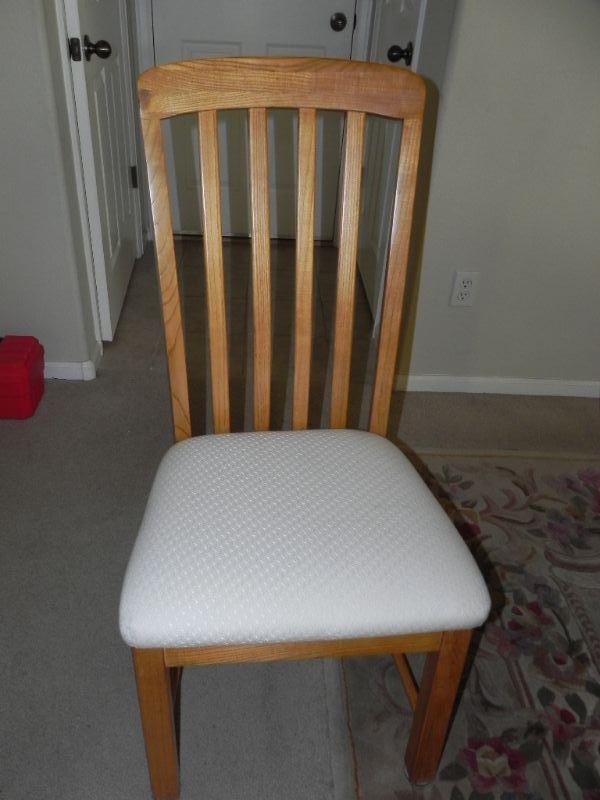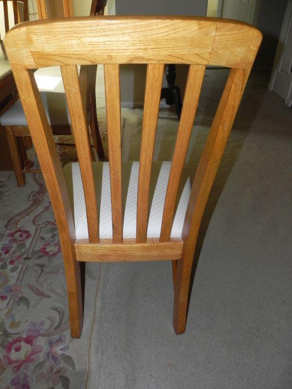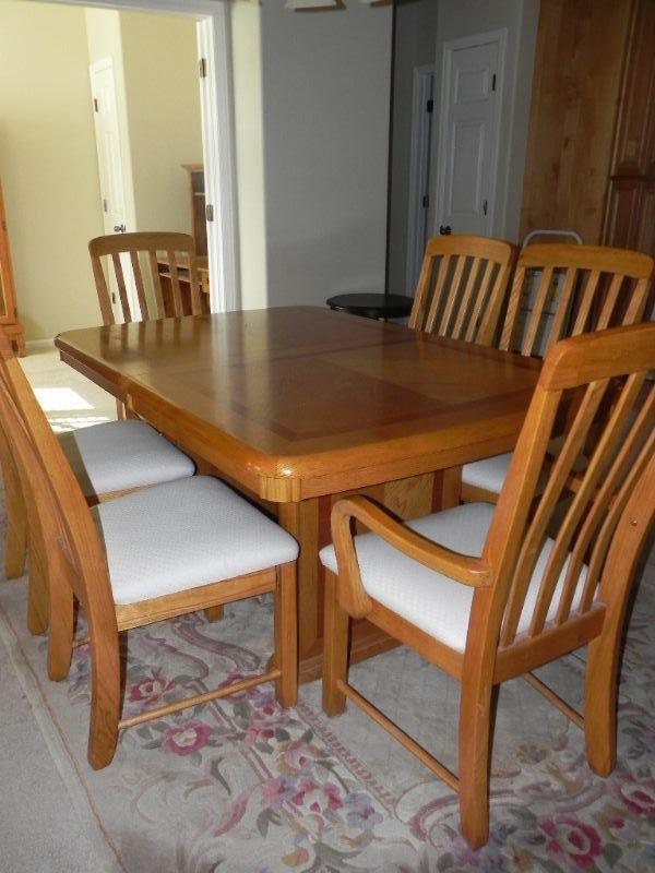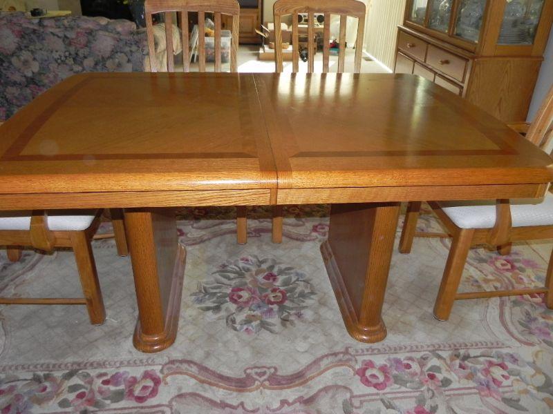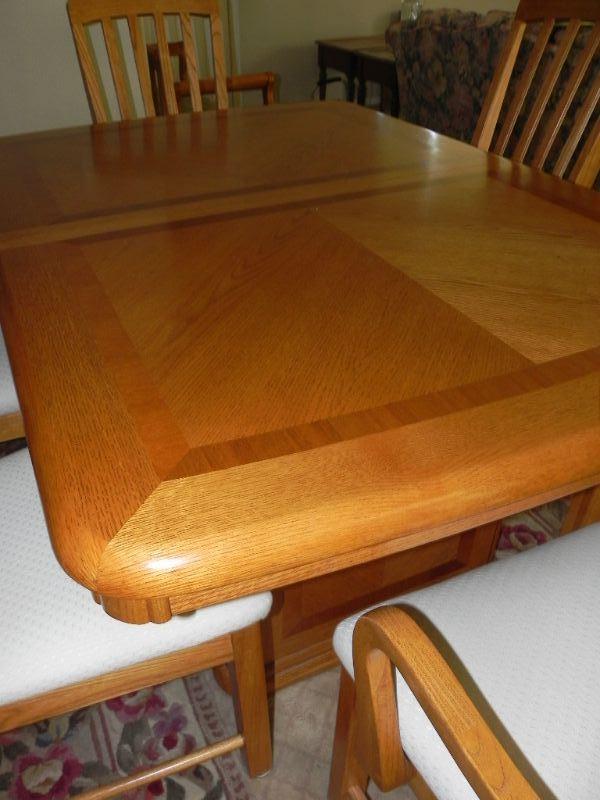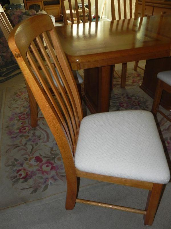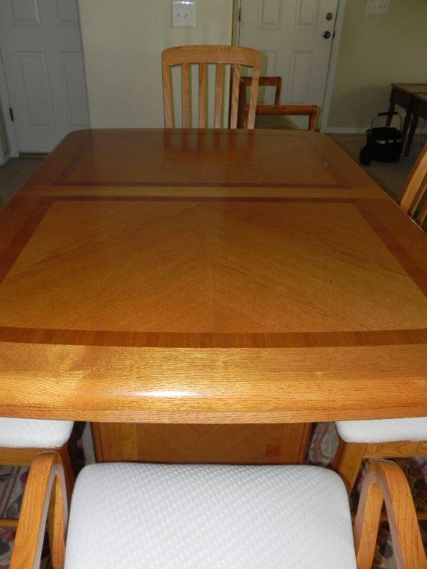 SOLID WOOD INLAID TABLE MEASURES 61"X41" WITH ONE LEAF THAT ADDS ANOTHER 18", MATCHING CHAIRS WITH UPHOLSTERED SEATING 2 ARE CAPTAINS CHAIRS.