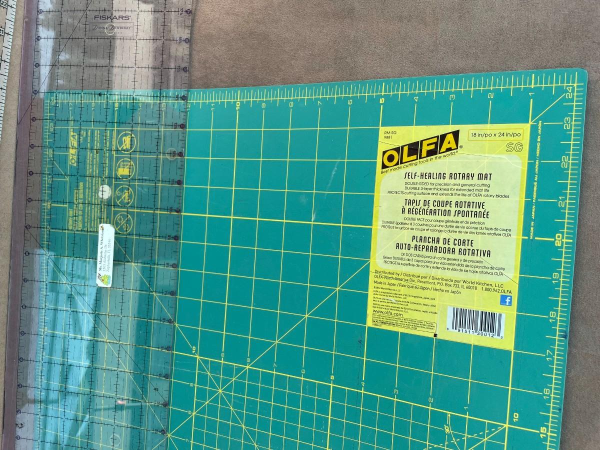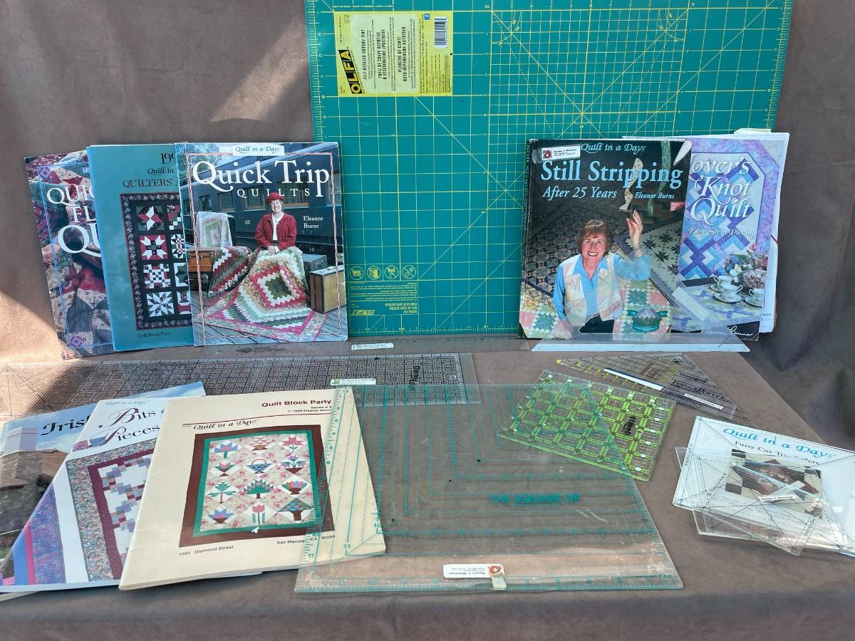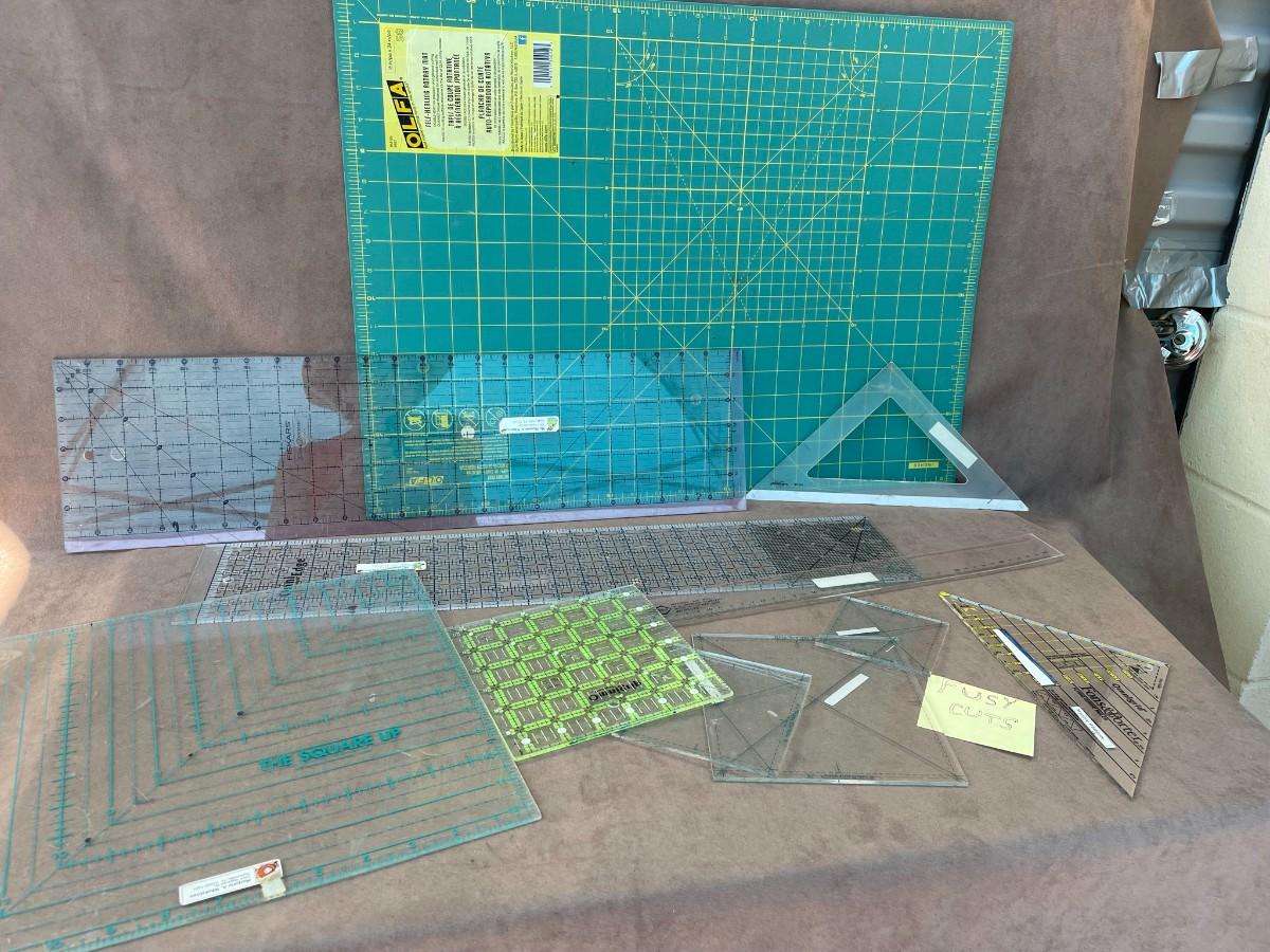 OLFA Self-Healing Rotary Mat, Instruction books and assorted quilting rulers. Good Condition.