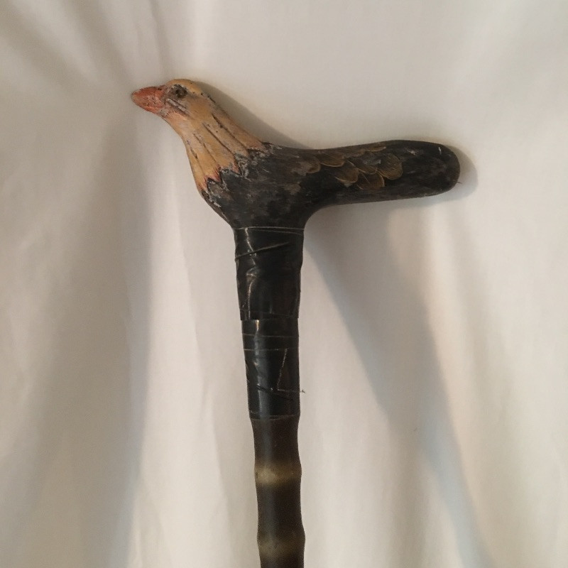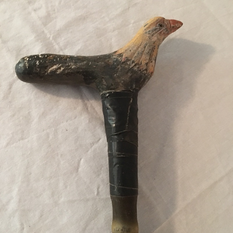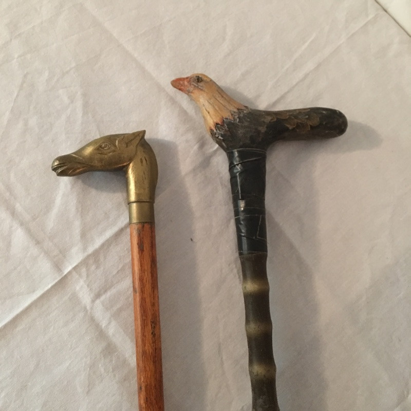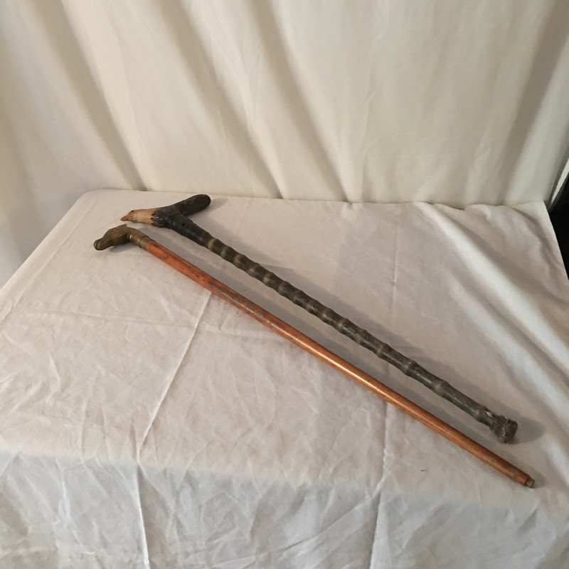 These two walking sticks are both unique. The first cane has a brass horses head and the second cane has a wooden bird for a handle, it does have some black tape around the top, but seems sturdy. Walk out in style with either of these two lovely sticks.