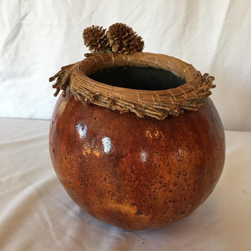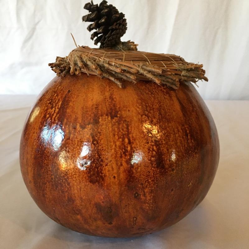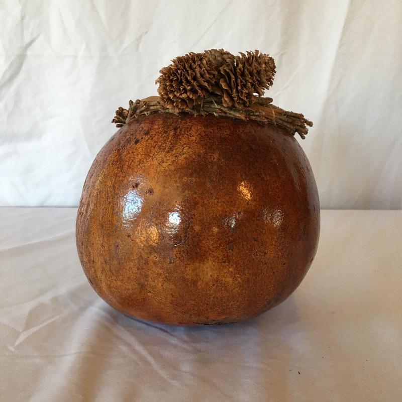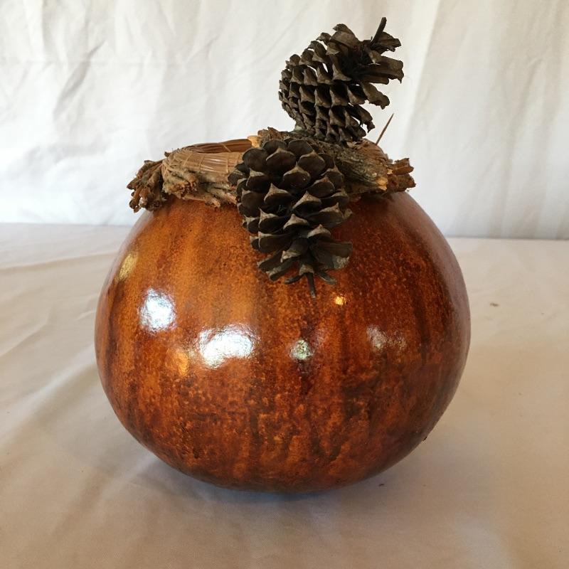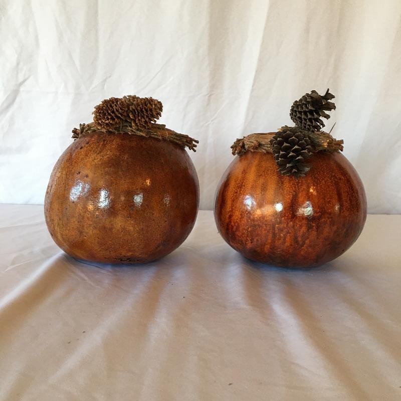 This pair of gourds are from Susie Q Gourds and signed on bottom. These gourds are adorned with pine needles and small pine cones. Largest gourd measures 7”D x 8” tall. Great Fall Decor!