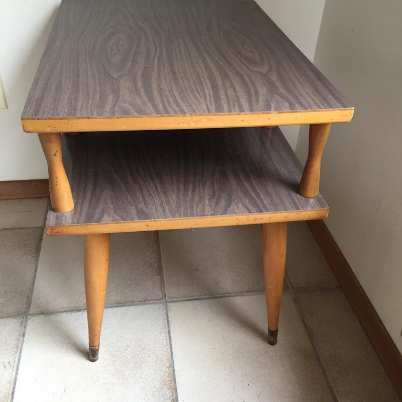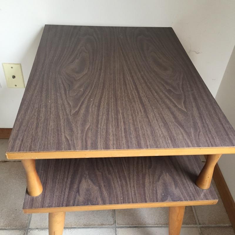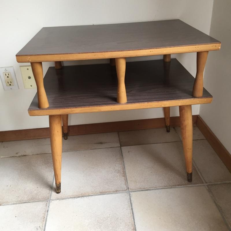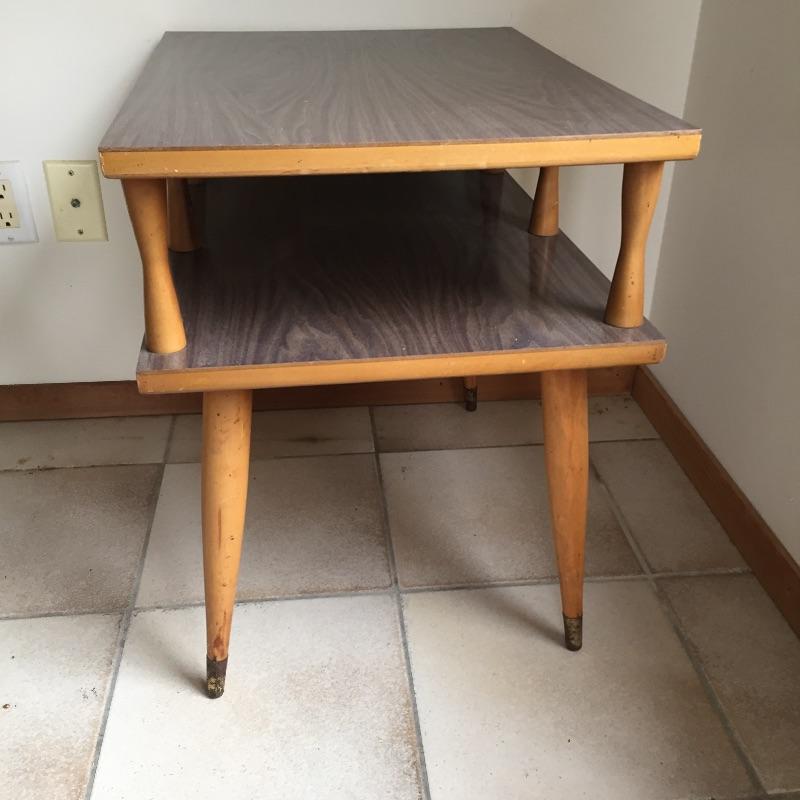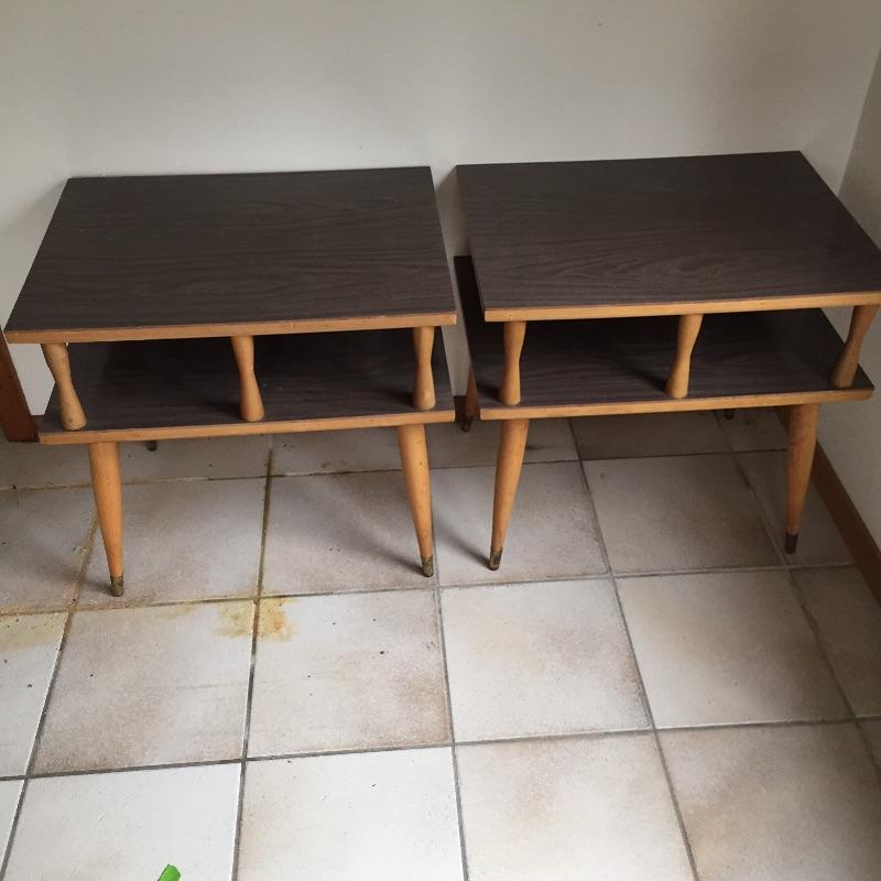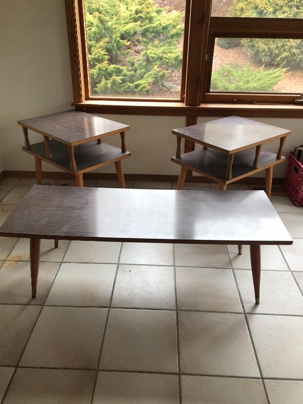Trendy pair of Mid Century style end tables. Cool decor for any room. Tables are wooden with Formica tops. Legs are removable. End tables measure 17.75” x 23.50” x 22”. Coffee table measures 17.5” x 47.75” x 15.5”.