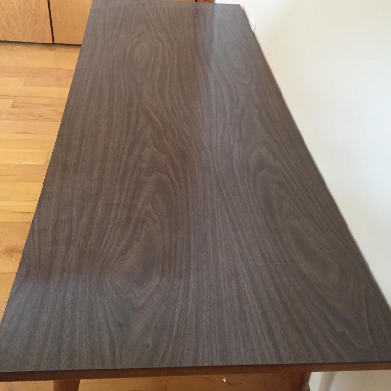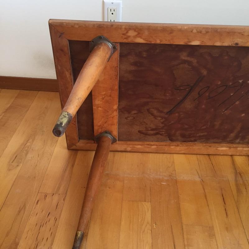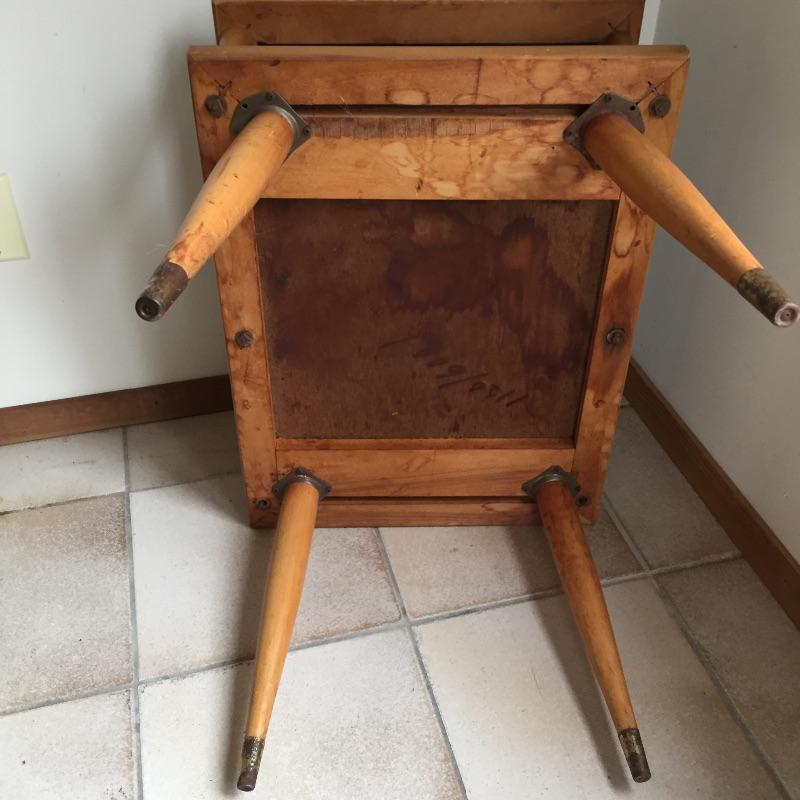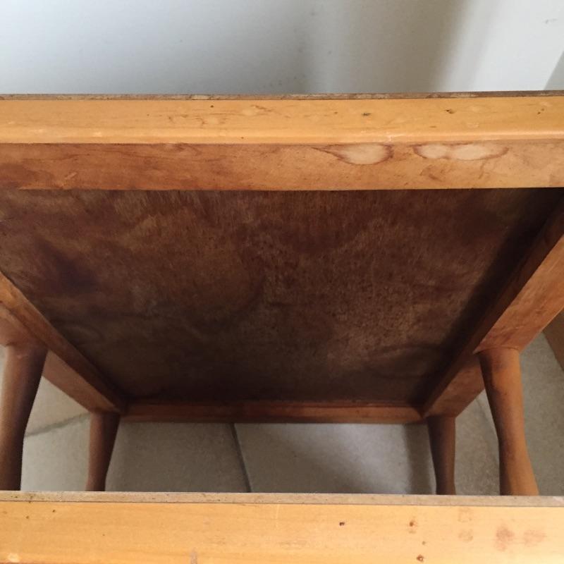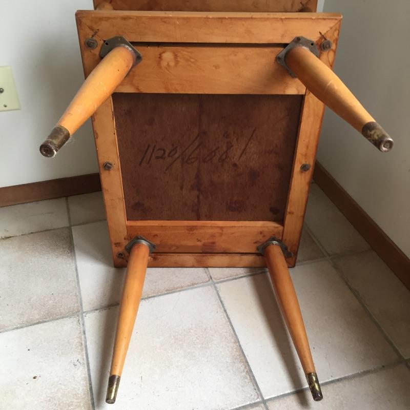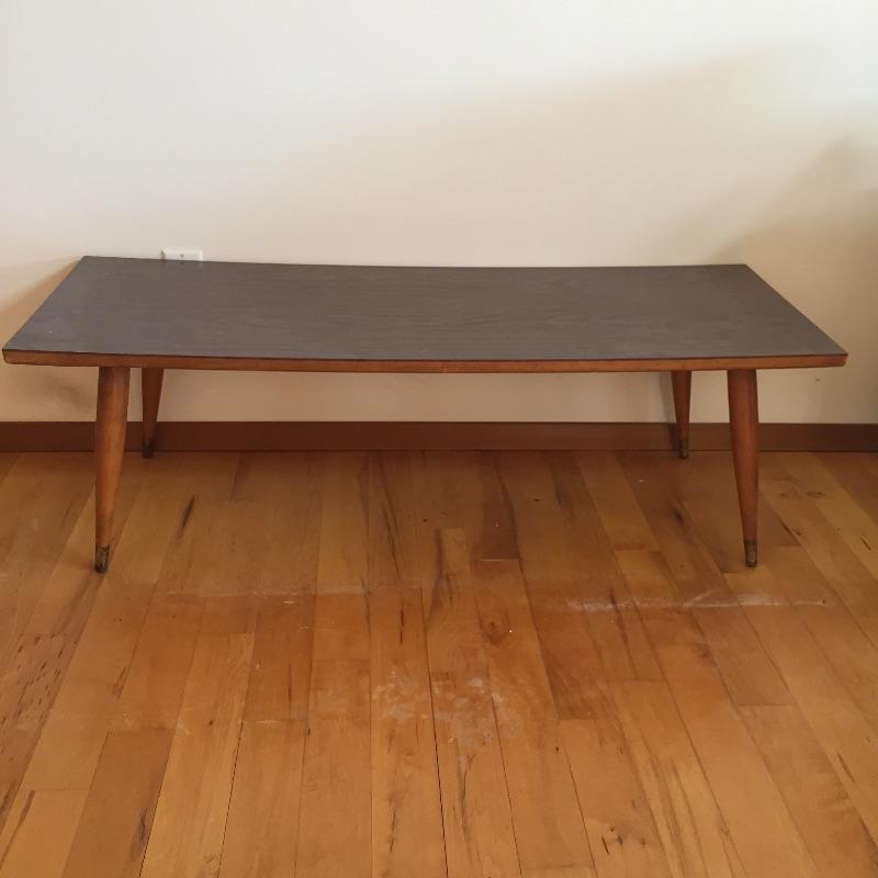 Trendy pair of Mid Century style end tables. Cool decor for any room. Tables are wooden with Formica tops. Legs are removable. End tables measure 17.75” x 23.50” x 22”. Coffee table measures 17.5” x 47.75” x 15.5”.