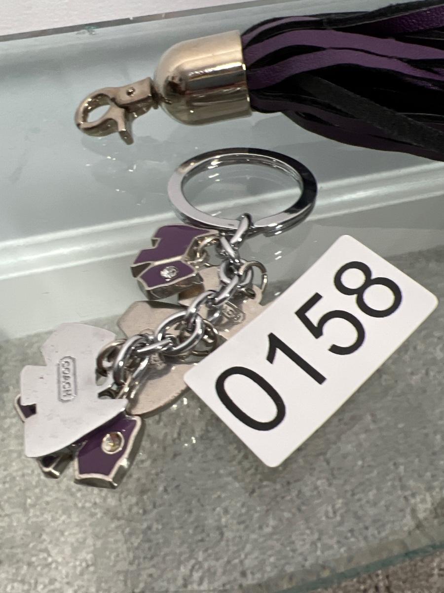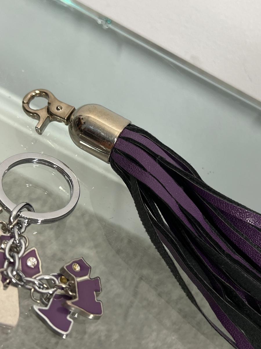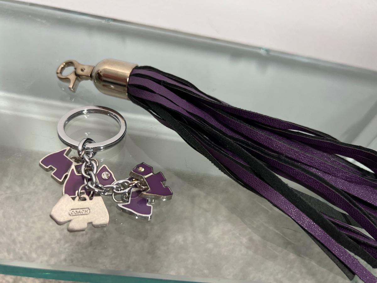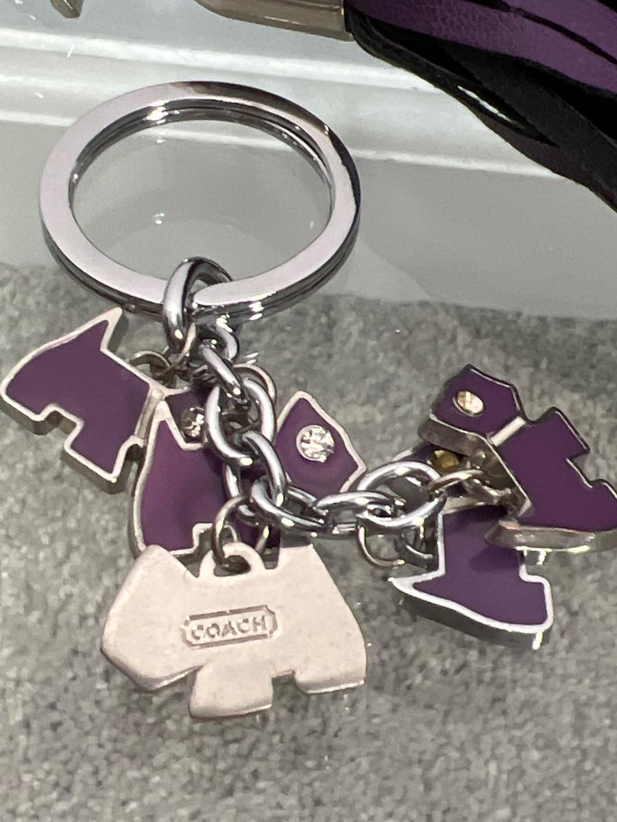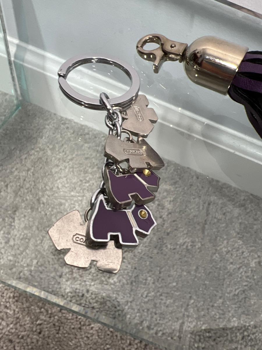 Silver toned and purple 4 scotty dogs with rhinestone eyes, stamped coach on back of each dog. Purple leather suede with silver tone hardware tassel charm. No tag or brand