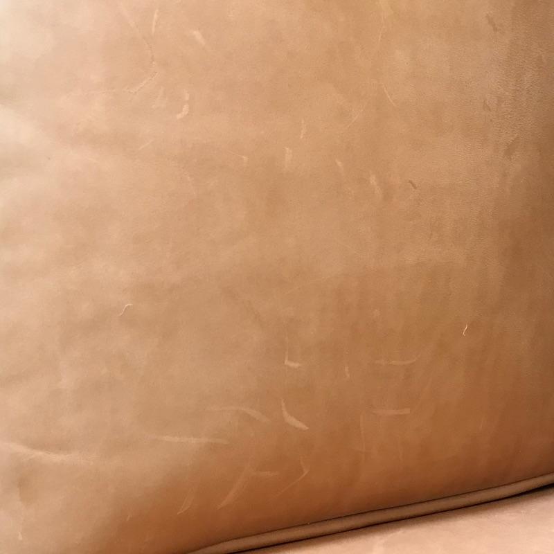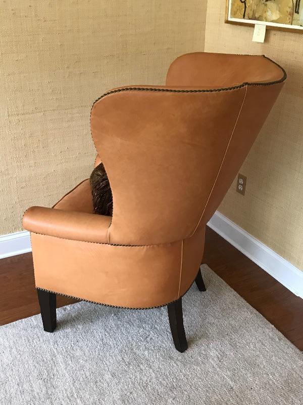 Chair is leather and a dark Camel color and measures 36” wide at the widest point, 44-1/2” tall, 29” deep and has a 19-1/2” seat height, does have some light scratches on cushion. Comes with a small down filled throw pillow with a fox on it and a throw blanket from Jill Collier Design.