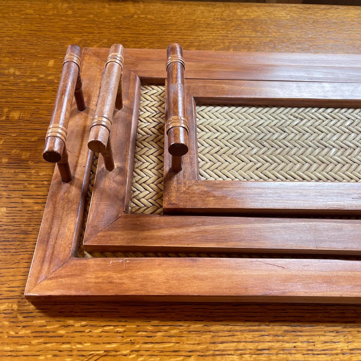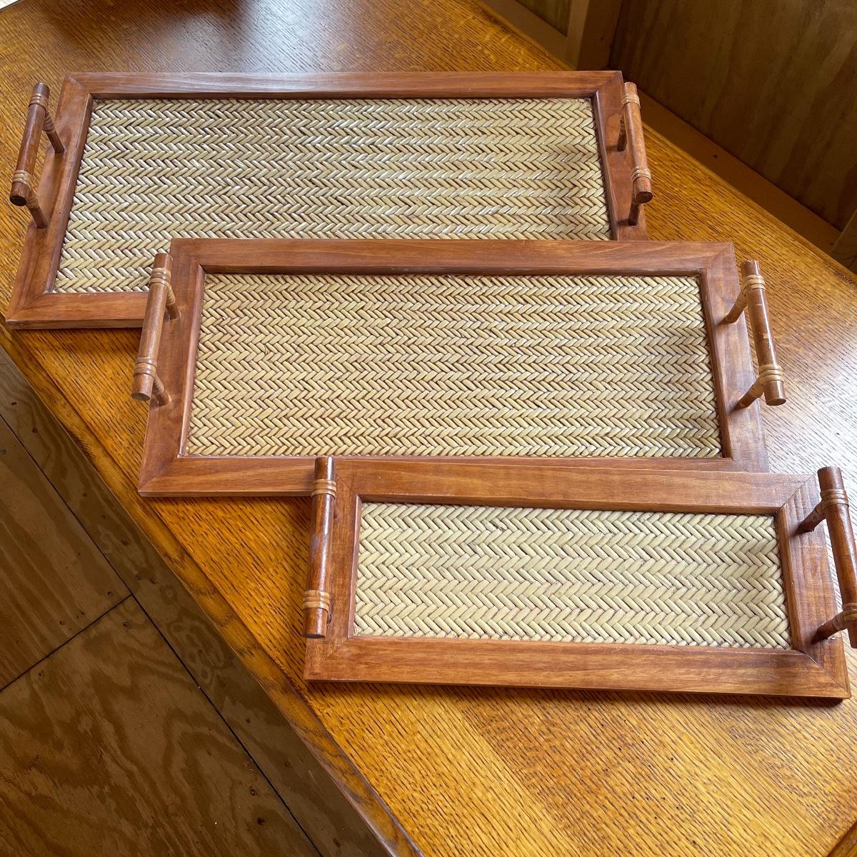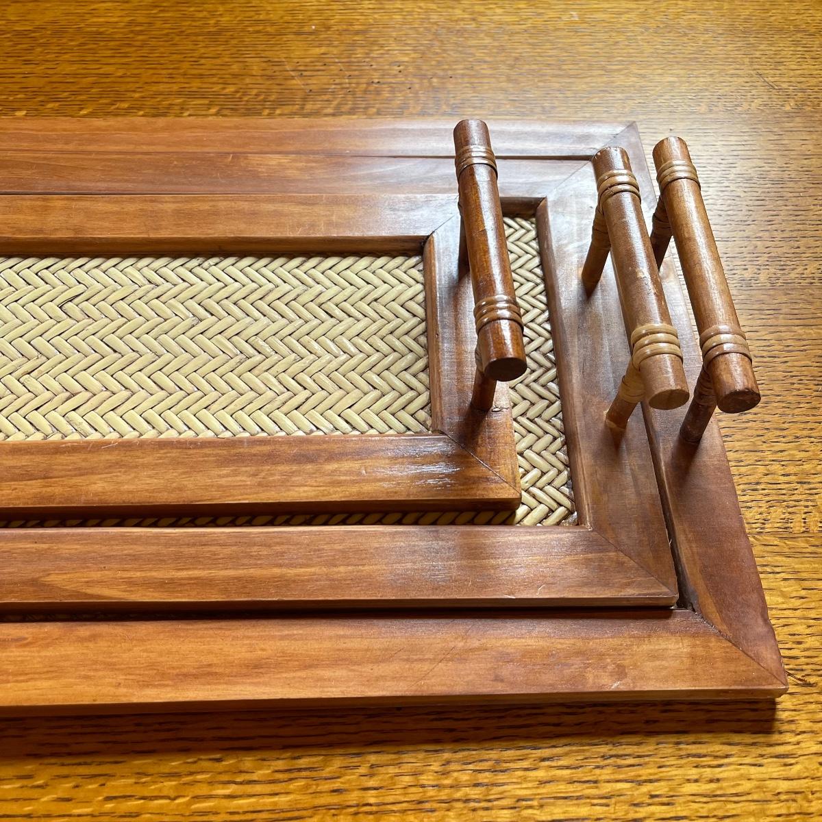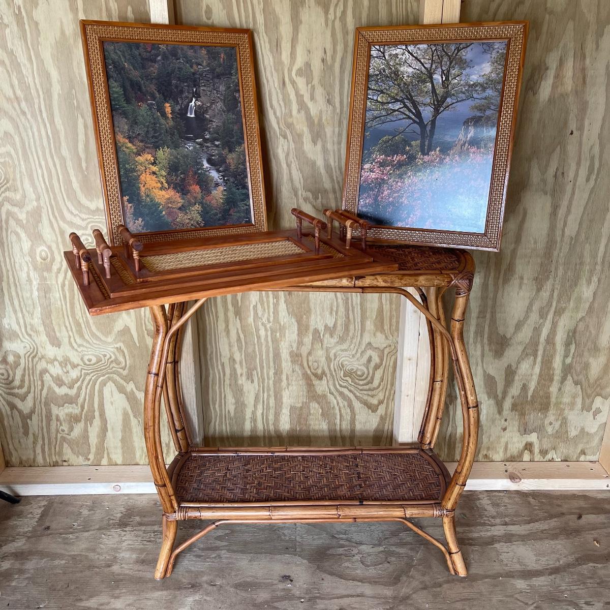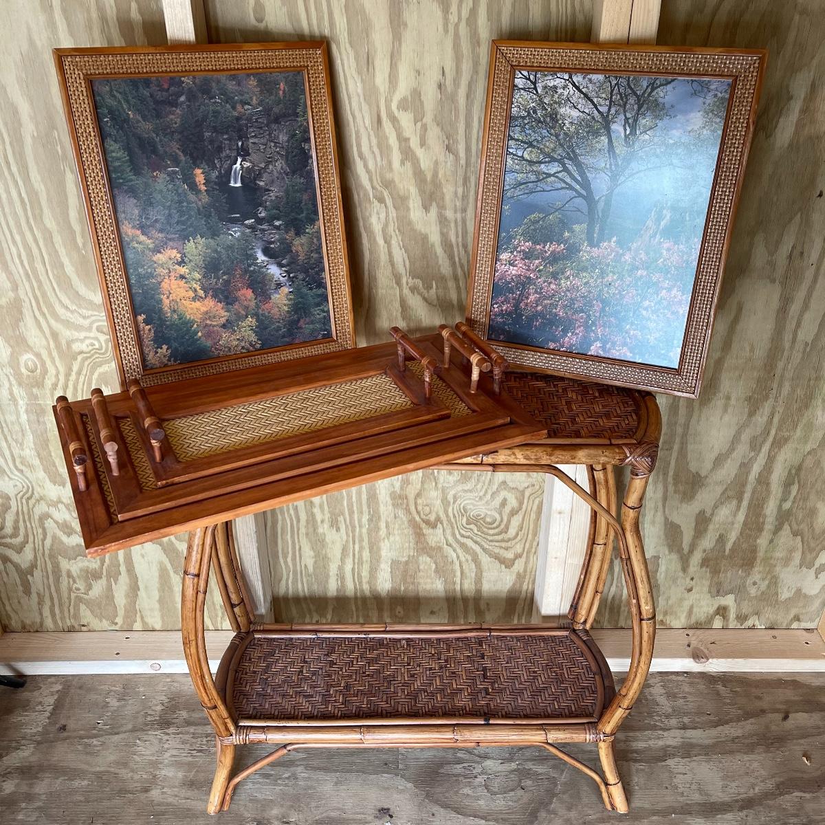 These rattan items include a table, nesting trysts, and art. The artworks in this lot have rattan frames and the nature imagery is of a waterfall and a view from the mountains. They are 14.5” x 18.5”. The nesting tables are a set of three with wooden borders and handles and a rattan surface. Lastly, the slender rattan table in this lot measures 29” x 12.5” x 30.5” at its widest points.