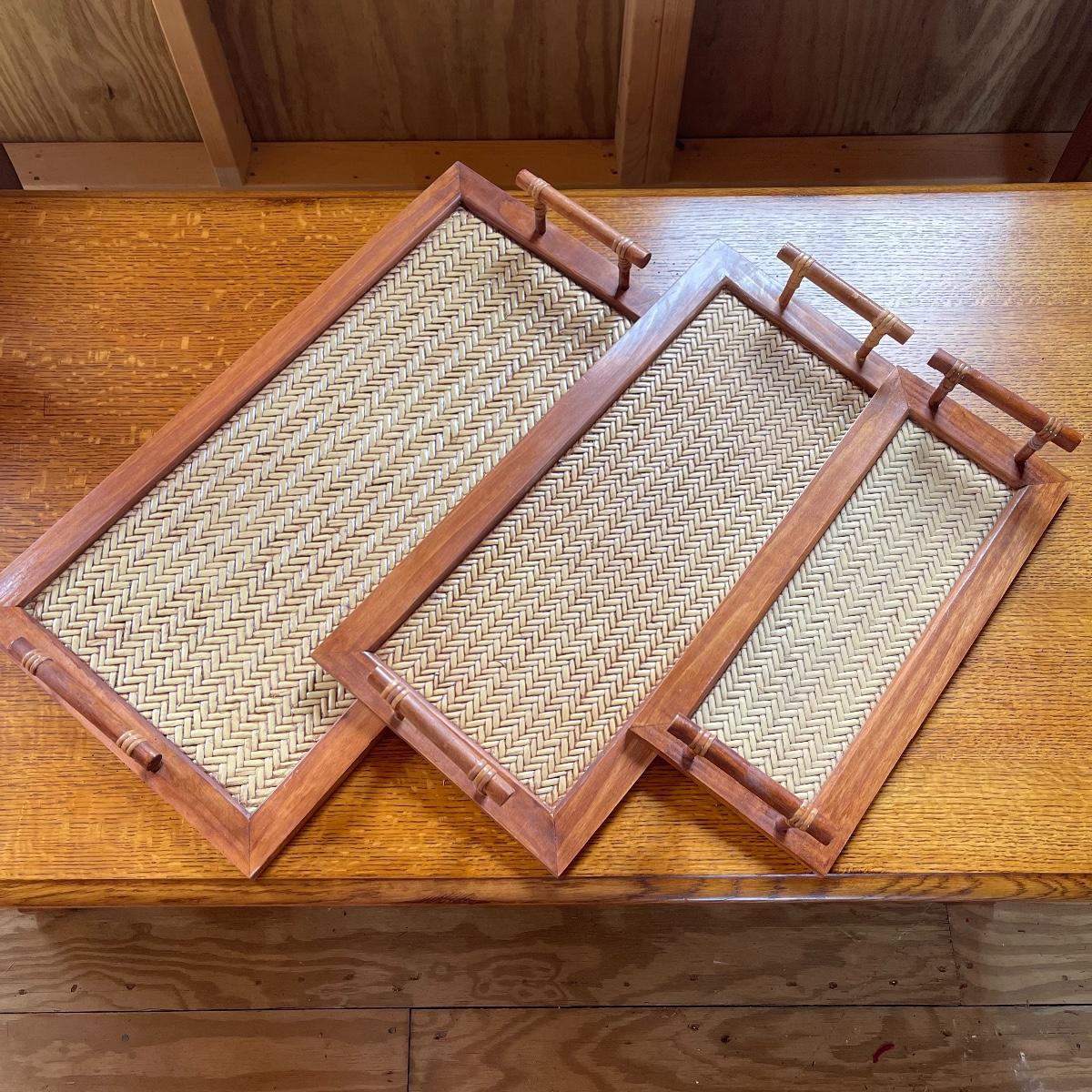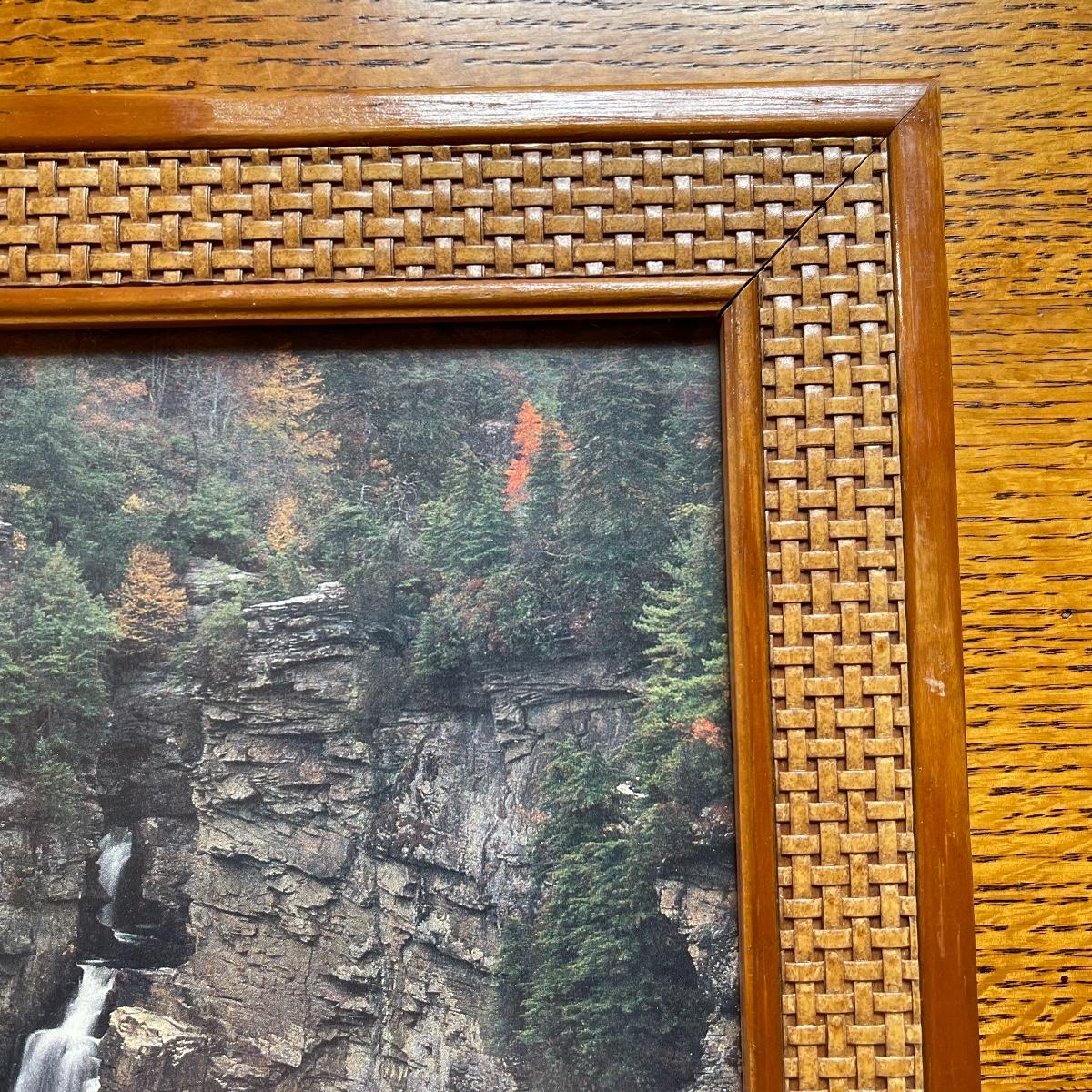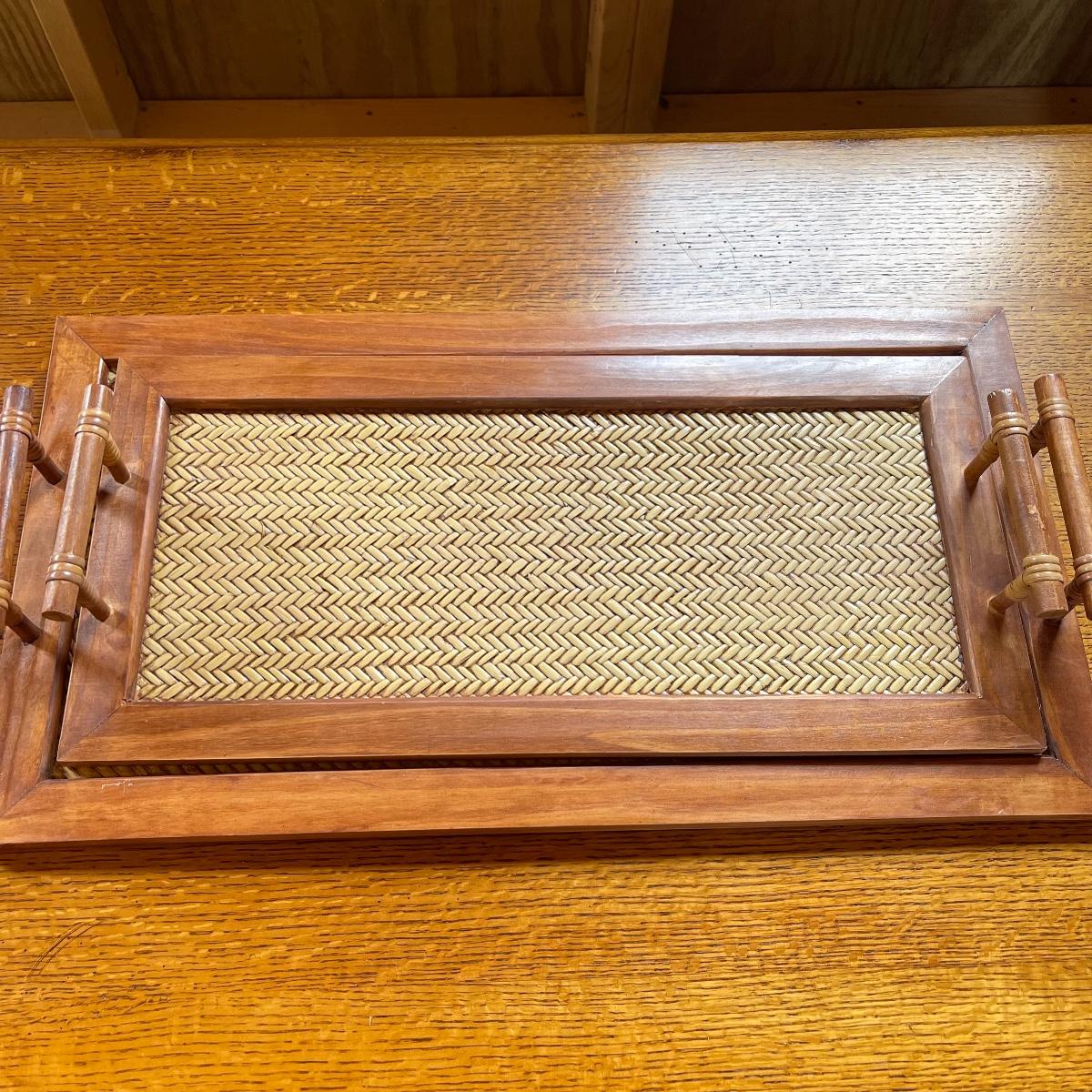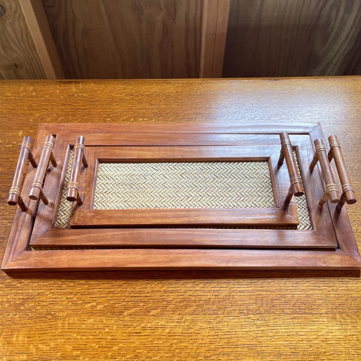 These rattan items include a table, nesting trysts, and art. The artworks in this lot have rattan frames and the nature imagery is of a waterfall and a view from the mountains. They are 14.5” x 18.5”. The nesting tables are a set of three with wooden borders and handles and a rattan surface. Lastly, the slender rattan table in this lot measures 29” x 12.5” x 30.5” at its widest points.