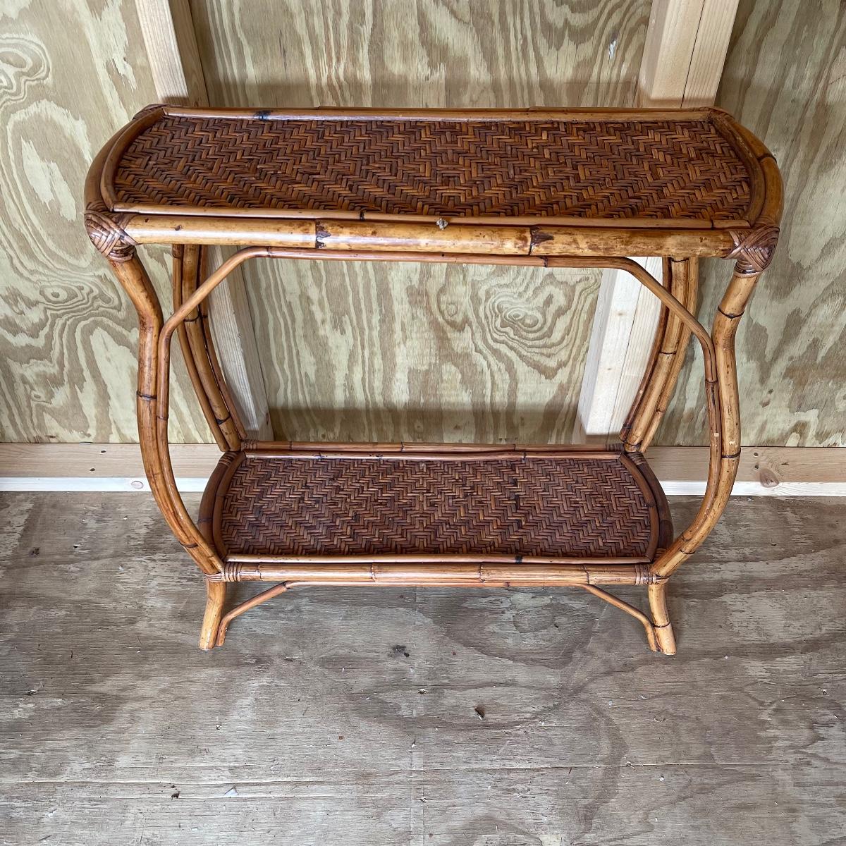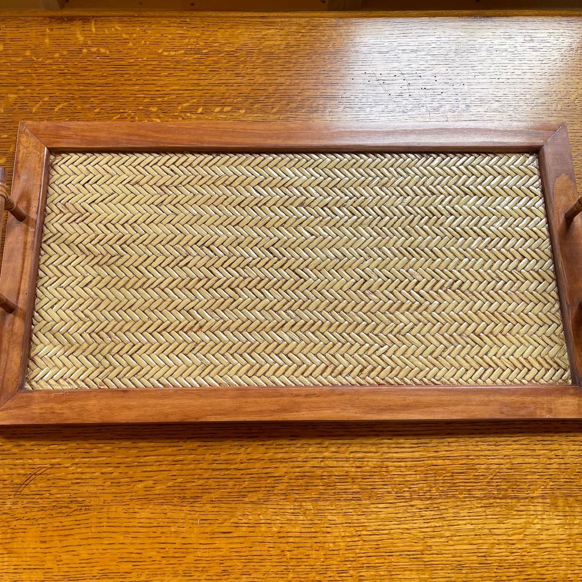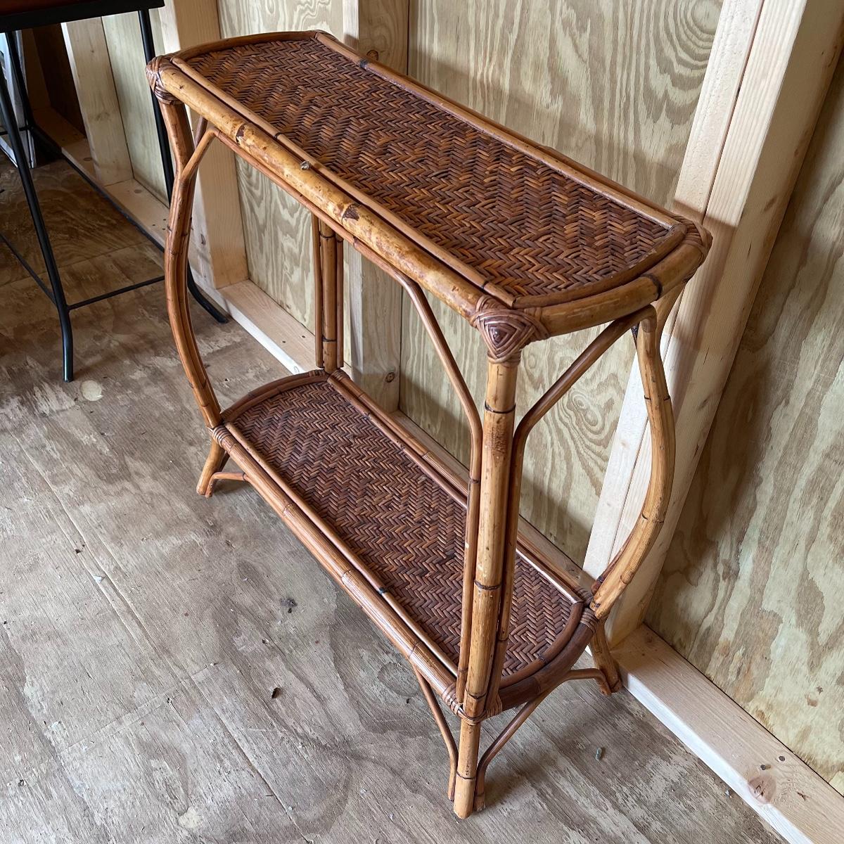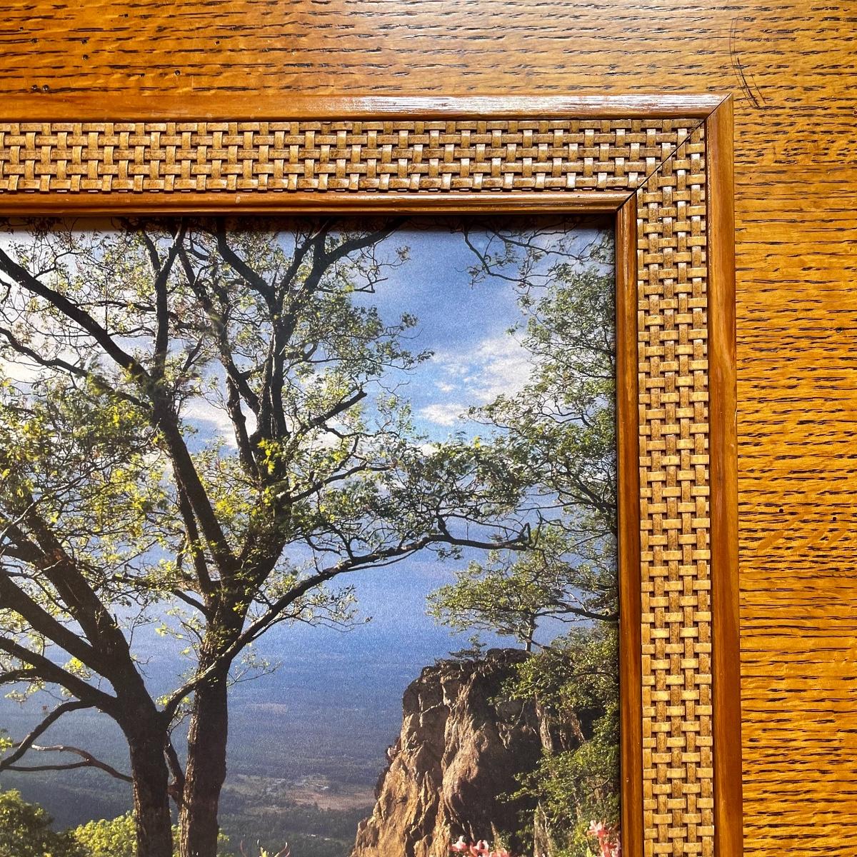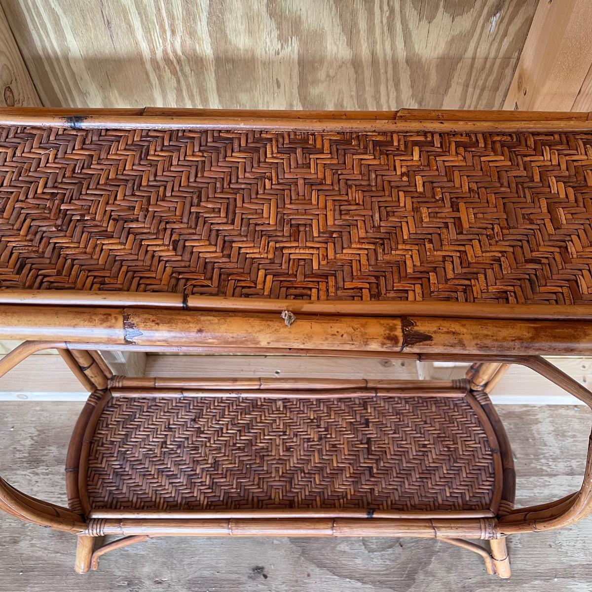 These rattan items include a table, nesting trysts, and art. The artworks in this lot have rattan frames and the nature imagery is of a waterfall and a view from the mountains. They are 14.5” x 18.5”. The nesting tables are a set of three with wooden borders and handles and a rattan surface. Lastly, the slender rattan table in this lot measures 29” x 12.5” x 30.5” at its widest points.