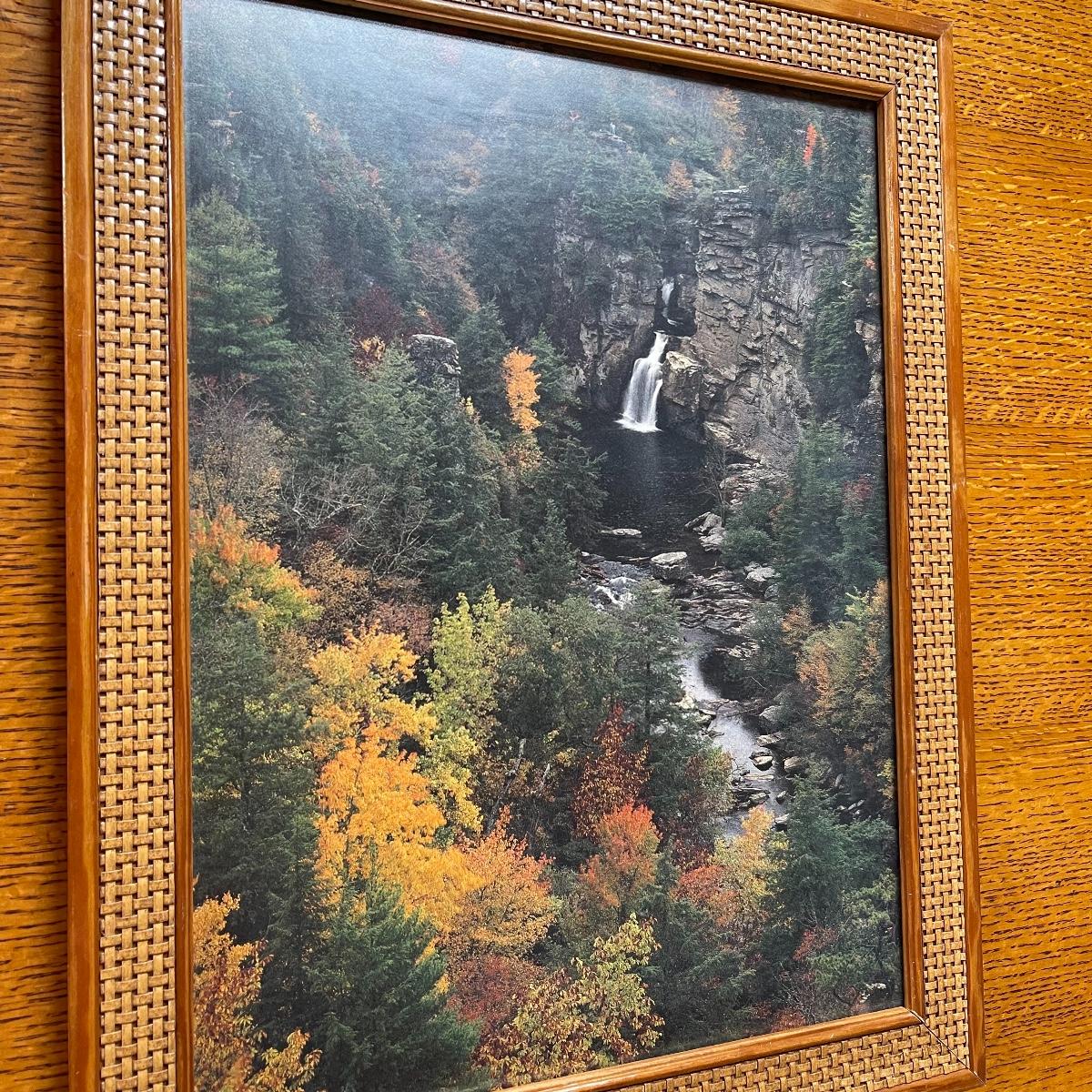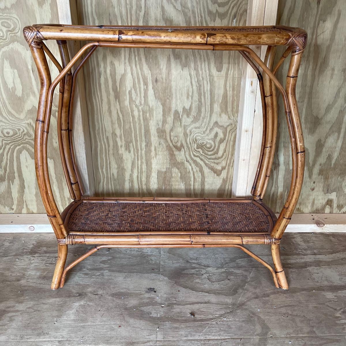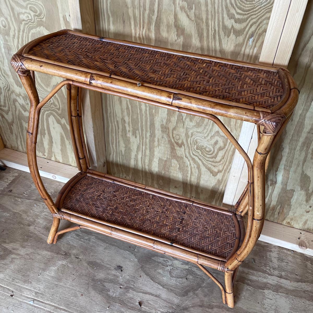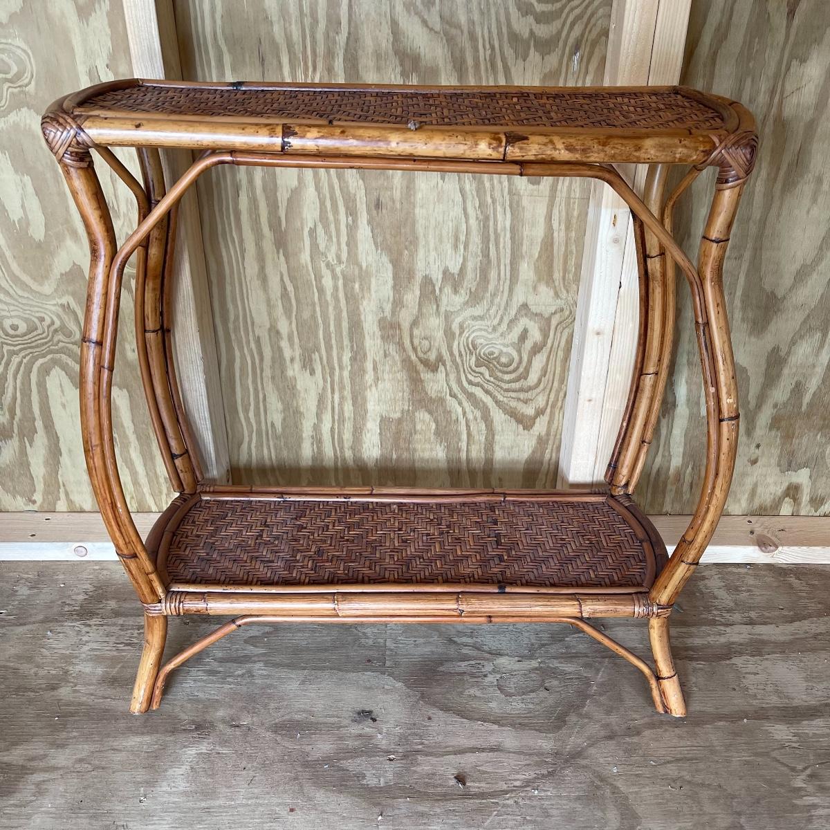 These rattan items include a table, nesting trysts, and art. The artworks in this lot have rattan frames and the nature imagery is of a waterfall and a view from the mountains. They are 14.5” x 18.5”. The nesting tables are a set of three with wooden borders and handles and a rattan surface. Lastly, the slender rattan table in this lot measures 29” x 12.5” x 30.5” at its widest points.
