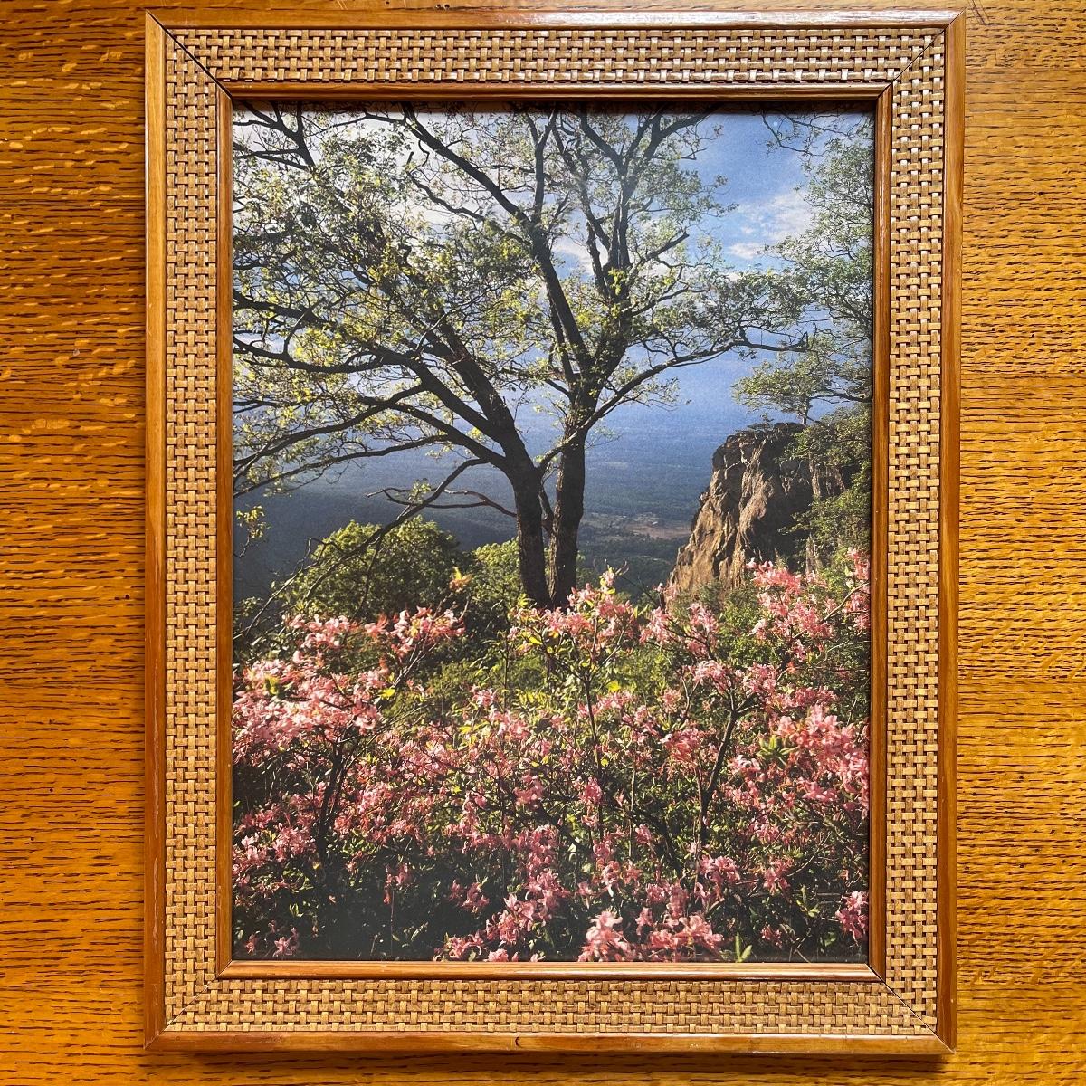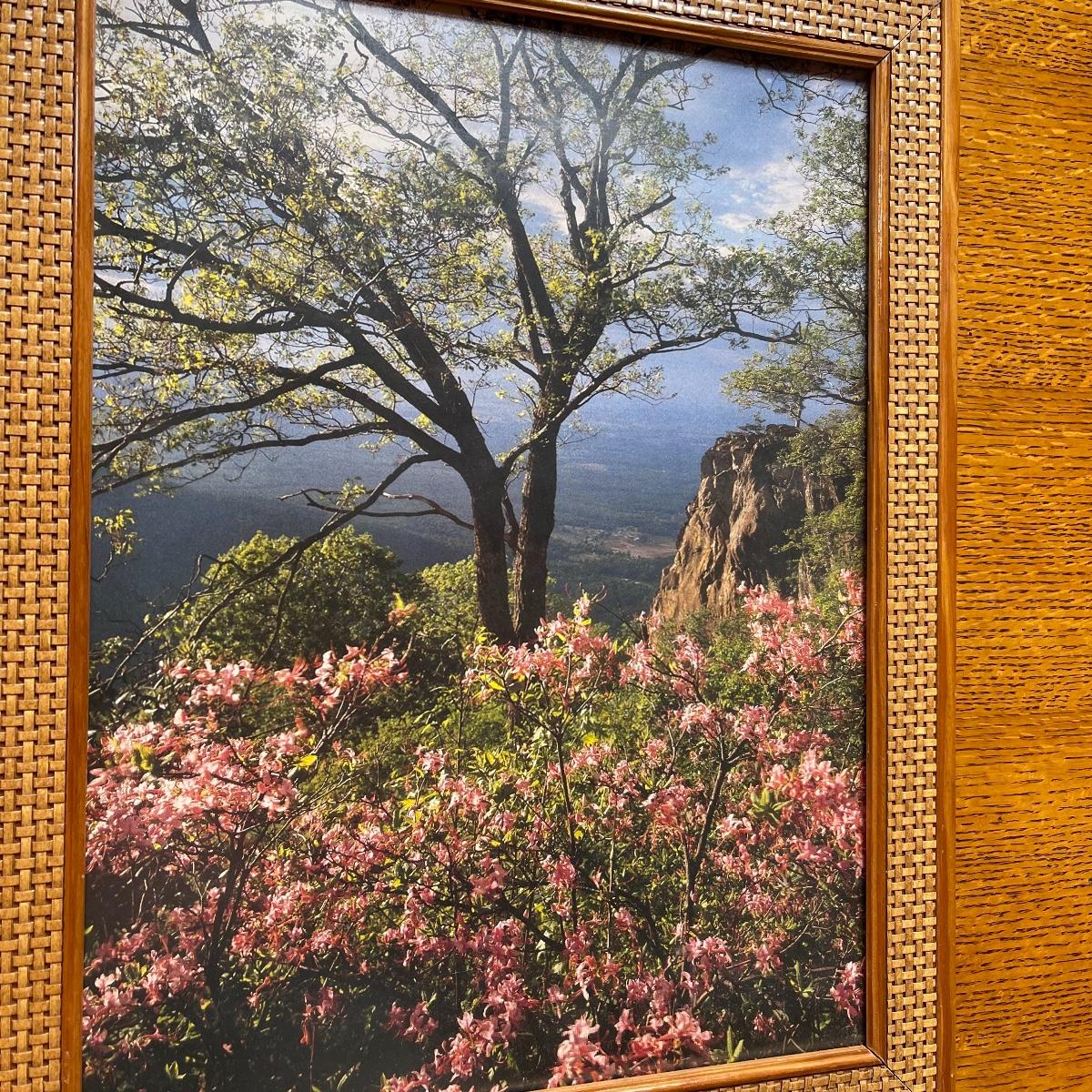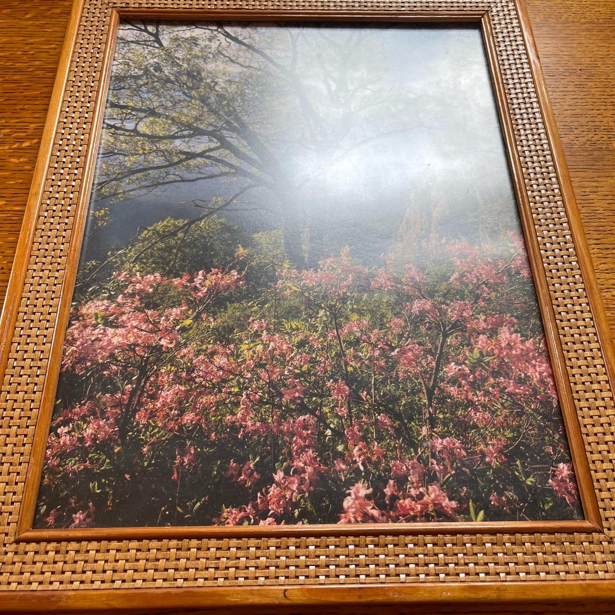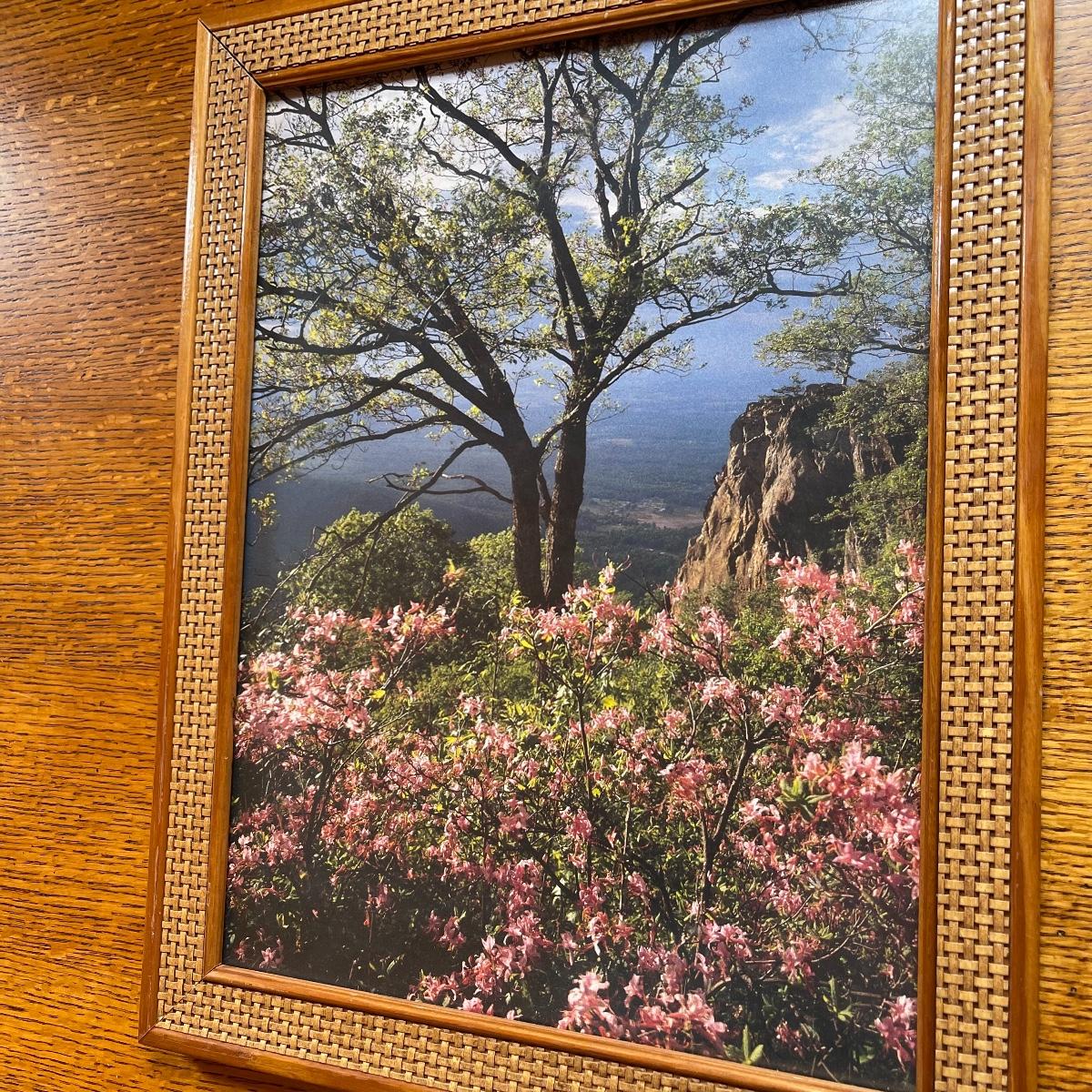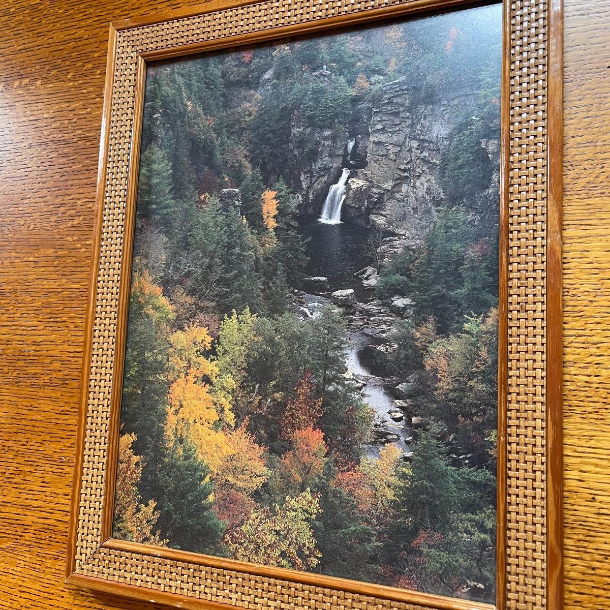 These rattan items include a table, nesting trysts, and art. The artworks in this lot have rattan frames and the nature imagery is of a waterfall and a view from the mountains. They are 14.5” x 18.5”. The nesting tables are a set of three with wooden borders and handles and a rattan surface. Lastly, the slender rattan table in this lot measures 29” x 12.5” x 30.5” at its widest points.