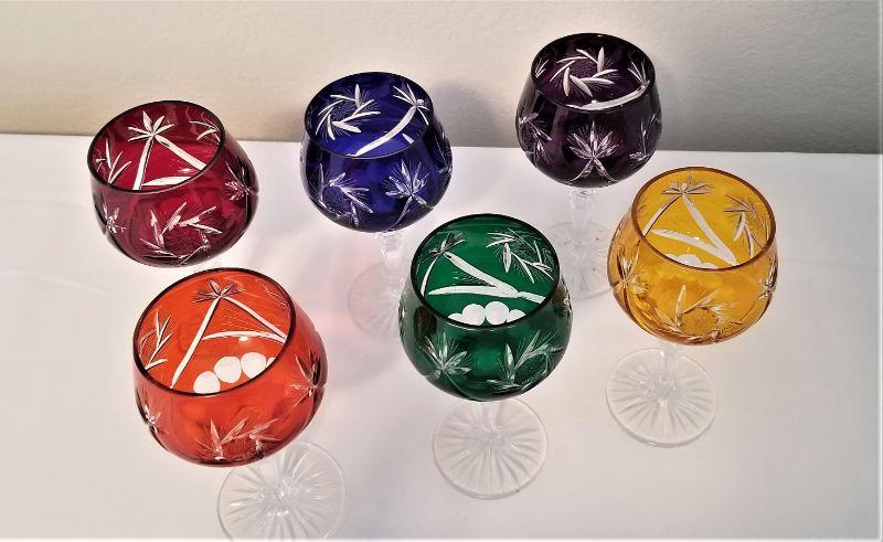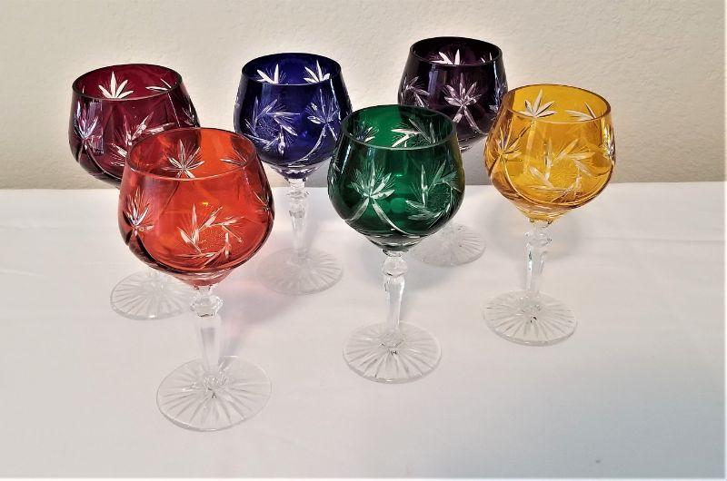 Nice set of 6 "cut to clear" goblets, each one a different color. Good condition, each stands 7" tall. No chips.