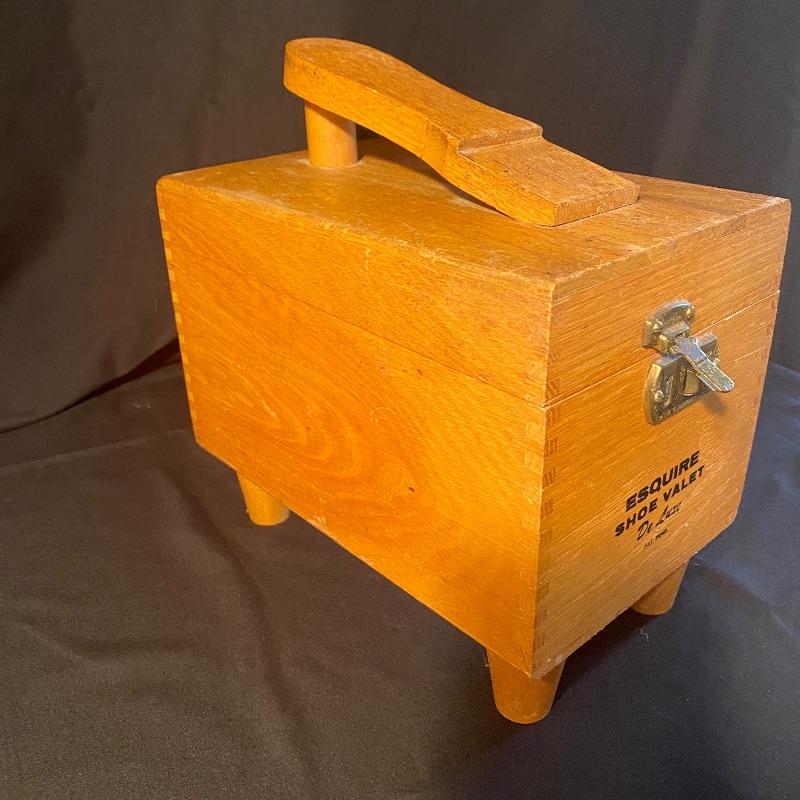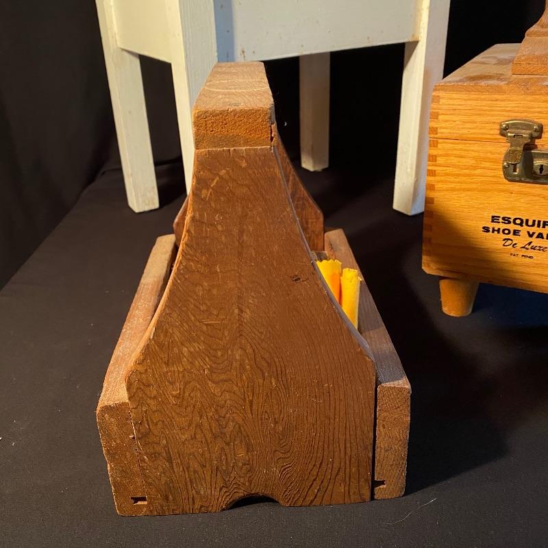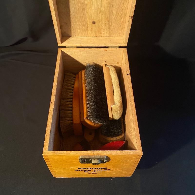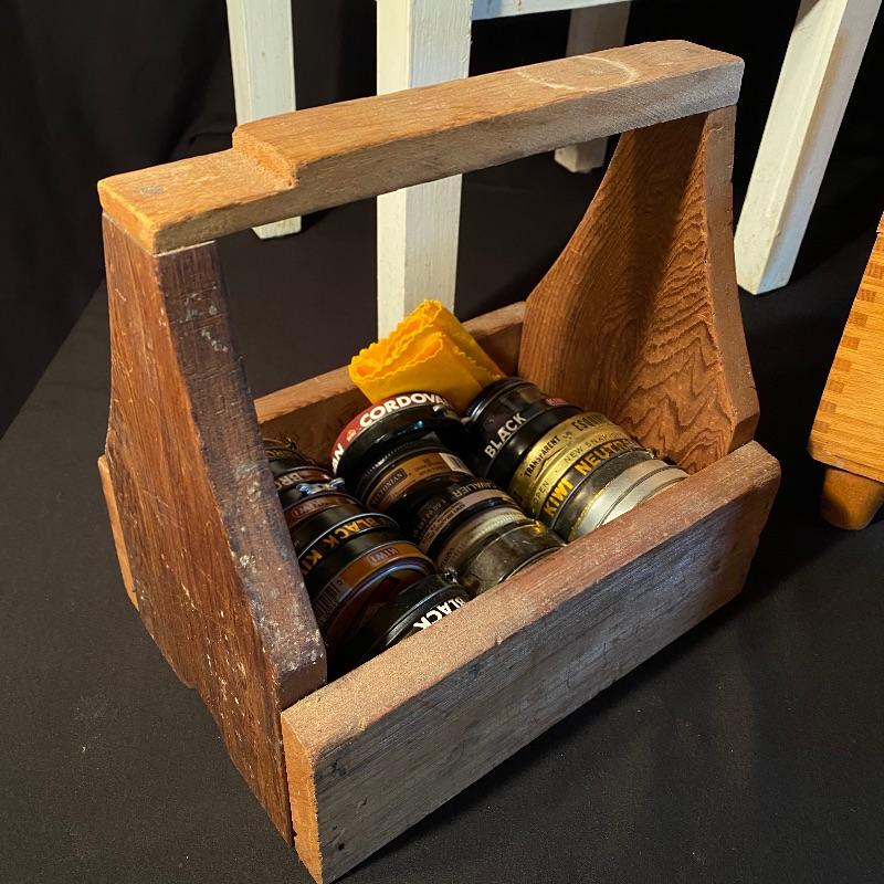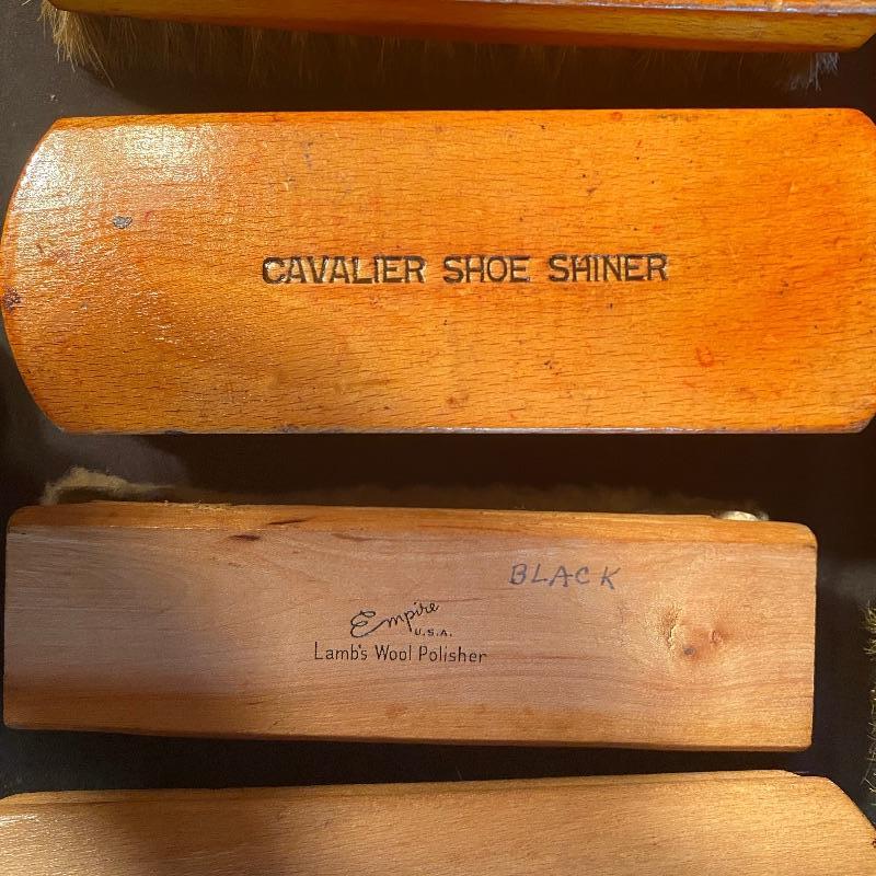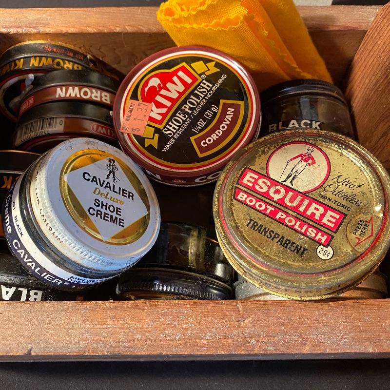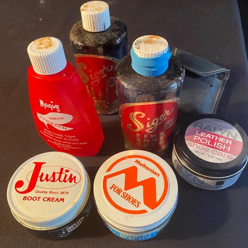 Three fun shoe shine kits will keep your shoes lasting a long time! There is a great white stand that open to an iron shoe that says “Queen”. Plenty of storage inside and can close and be used as a stool when not in use. Measures 14” x 11” x15”h. Next is an Esquire Shoe Valet De Lux with a brass lock on front. This one has tons of brushes in every size. Two by Cavalier, a red Shinol’A, a Vistron Oxco wire brush, and a Lambs wool polisher by Empire. Also find a small satchel with a brush and sponge. Lastly there is a wooden caddy that has all the polish you need. There are some vintage shoe care chemical tins and bottles that we’ve included. We can not verify the contents of these! No shipping.