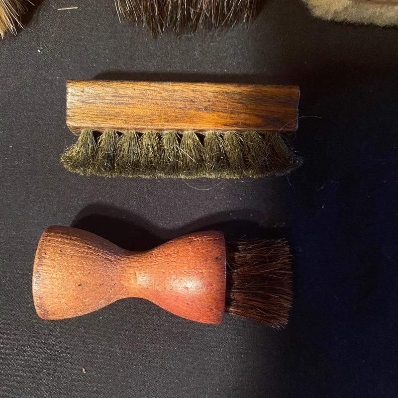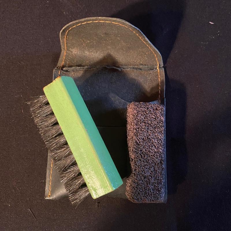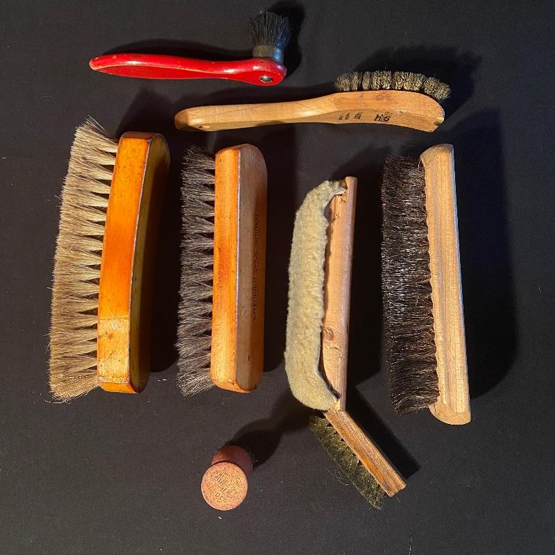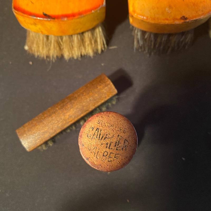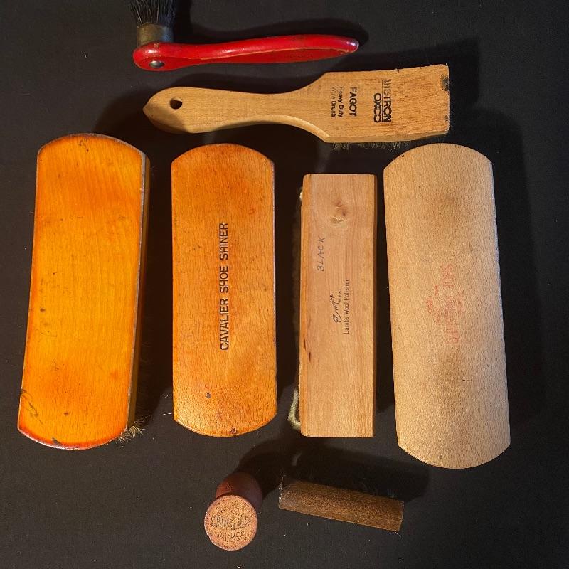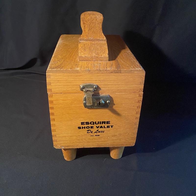 Three fun shoe shine kits will keep your shoes lasting a long time! There is a great white stand that open to an iron shoe that says “Queen”. Plenty of storage inside and can close and be used as a stool when not in use. Measures 14” x 11” x15”h. Next is an Esquire Shoe Valet De Lux with a brass lock on front. This one has tons of brushes in every size. Two by Cavalier, a red Shinol’A, a Vistron Oxco wire brush, and a Lambs wool polisher by Empire. Also find a small satchel with a brush and sponge. Lastly there is a wooden caddy that has all the polish you need. There are some vintage shoe care chemical tins and bottles that we’ve included. We can not verify the contents of these! No shipping.