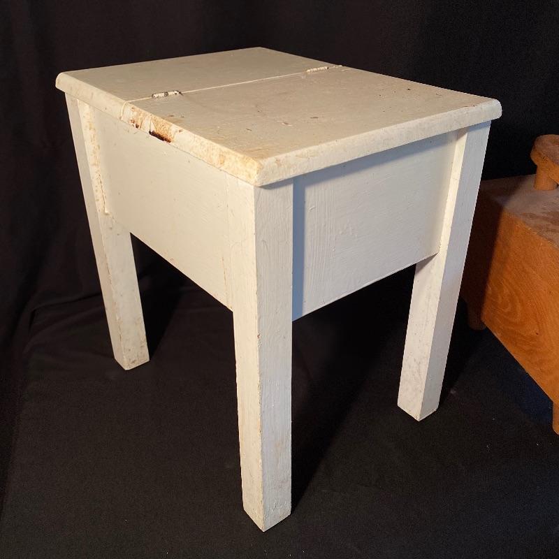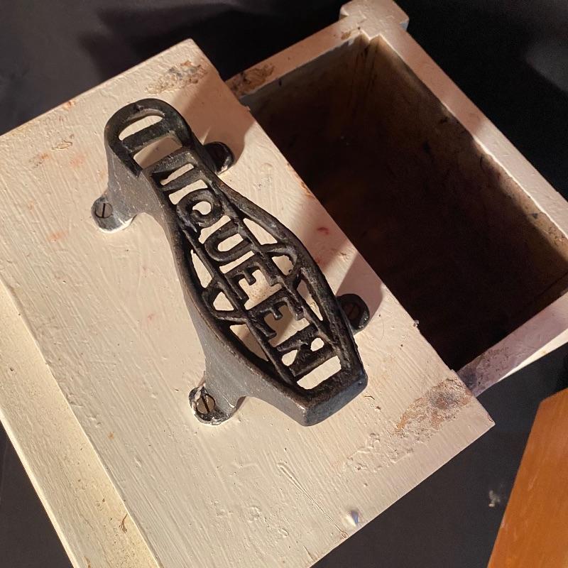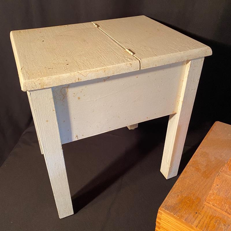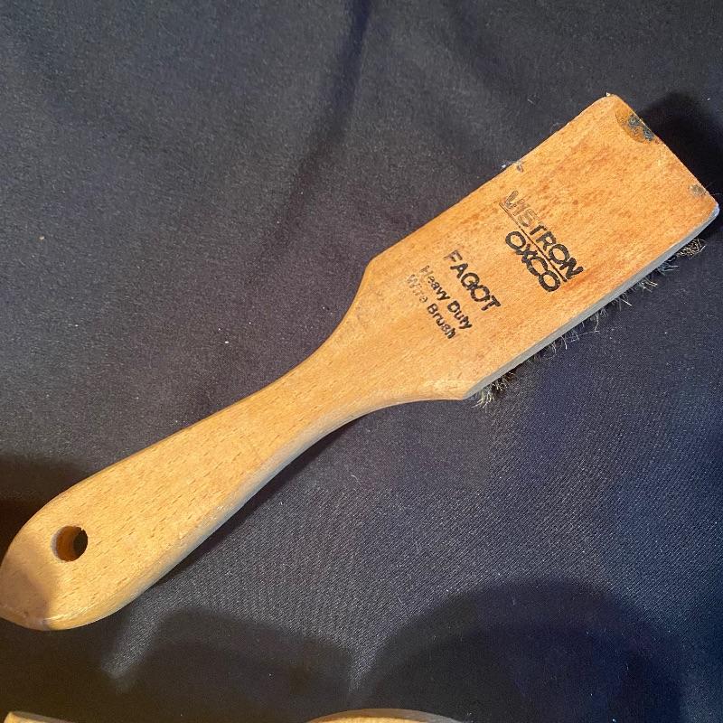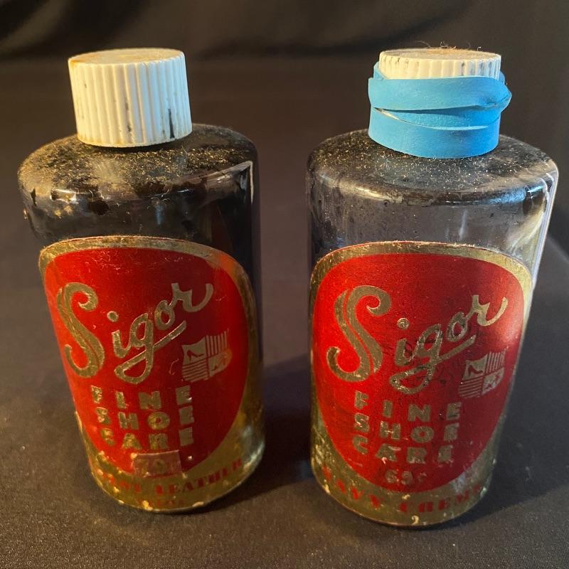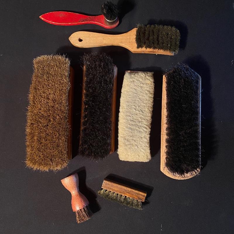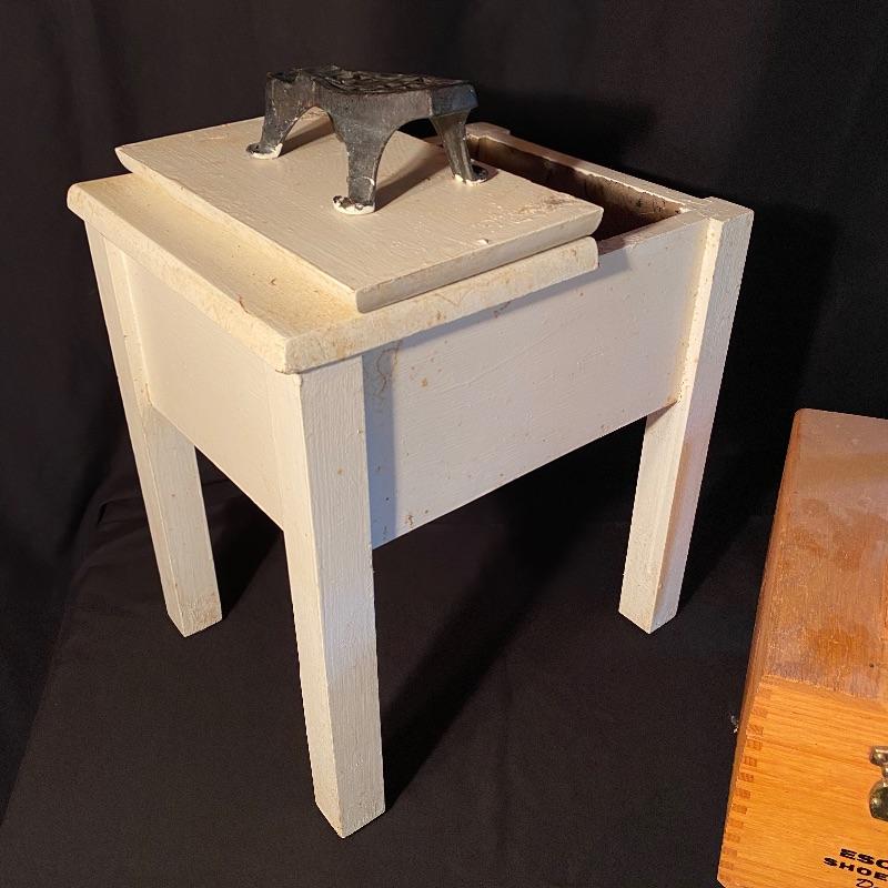 Three fun shoe shine kits will keep your shoes lasting a long time! There is a great white stand that open to an iron shoe that says “Queen”. Plenty of storage inside and can close and be used as a stool when not in use. Measures 14” x 11” x15”h. Next is an Esquire Shoe Valet De Lux with a brass lock on front. This one has tons of brushes in every size. Two by Cavalier, a red Shinol’A, a Vistron Oxco wire brush, and a Lambs wool polisher by Empire. Also find a small satchel with a brush and sponge. Lastly there is a wooden caddy that has all the polish you need. There are some vintage shoe care chemical tins and bottles that we’ve included. We can not verify the contents of these! No shipping.