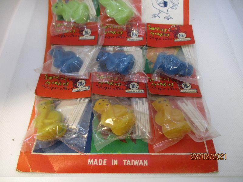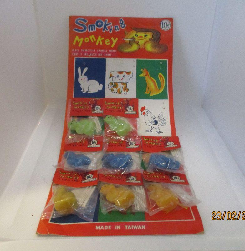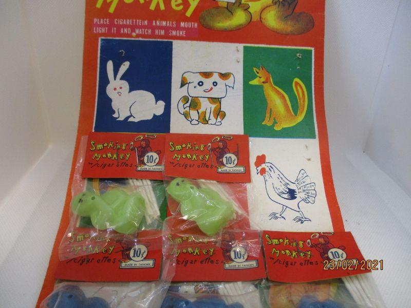 There are 8 monkies on this display and all are unopened. They contain their little cigarettes that you place in the monkey's mouth and then light.