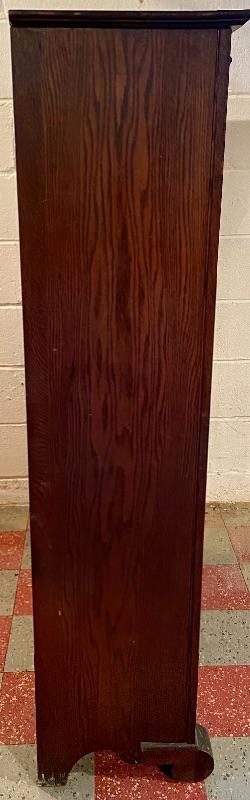 Oak stained glass book shelf with interior secretary storage 42Lx15Wx59H. Tiny crack in upper left hand glass door, please see the close up picture. Please see all pictures for condition of the item. You will need to bring someone to help move. MHW Please see all pictures for content of the lot, condition of the lot, and measurements if taken. Pictures are the best representation of the items listed and items are untested unless indicated in description. Thank you for looking and have fun bidding!