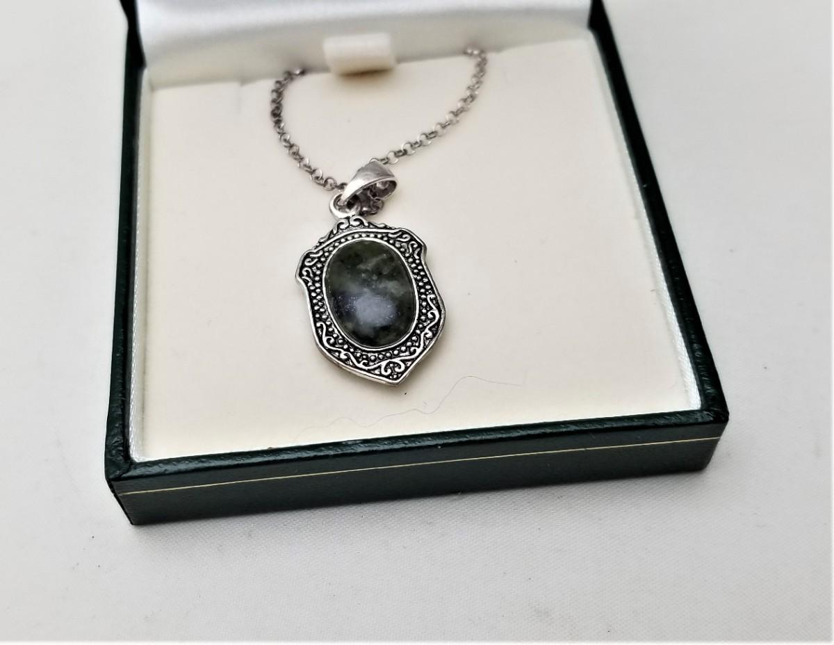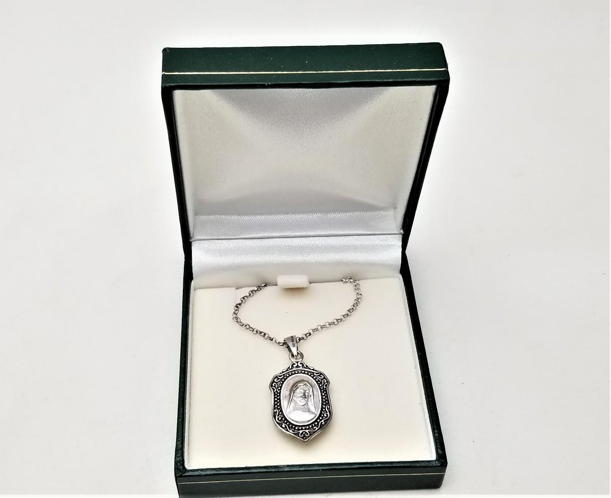A souvenir from a trip to Ireland - Sterling medal on sterling chain - chain about 13" long - Madonna medal with moss green cabochon stone on reverse. Original box has a shamrock on the top. Good condition.