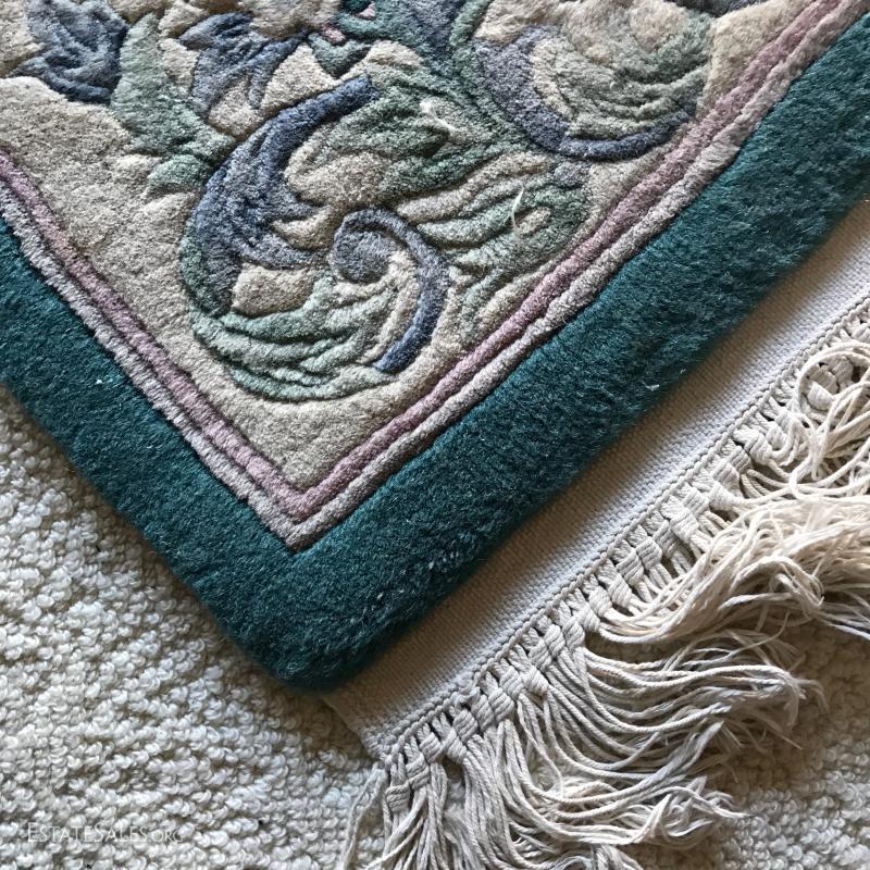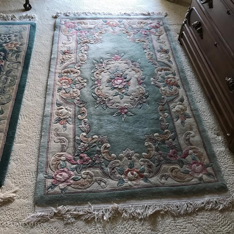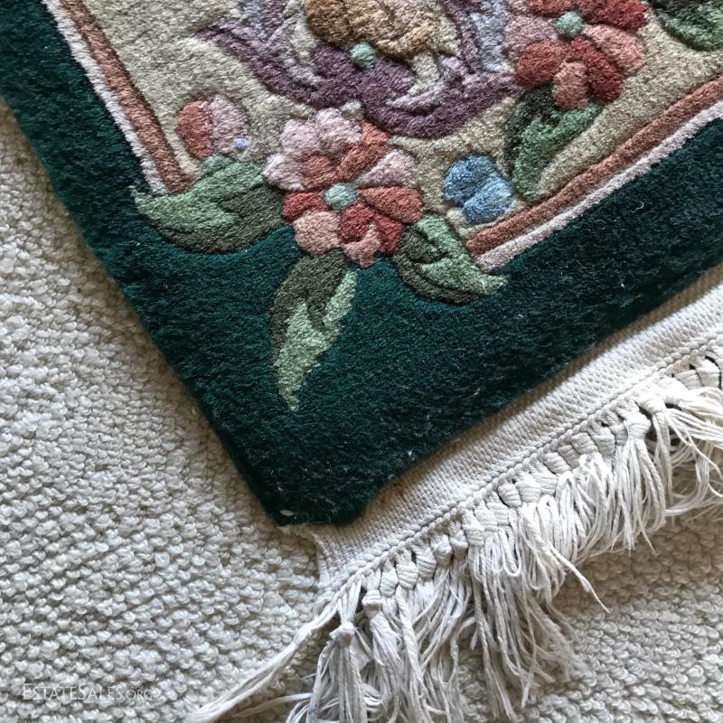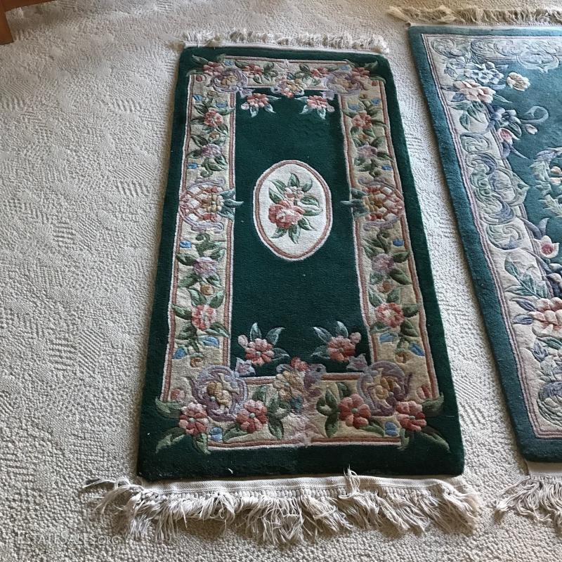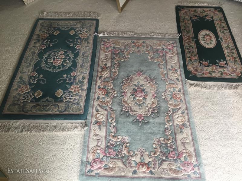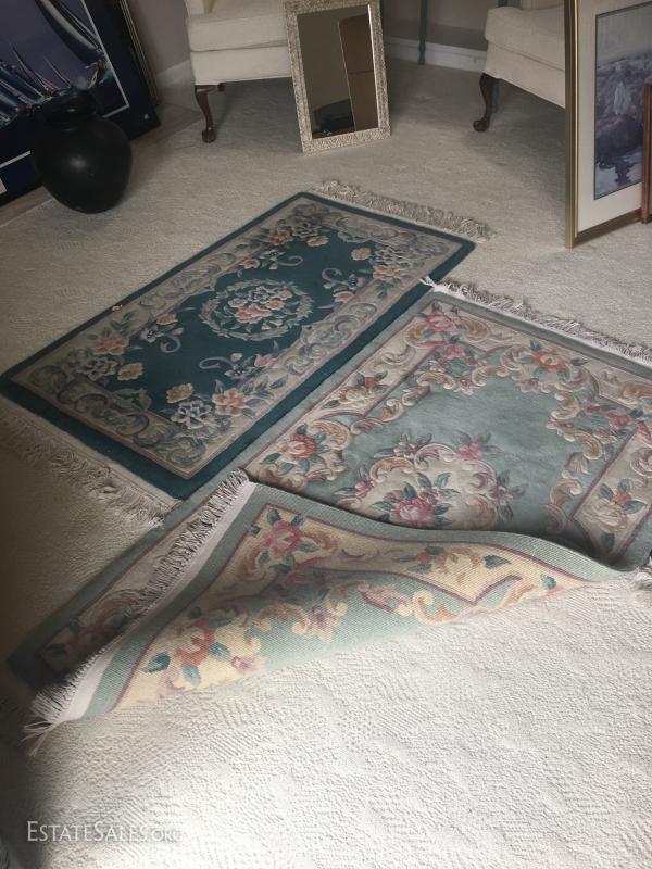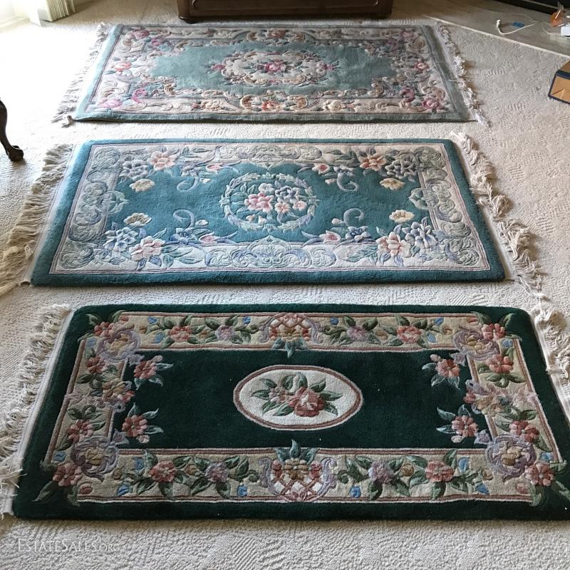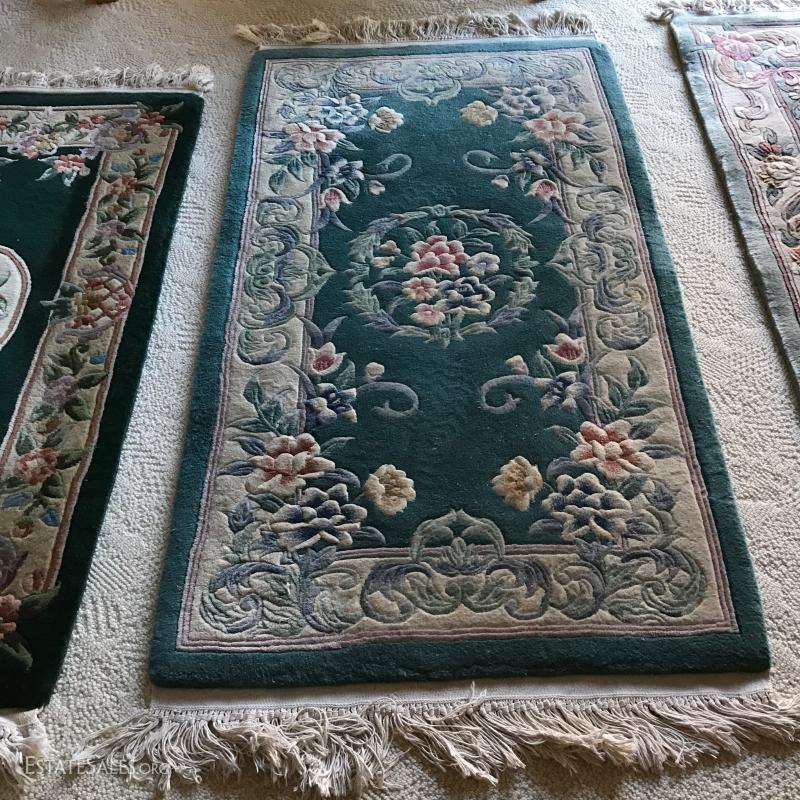 Three rugs with varying shades of green. All different sizes. No Stains. Colors may not convey in photos.