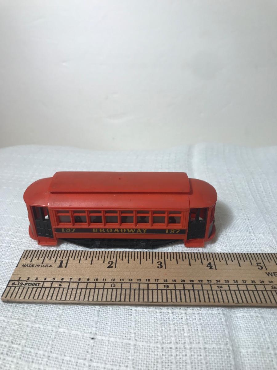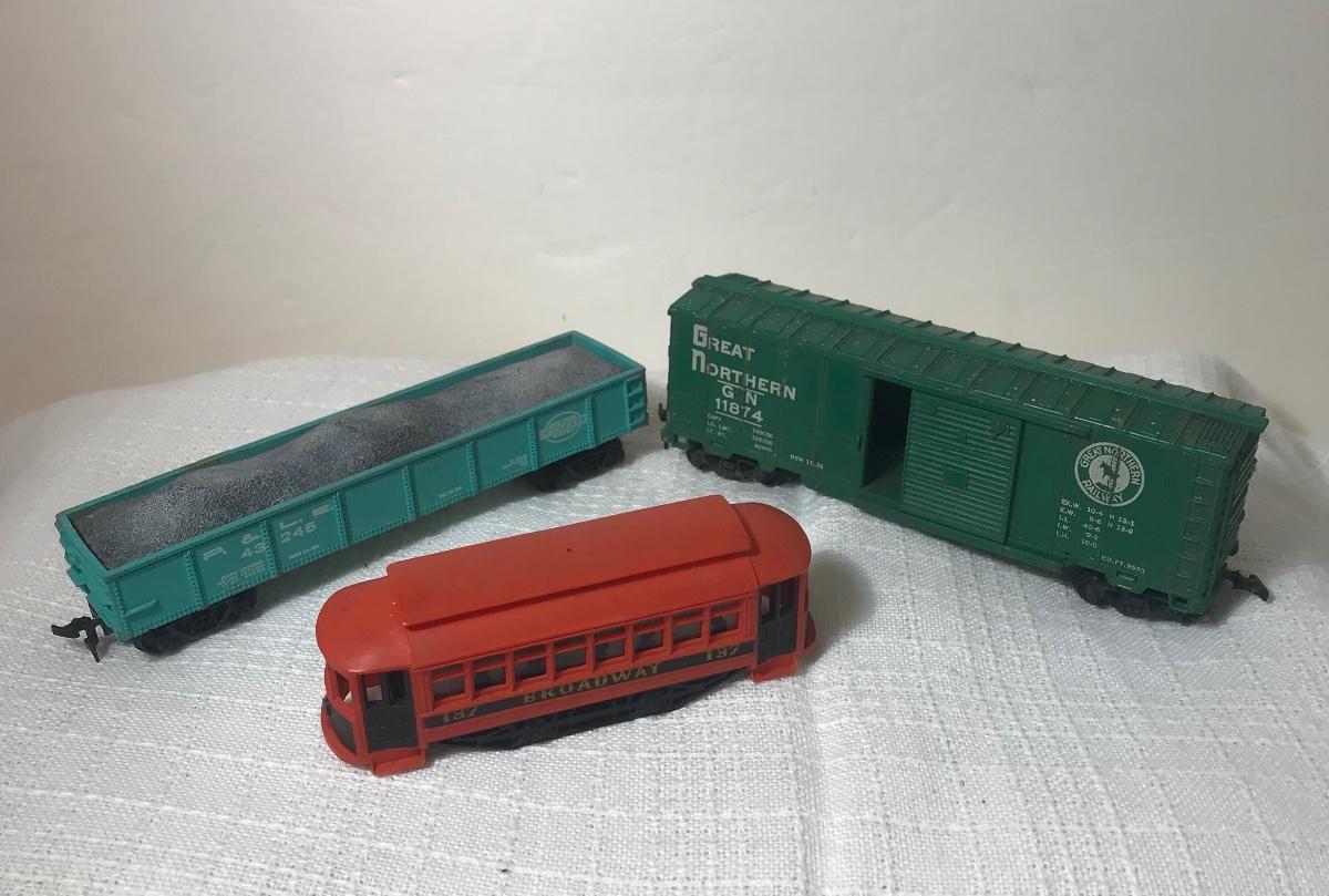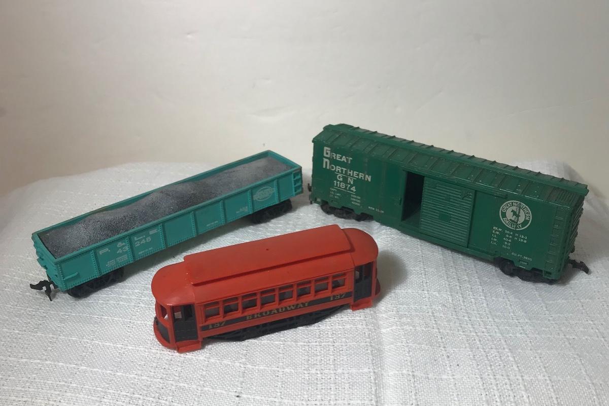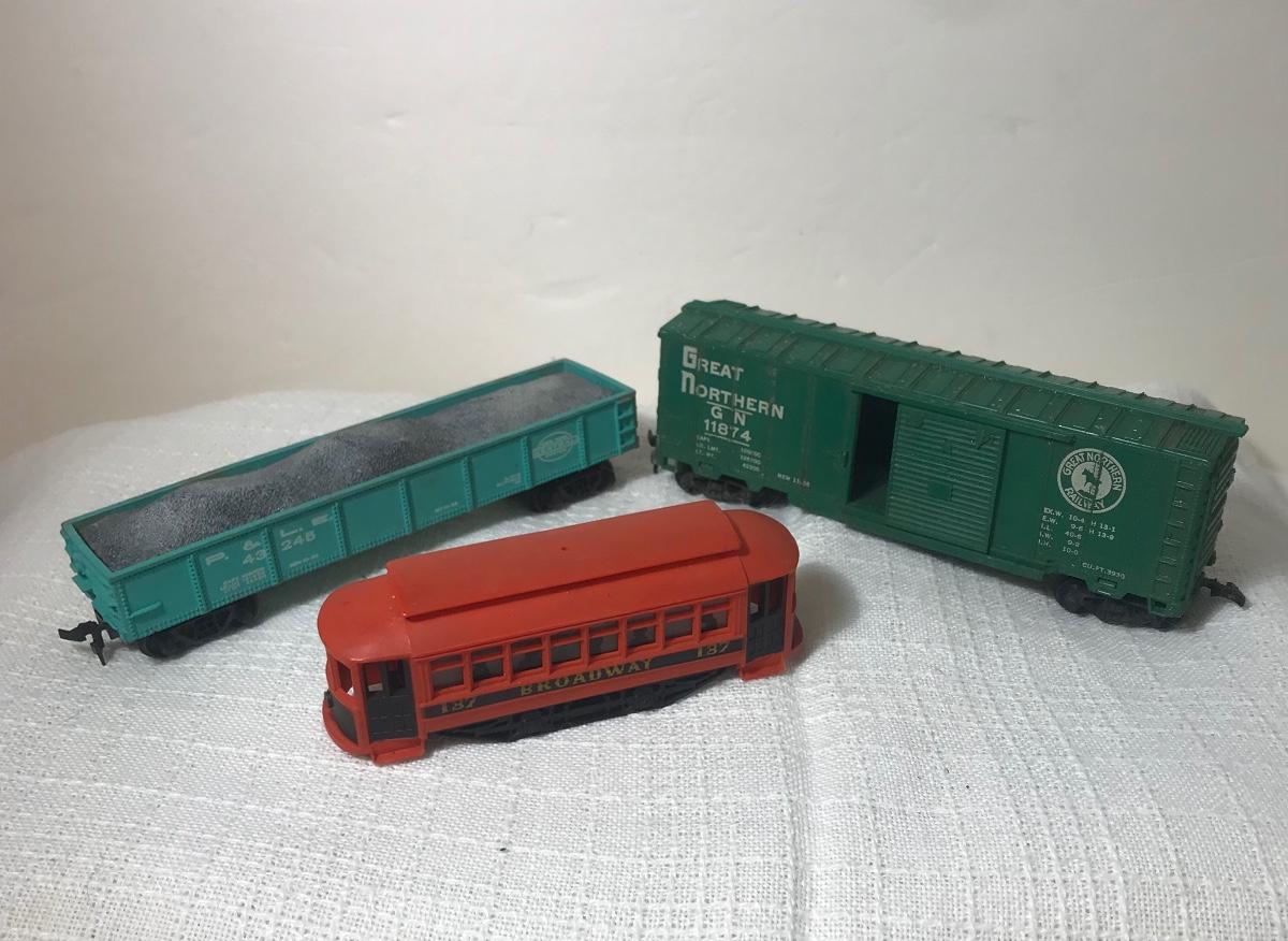 Two Vintage HO Train Cars & Trolley. Please see all pictures as they are the best representation of the items. The pictures show condition, measurements if taken, and what is included in the lot. Due to the large amount that we photograph and the time frame, we are not always able to take measurements. All items unless noted, are pre-owned and have been used, and are untested. Thank you.