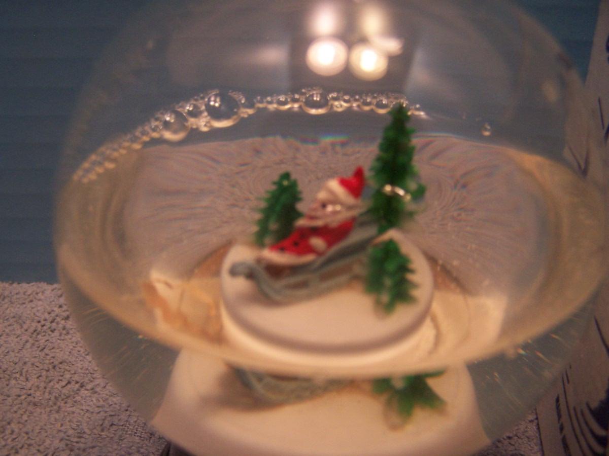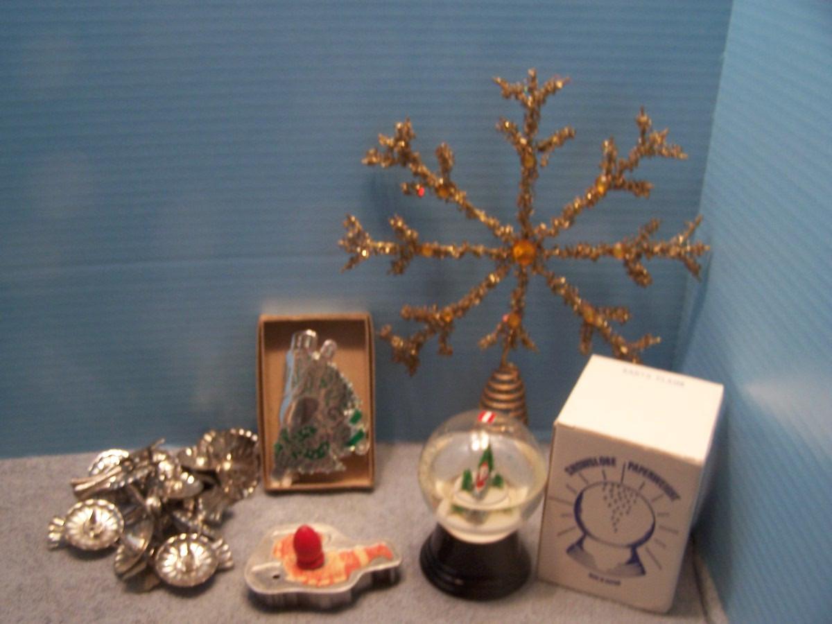 WONDERFUL OLD CHRISTMAS DECOR TREE TOPPER SNOW GLOBE TIN CLIP CANDLE HOLDERS... TOPPER IS 11 3/4'' TALL.
