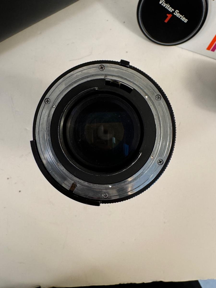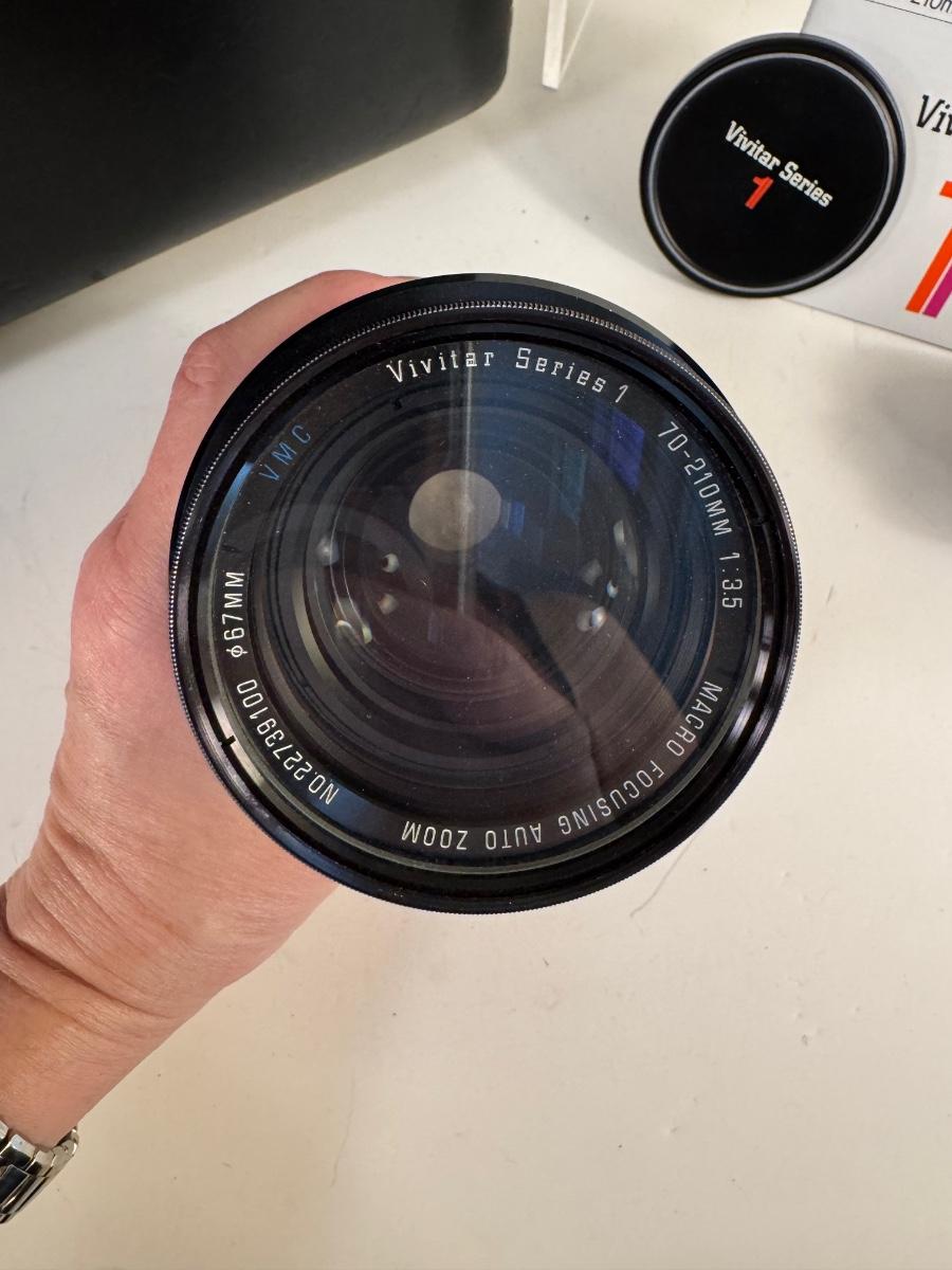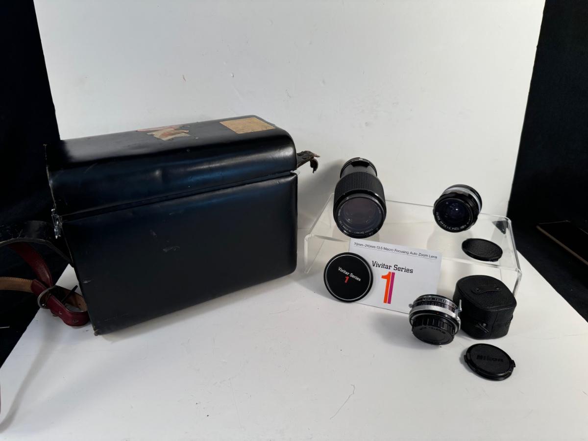 Includes a locking lens bag, Vivitar Series 1 70MM - 210mm lens, Nikon 52mm L39, Samigon NT Auto Teleplus 2X. Strap is broken on lens bag.