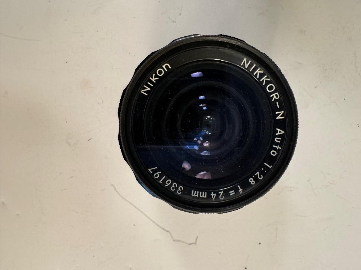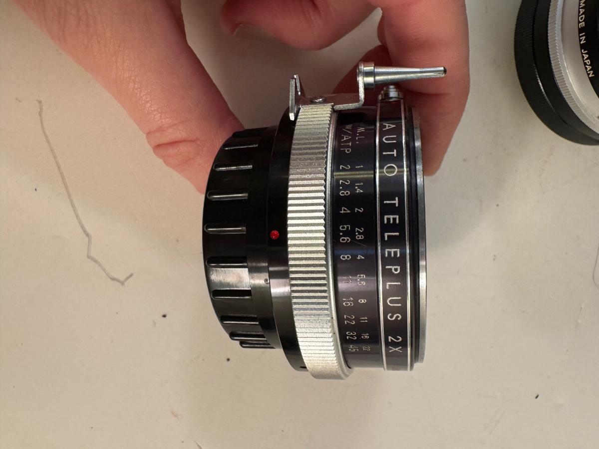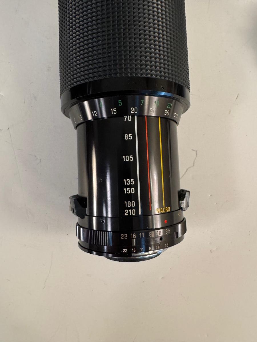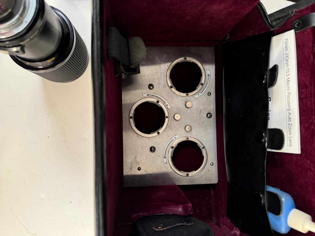 Includes a locking lens bag, Vivitar Series 1 70MM - 210mm lens, Nikon 52mm L39, Samigon NT Auto Teleplus 2X. Strap is broken on lens bag.