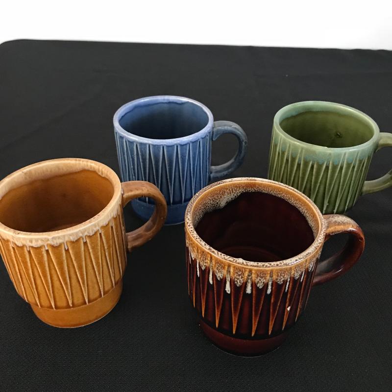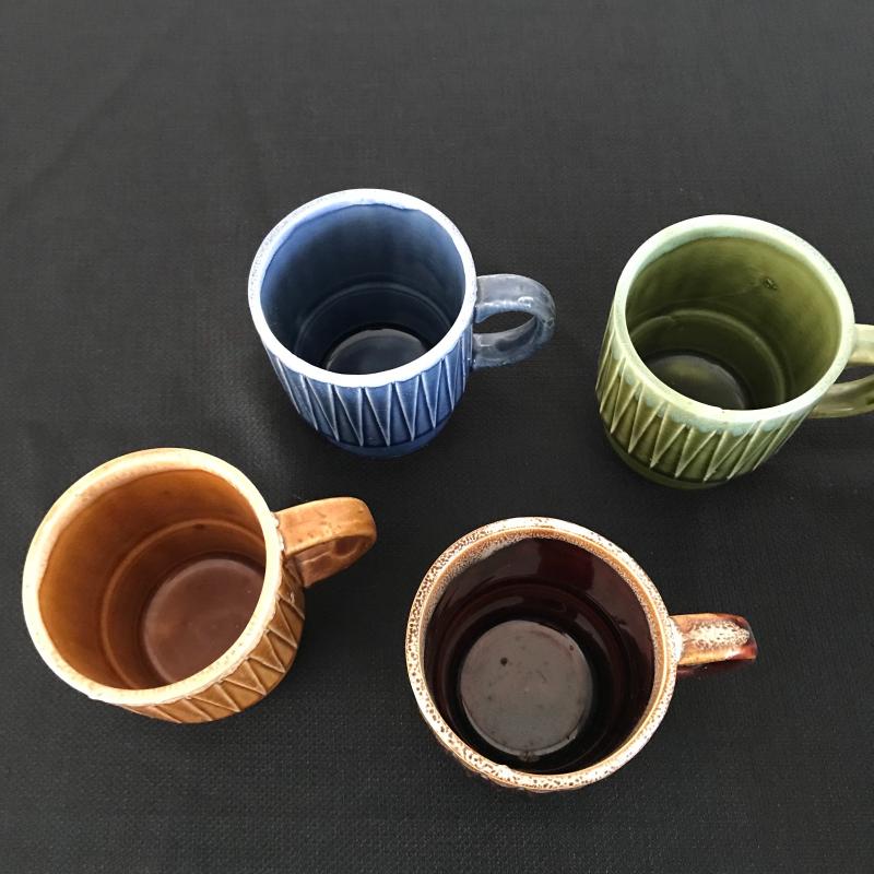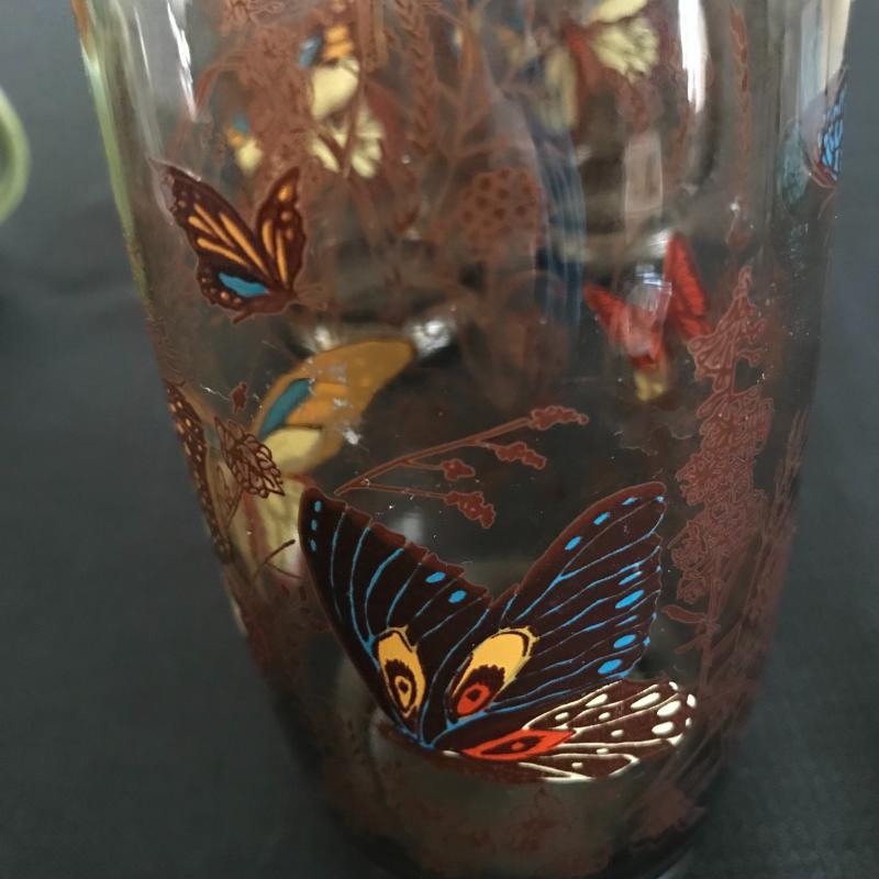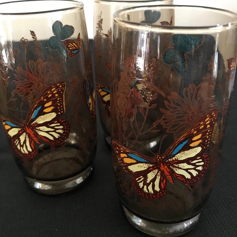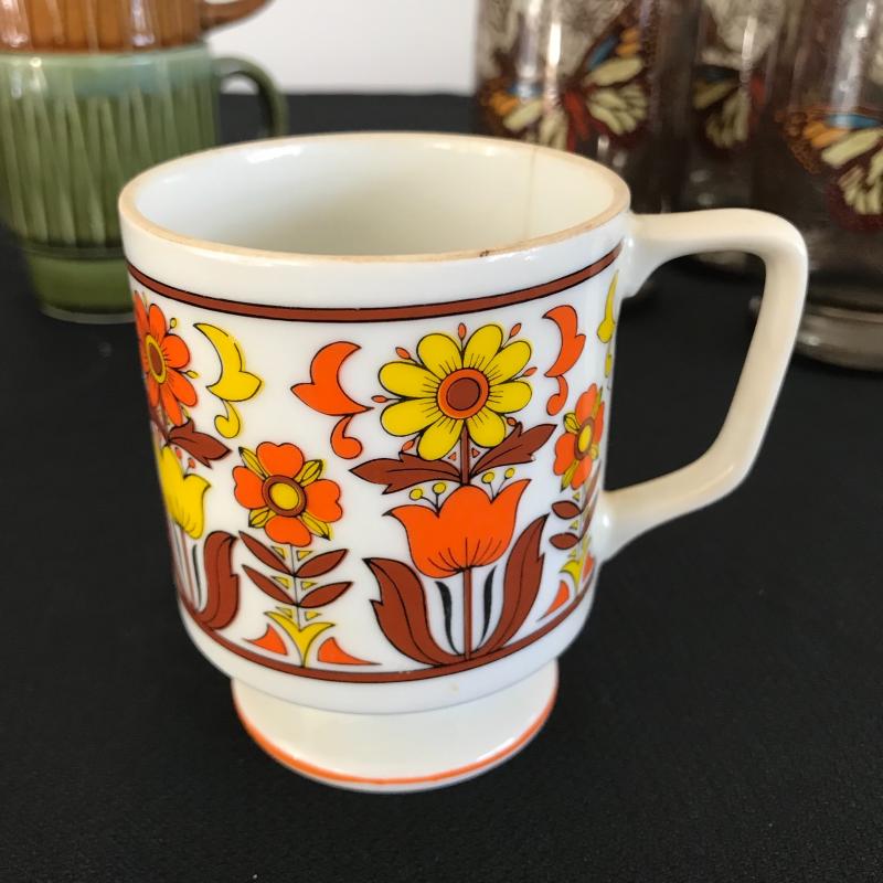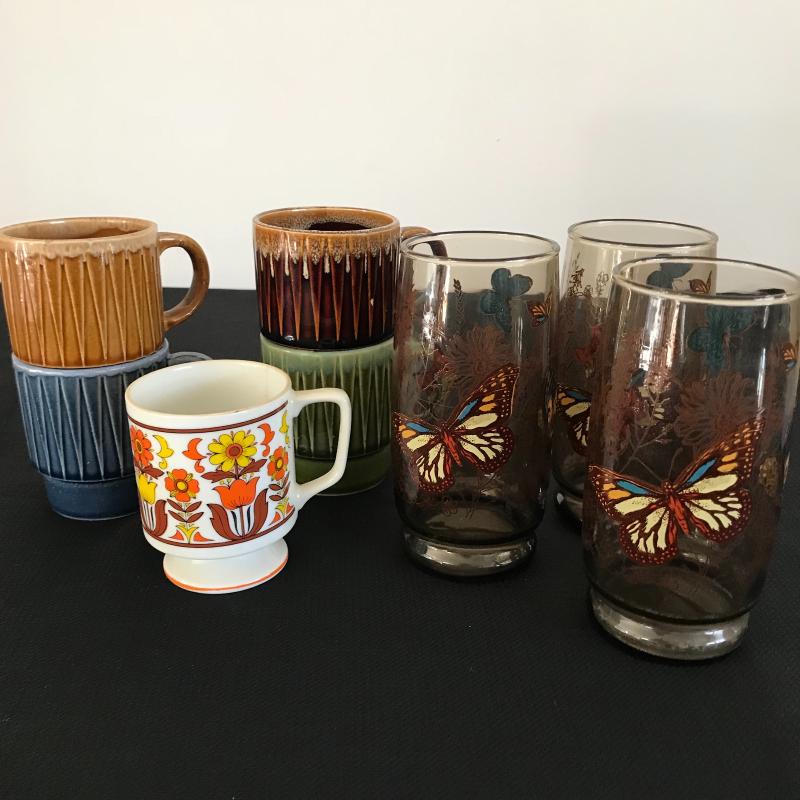 Sweet set of four retro coffee mugs, one floral coffee mug (cracked but still in tact), and three butterfly drinking glasses. Shipping available or local pickup in Asheville, NC.