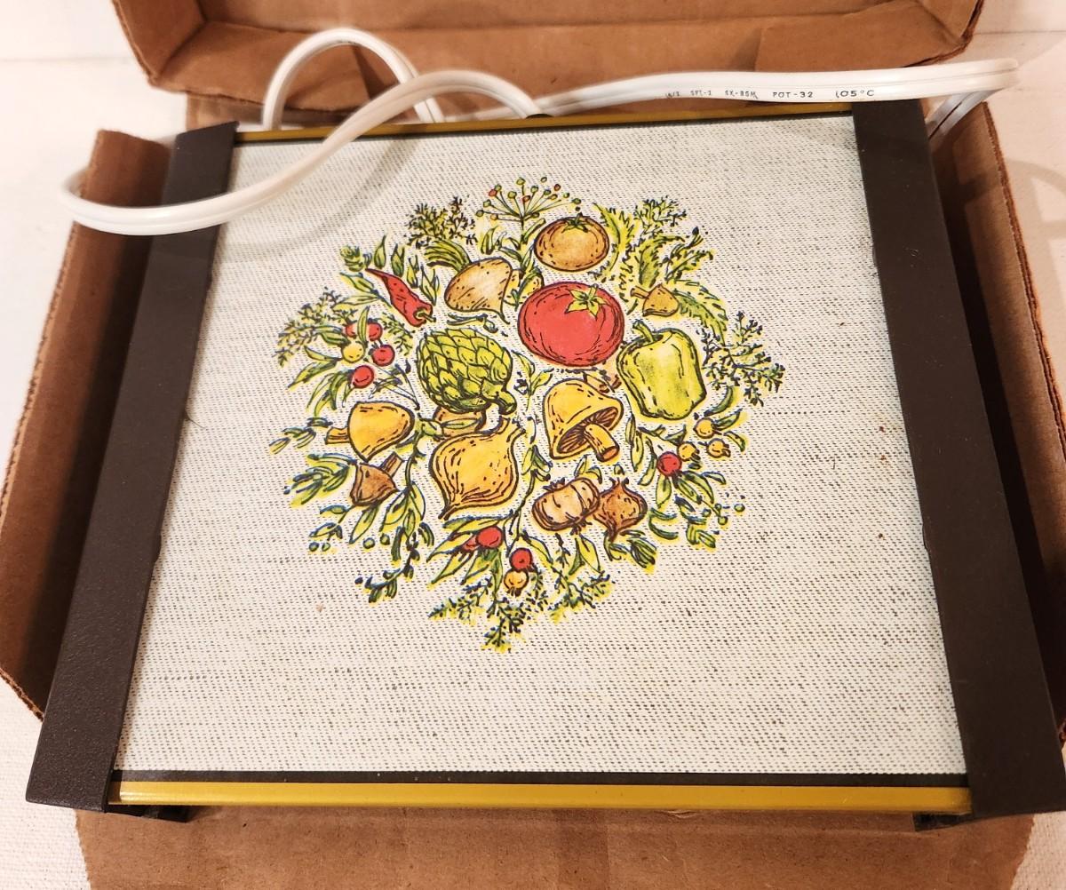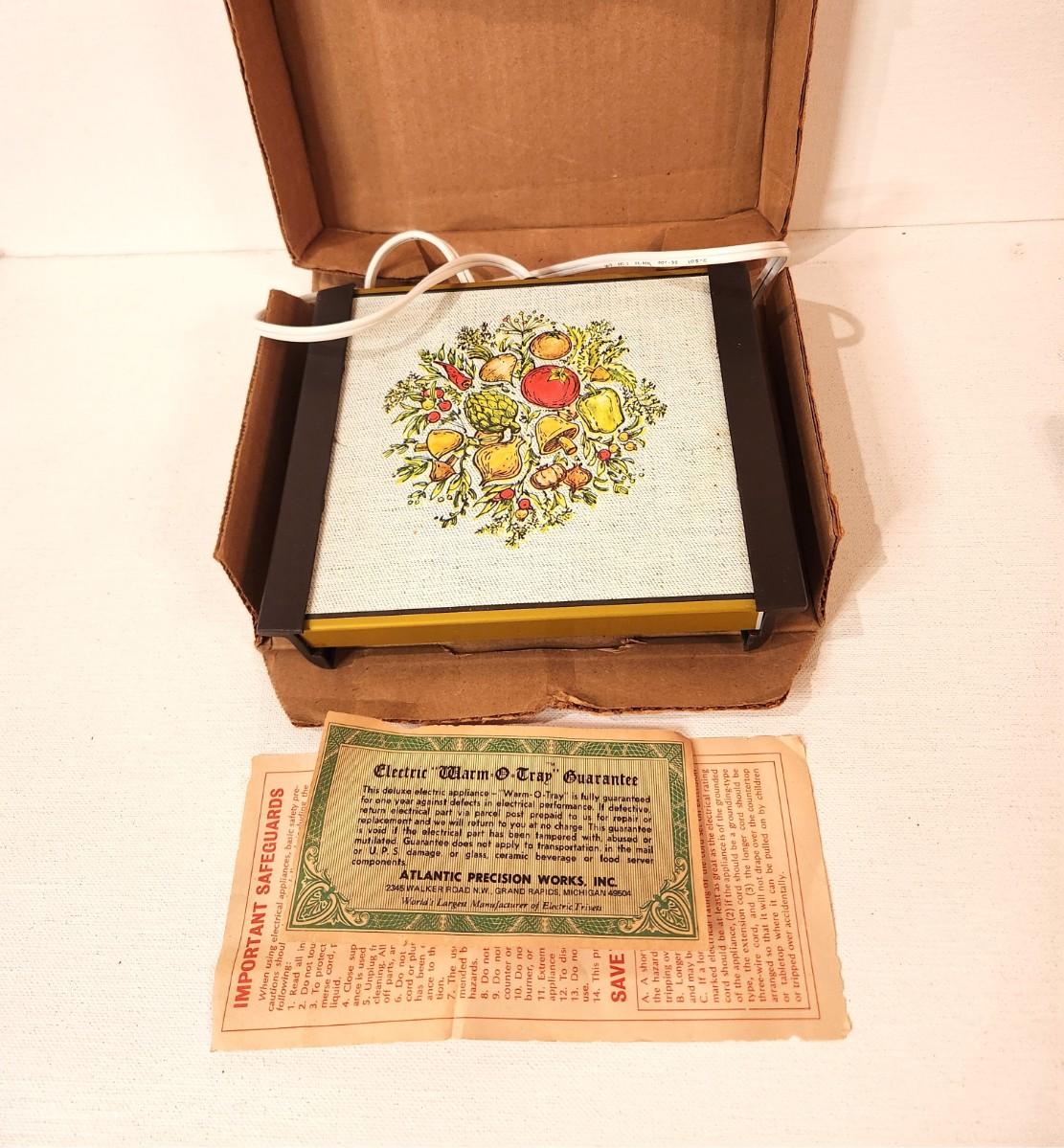 An old wedding gift that was never used! 1970's Mushroom-themed hot/warming plate 7" x 8" - from Atlantic Precision Works - original box and inserts.