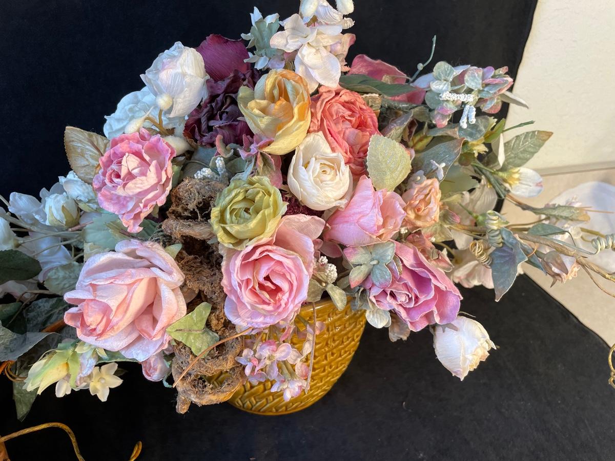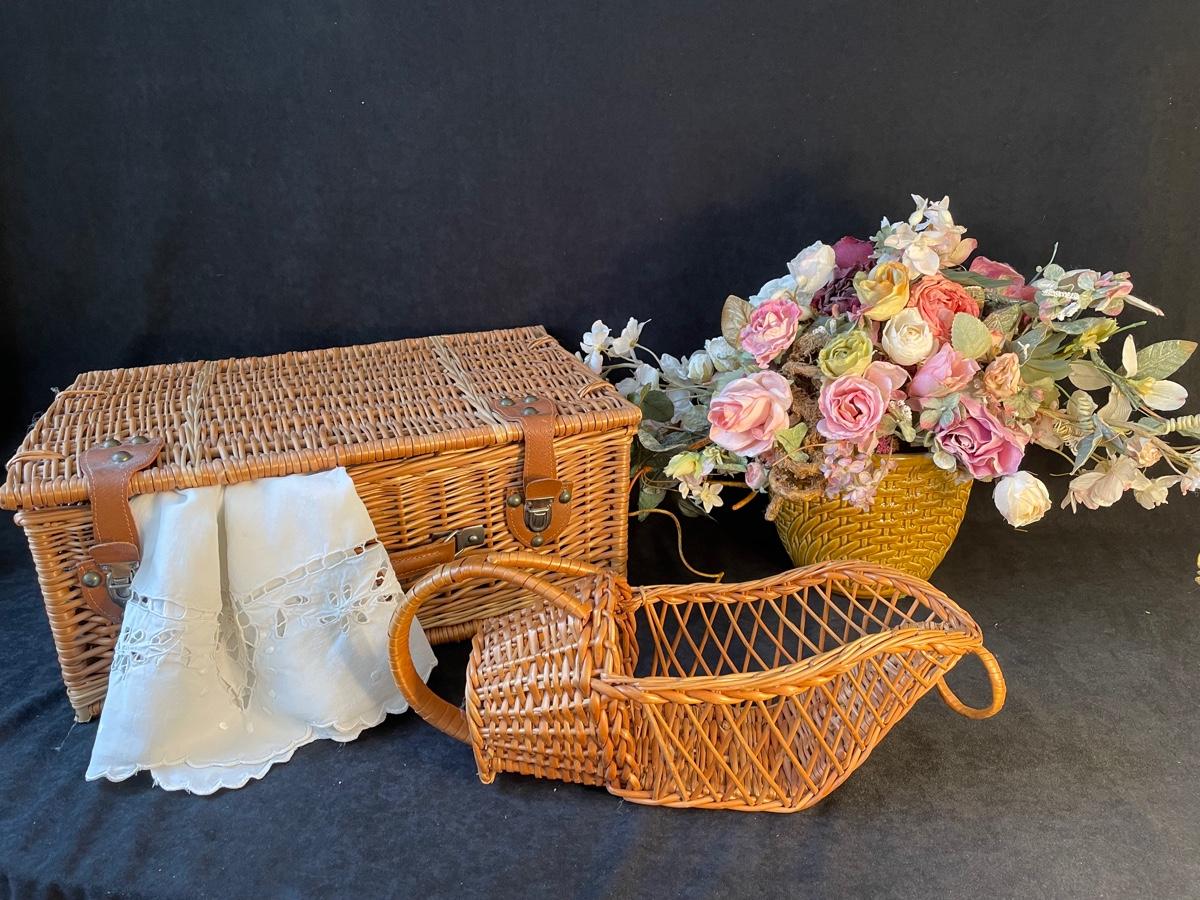 Wicker picnic basket, wine bottle holder and silk floral arrangement